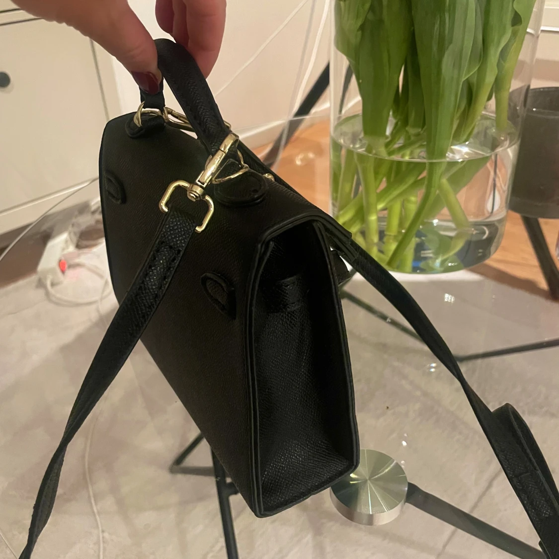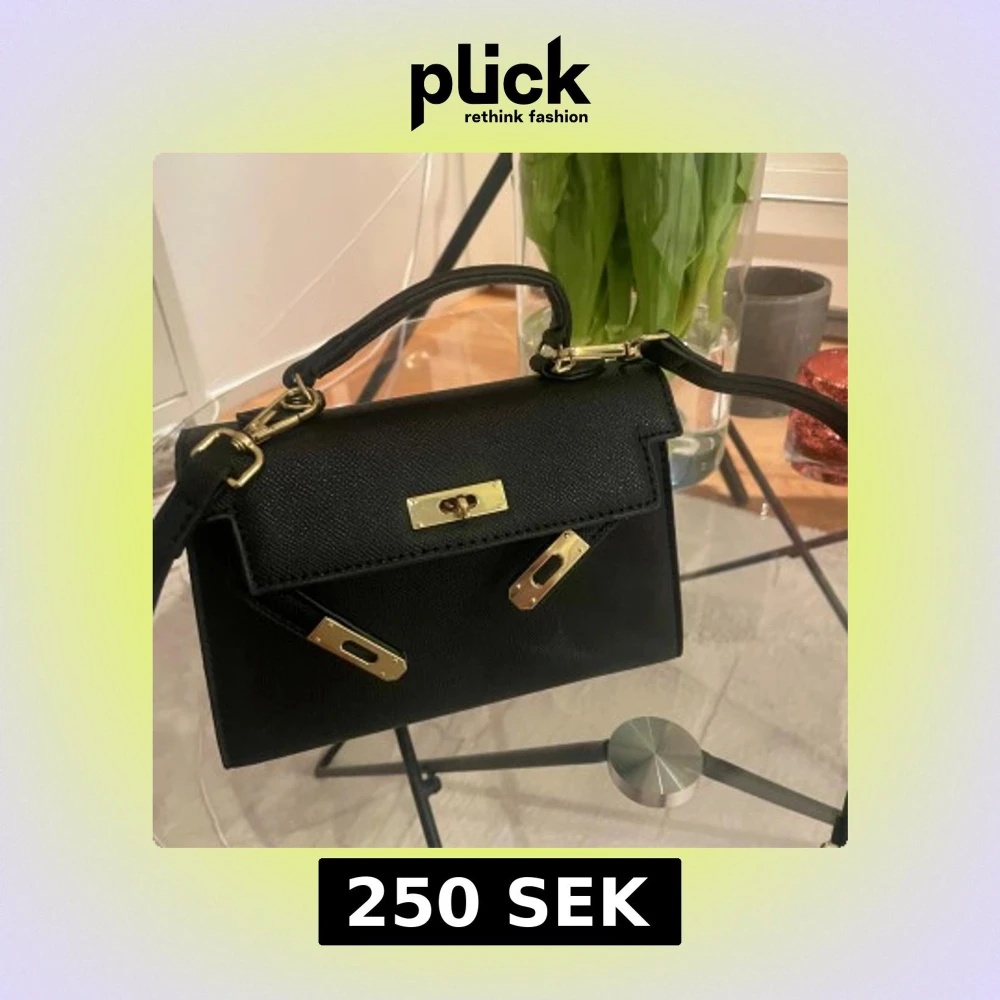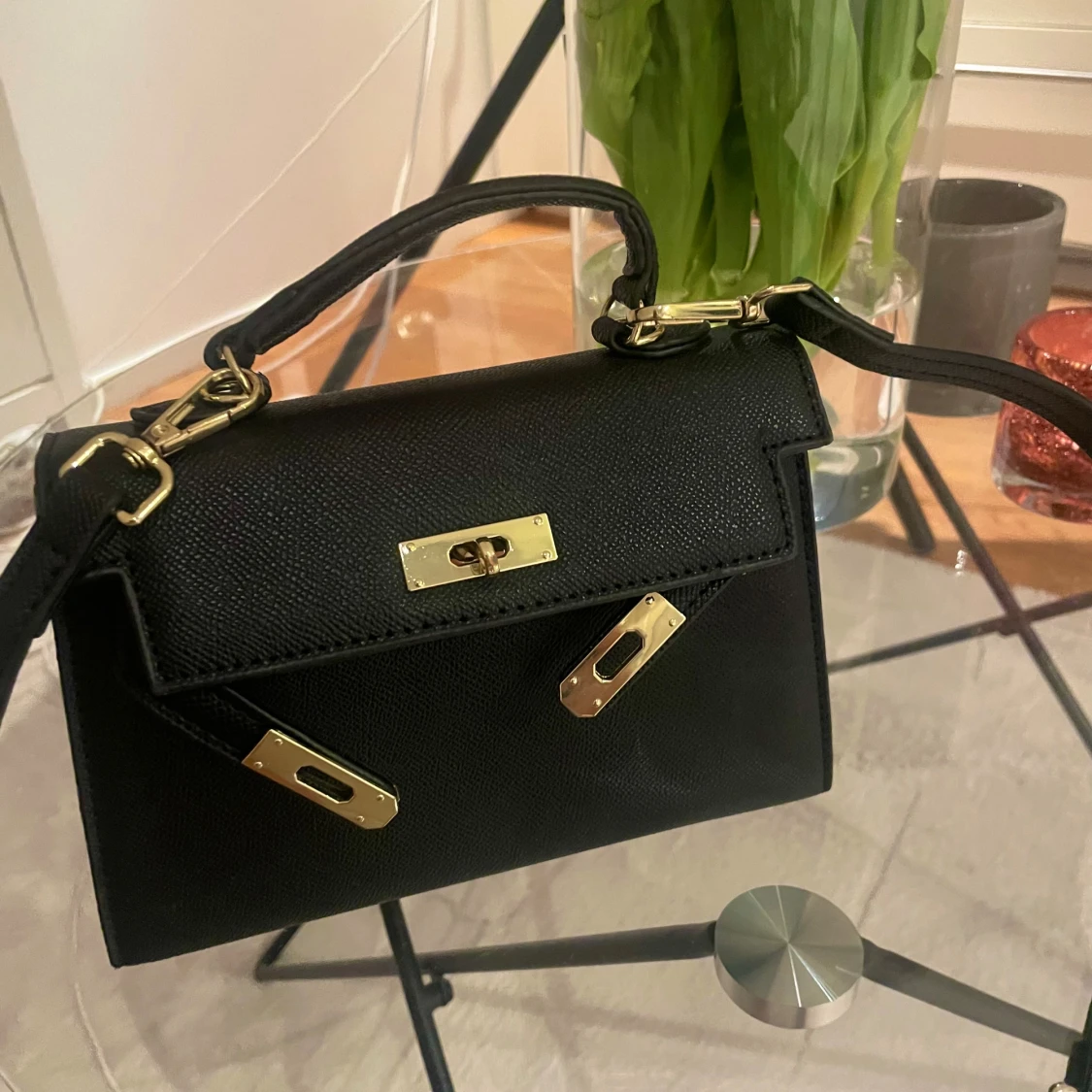 Snygg svart handväska med stilrena gulddetaljer och struktur i materialet. Väskan har både handtag och axelrem, vilket gör den enkel att bära på olika sätt. Klassisk och elegant design med rektangulär form och lock med vridspänne i guld. Ps. Inget märke på väskan. Oanvänd