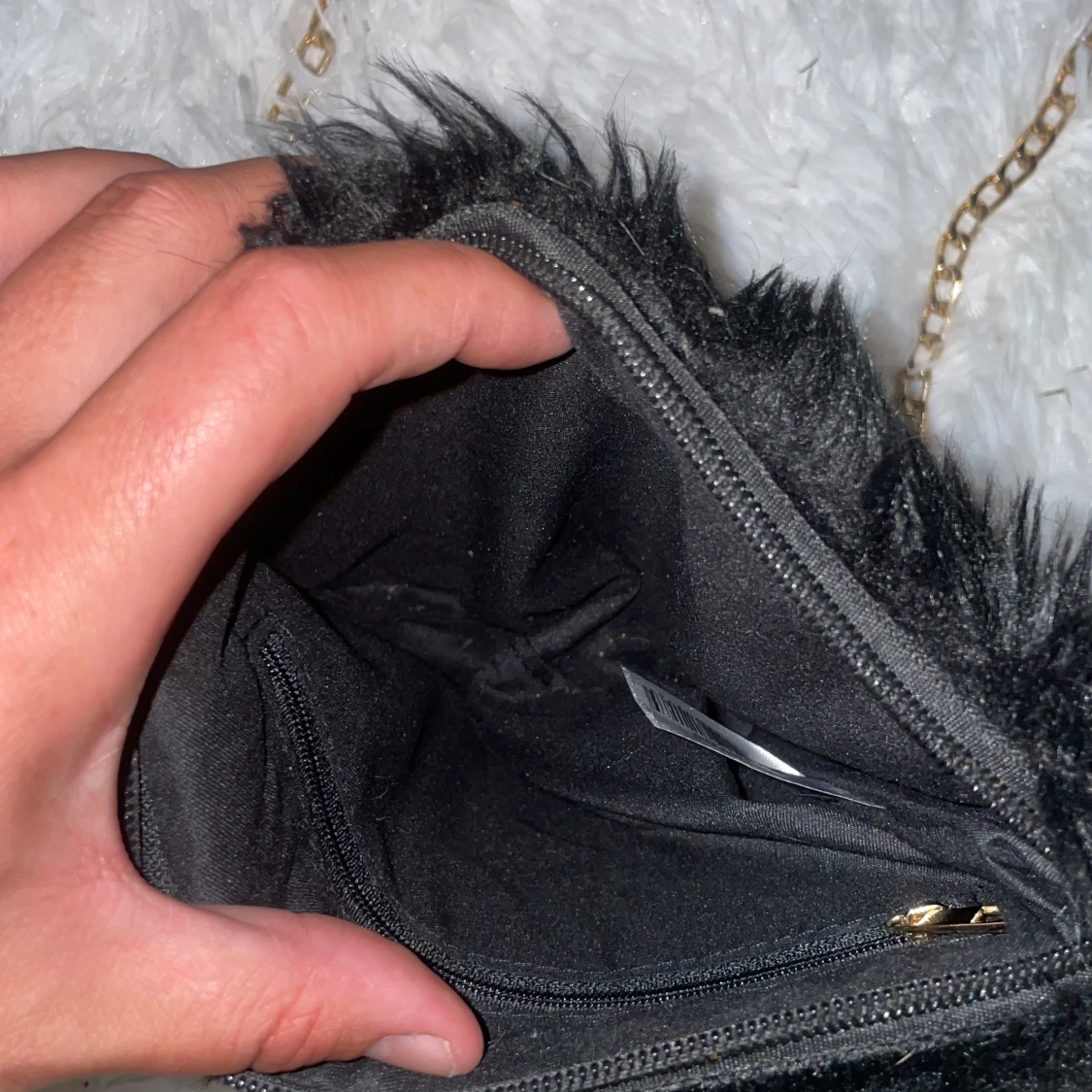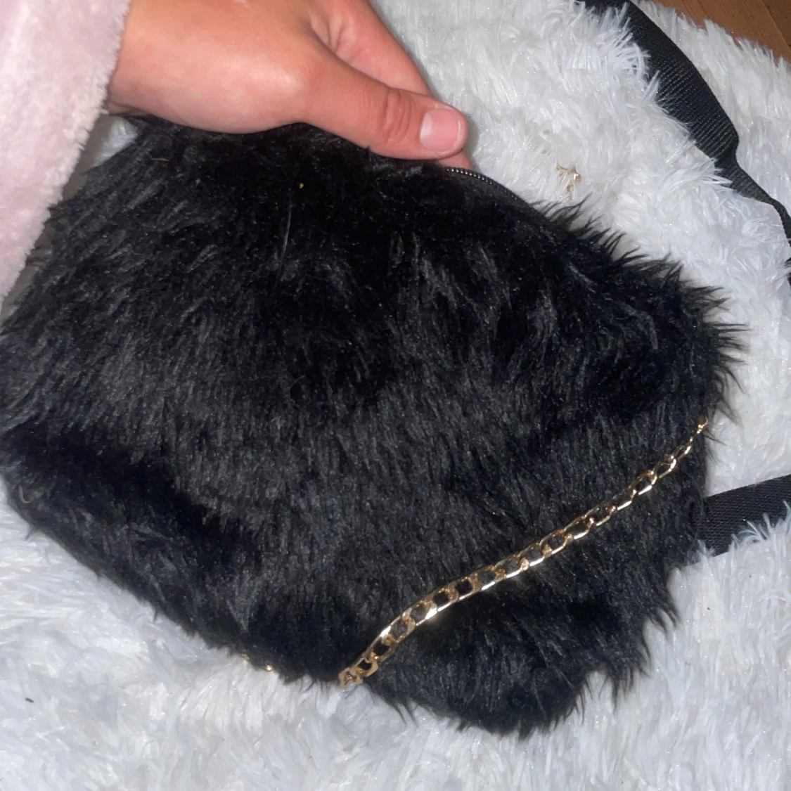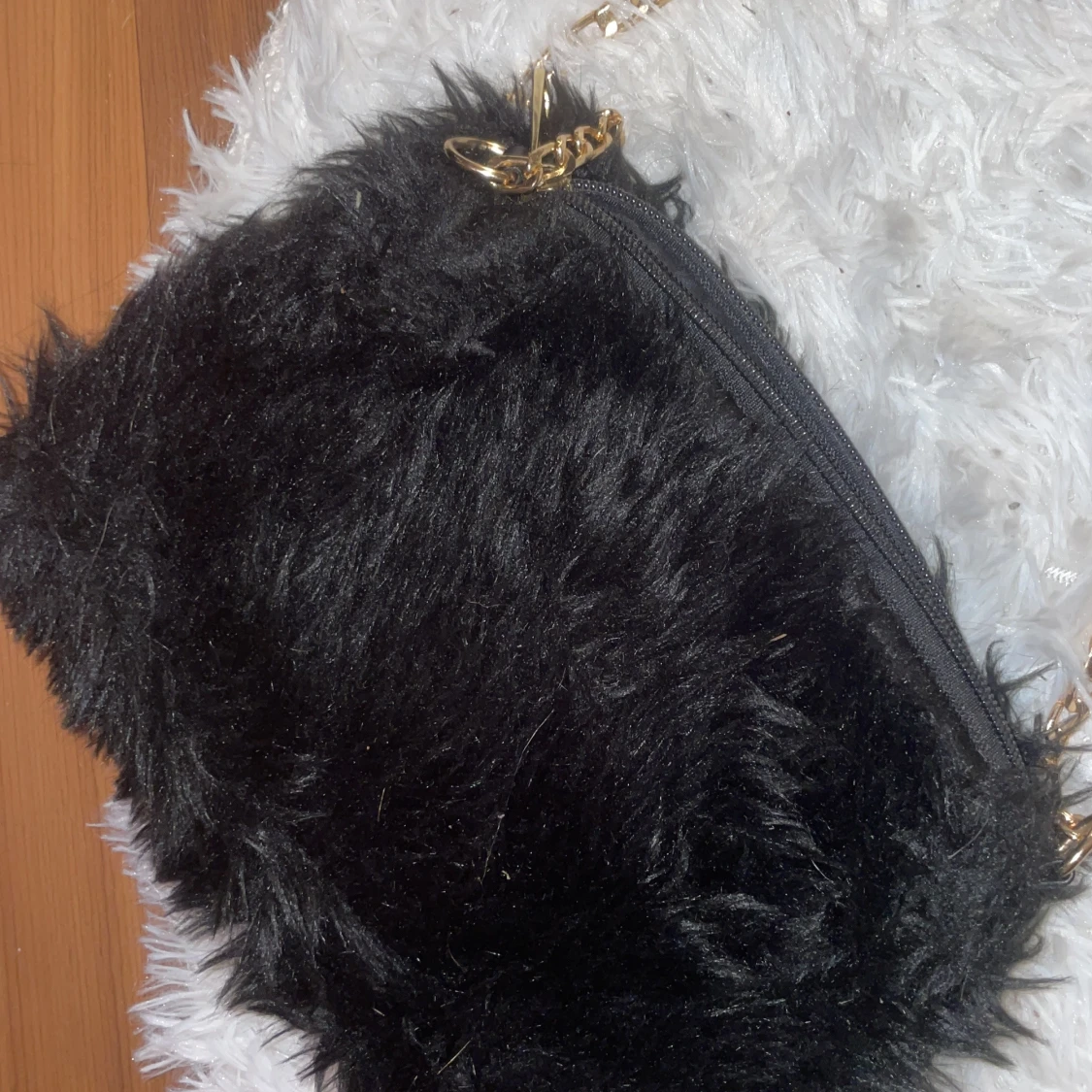 En svart fluffig axelväska med mjuk pälsimitation och snygg guldfärgad kedja som axelrem. Väskan har dragkedja upptill och ett rymligt fack inuti. Perfekt för dig som vill sticka ut med en cool accessoar.
