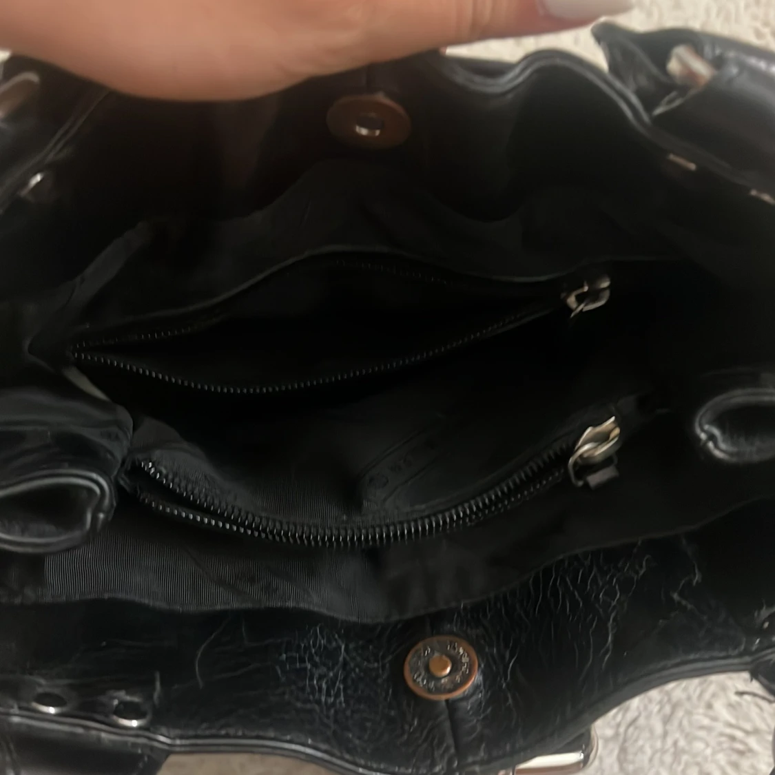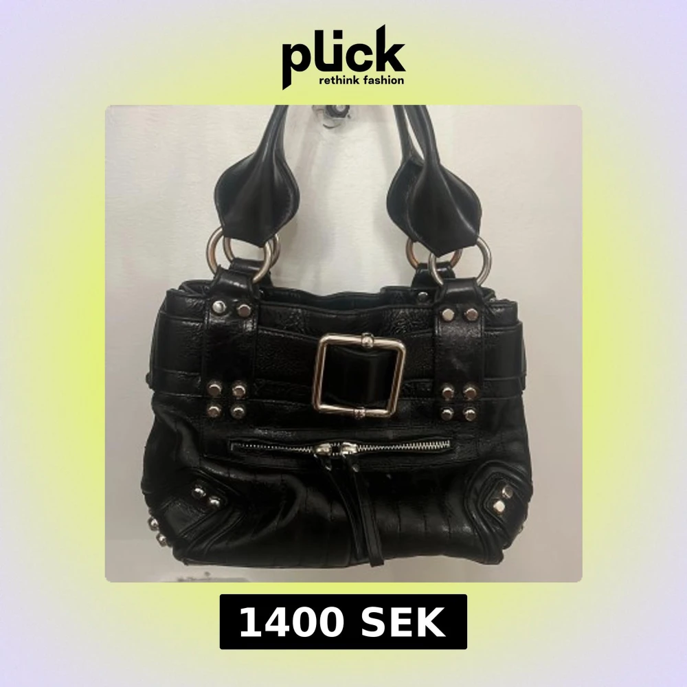 svart vintage handväska i skinn från Karen Millen med stora silvriga metalldetaljer, markerat spänne och nitar. väskan har dubbla handtag, dragkedja framtill och flera fack inuti. väskan är köpt för 4000kr. pris kan diskuteras!💞