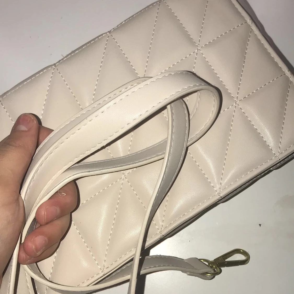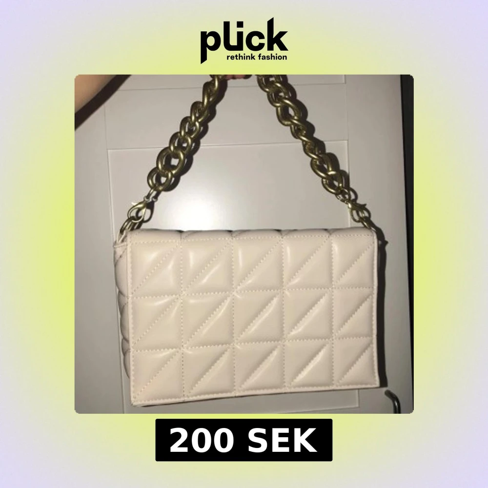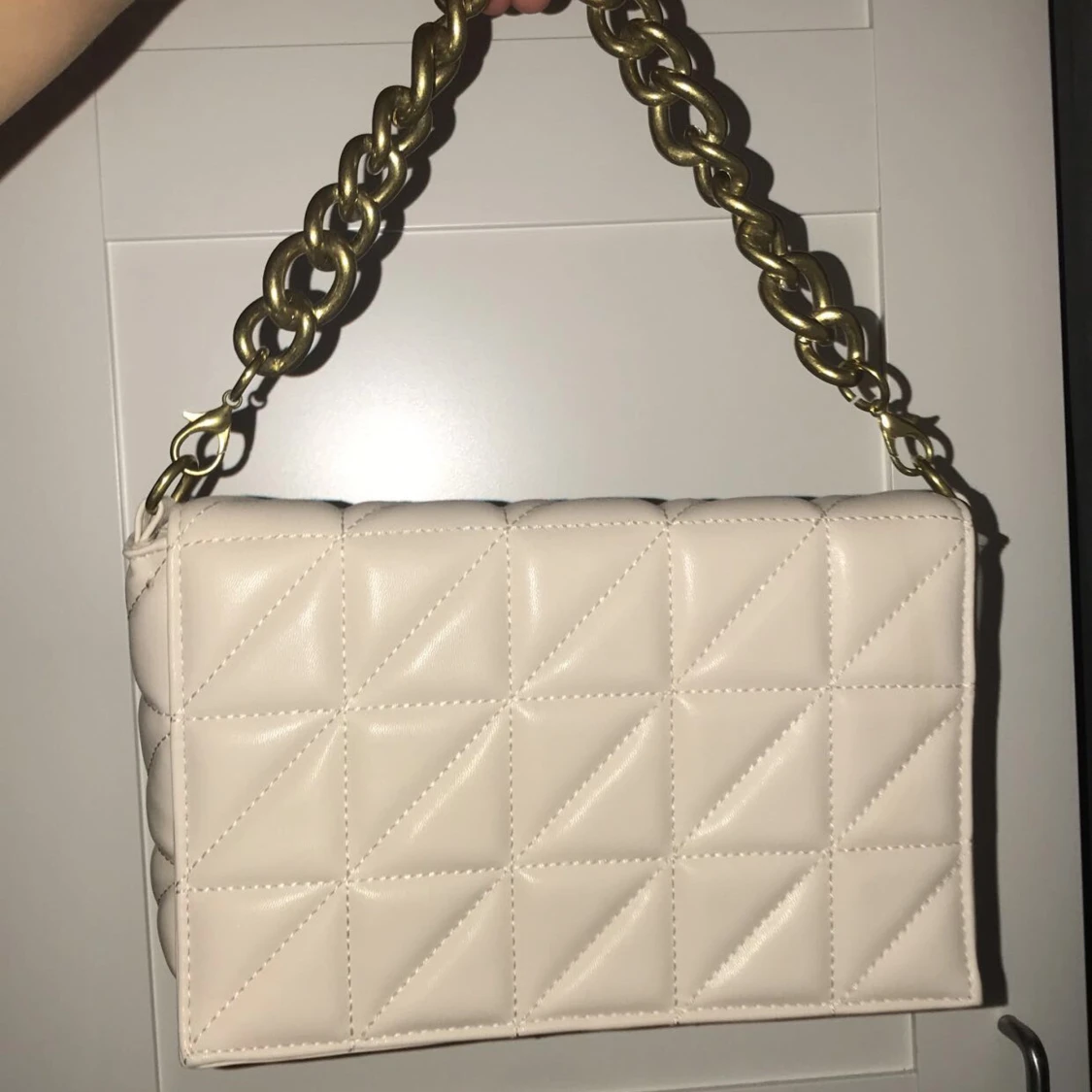 Snygg beige axelväska med quiltat mönster och en kraftig guldfärgad kedja som handtag. Väskan har en avtagbar axelrem för extra flexibilitet. Perfekt för att ge en stilren touch till din outfit.