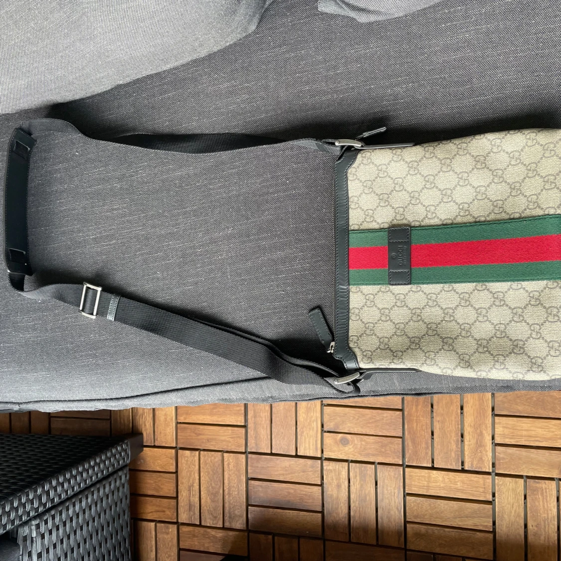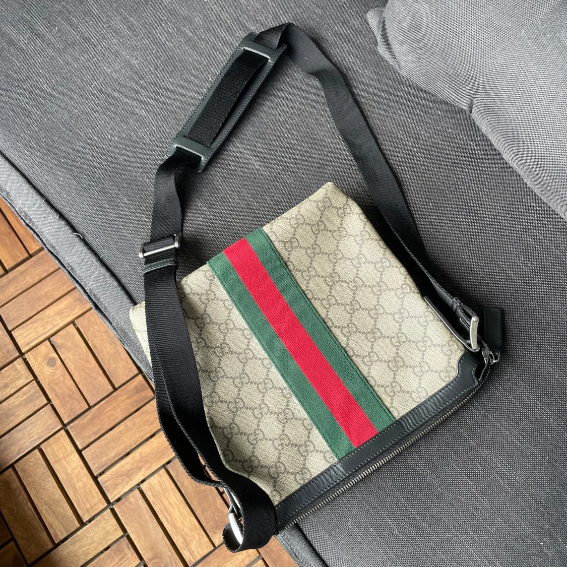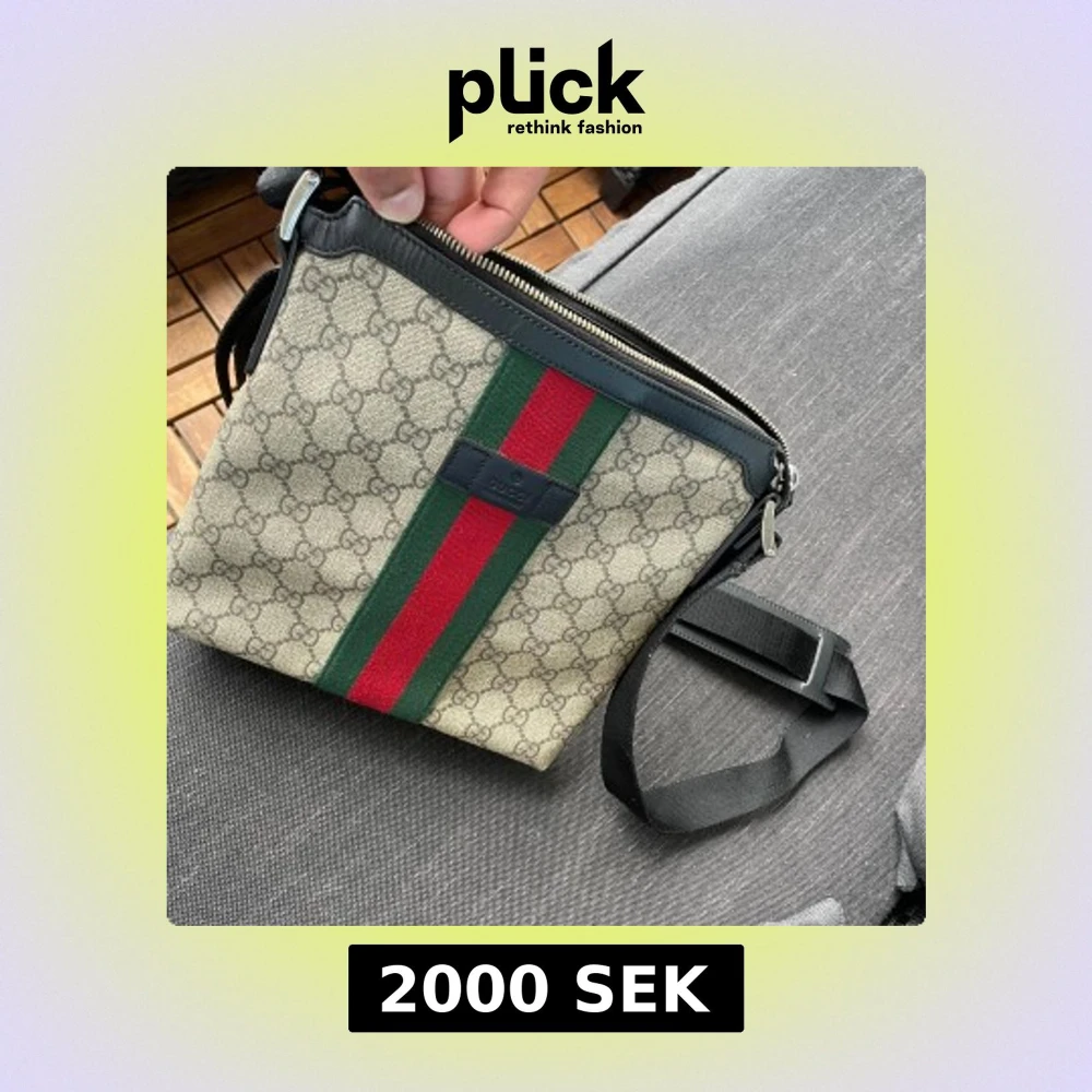 Säljer en Gucci axelväska med klassisk GG-monogram och grönt/rött band på framsidan. Väskan har svarta detaljer, justerbar axelrem och dragkedja. Perfekt för dig som vill ha en snygg accessoar nu på sommaren.