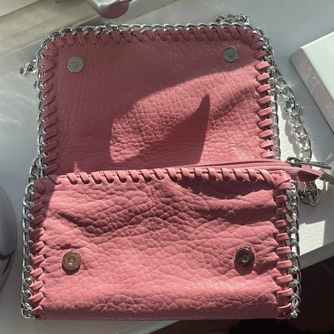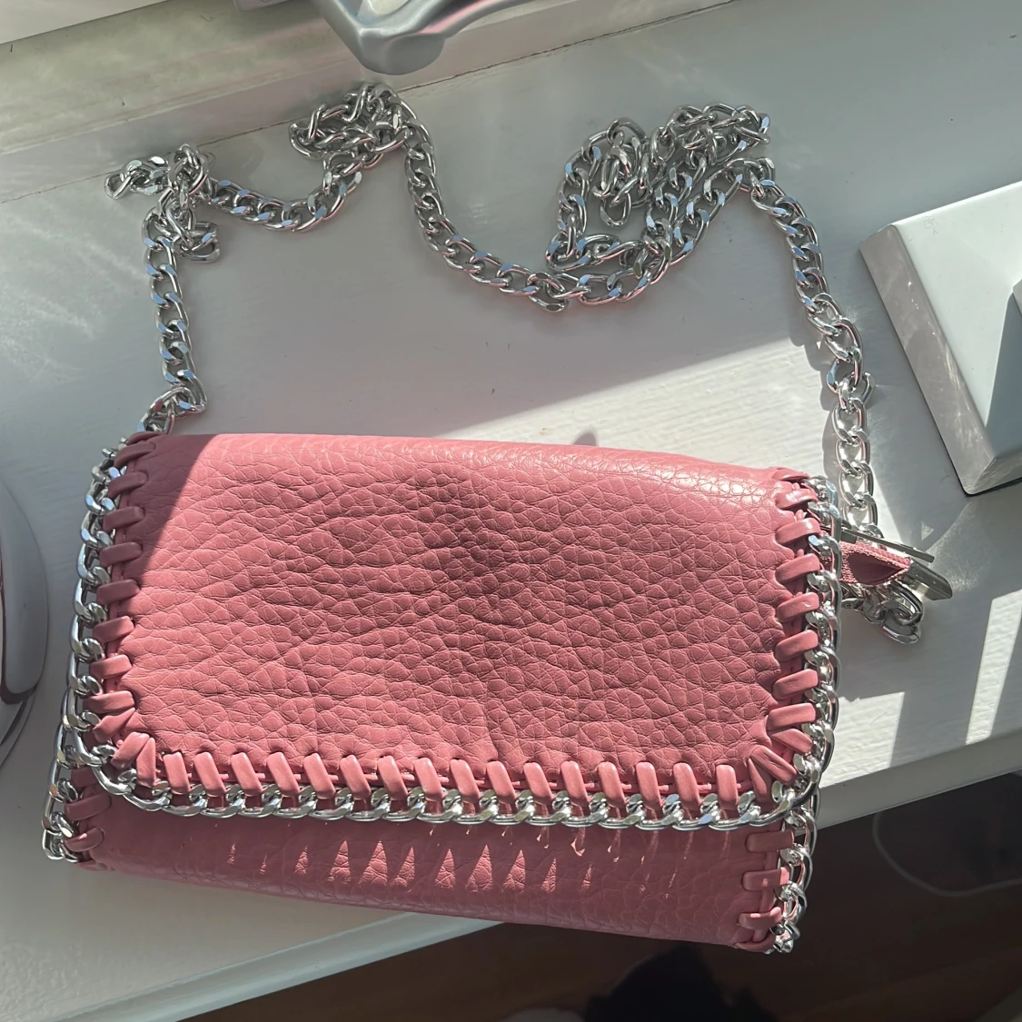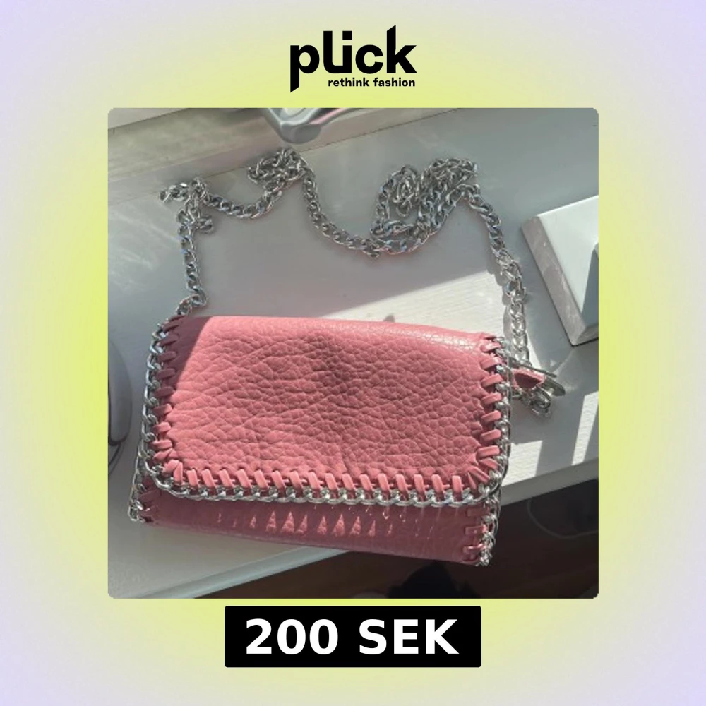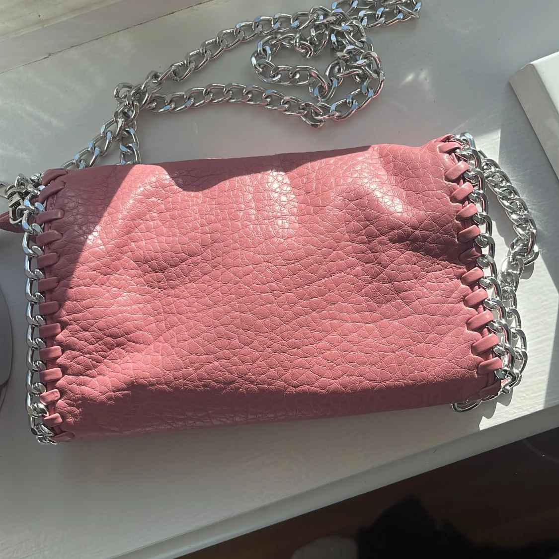 Snygg rosa axelväska i skinnimitation med grov silverfärgad kedja runt kanterna och som axelrem. Väskan har ett coolt flätat mönster längs kanten och magnetlås. Perfekt storlek för det viktigaste och ger en edgy vibe till din outfit.