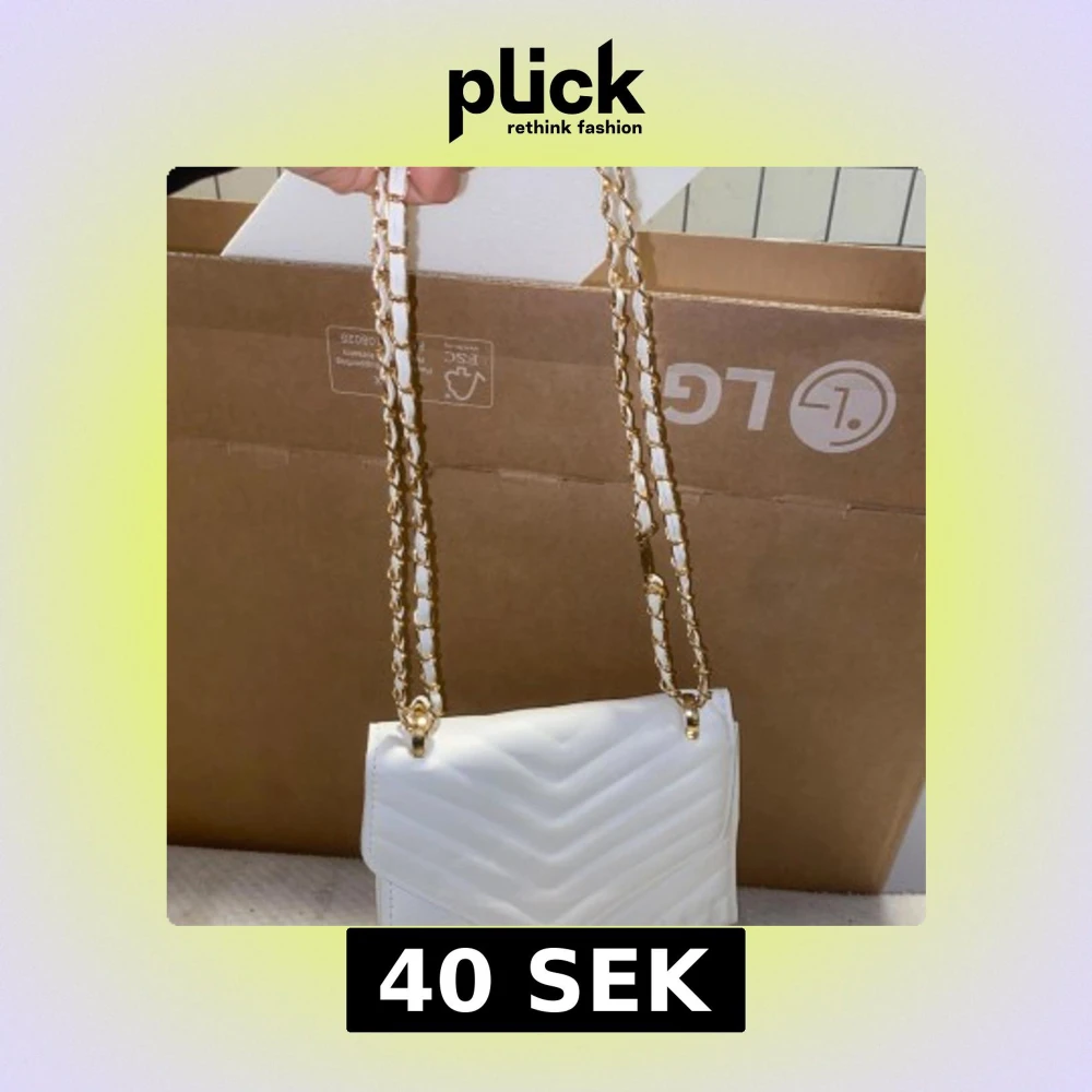 Snygg vit axelväska med quiltat mönster och guldkedja som axelrem. Väskan har en stilren design med ett praktiskt magnetlås. Perfekt för att ge en elegant touch till din outfit.