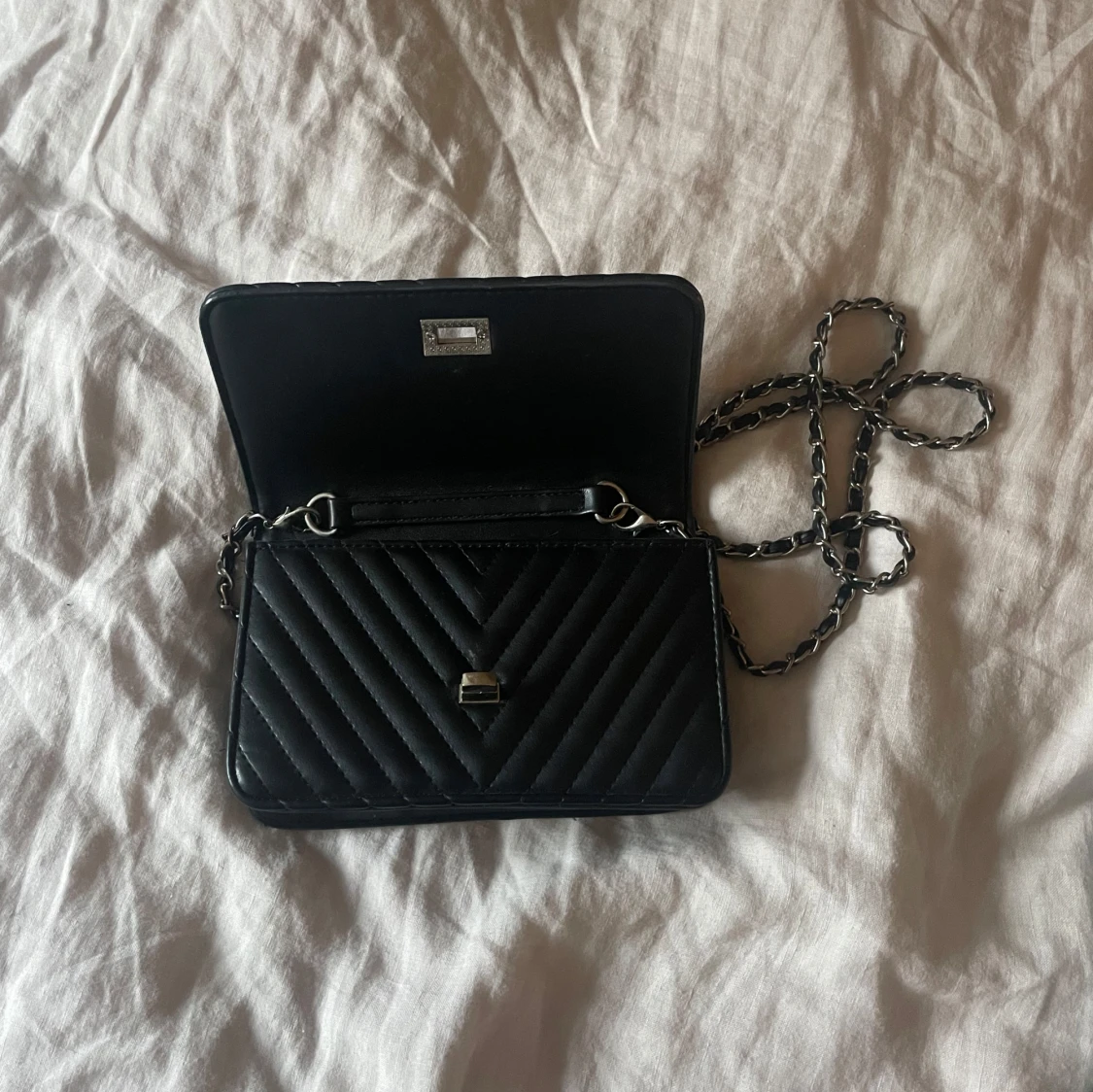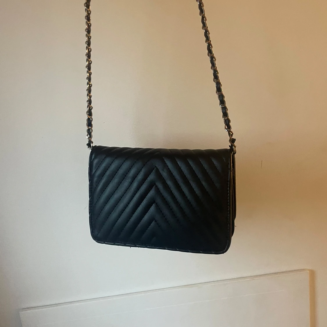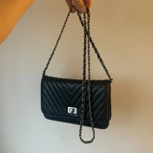Snygg svart axelväska med quiltat mönster och kedjeaxelrem. Köpt i Grekland och bara använd några få gånger.