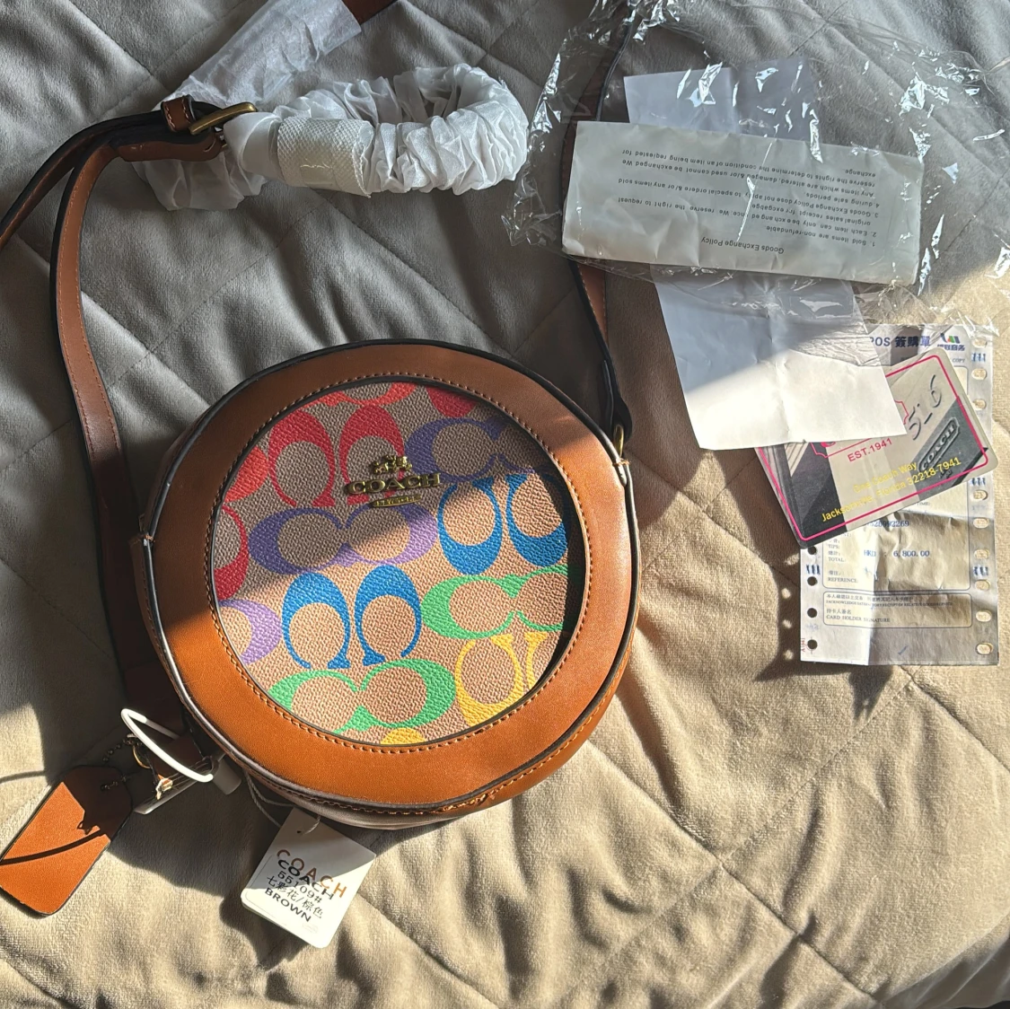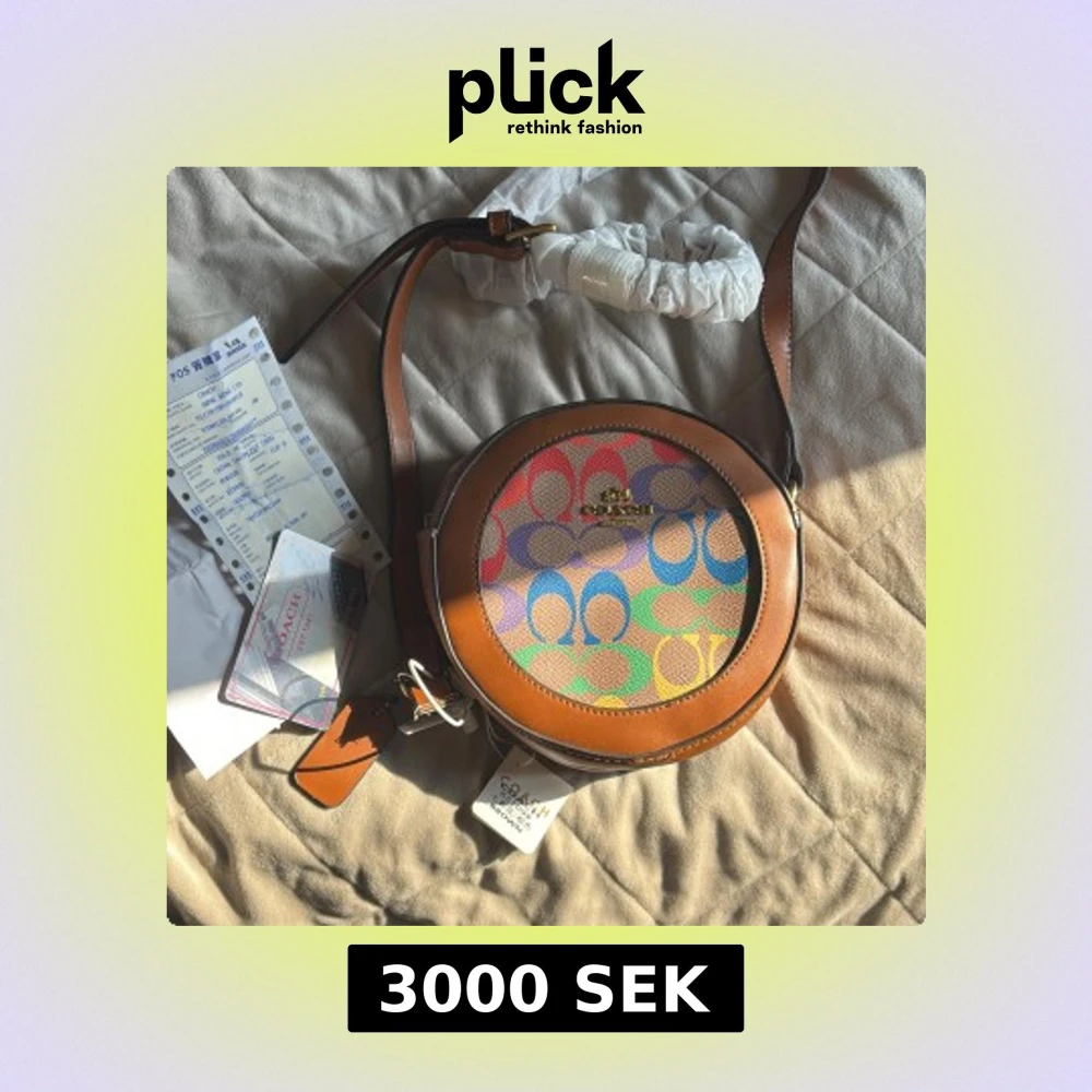 Unik väska!! Cool. Kunde inte låta bli. Säljer en rund axelväska från Coach med bruna skinnkanter och ett färgglatt mönster med Coach-loggor i blått, rosa, grönt, lila och gult. Väskan har justerbar axelrem i brunt skinn och guldfärgad logga framtill. Perfekt för dig som vill sticka ut med en unik accessoar.inköp 6800.