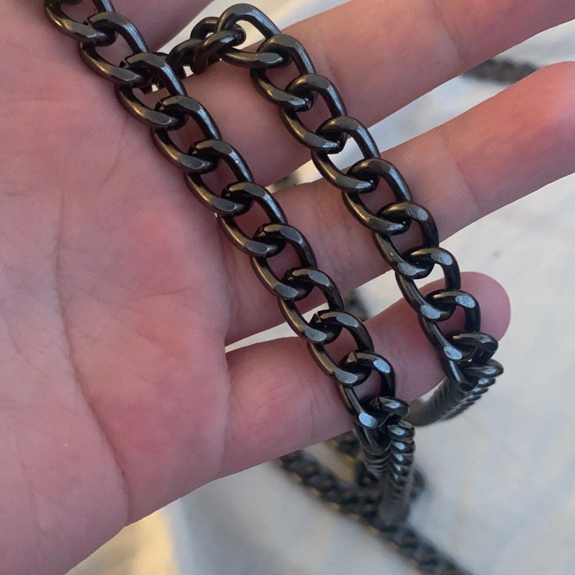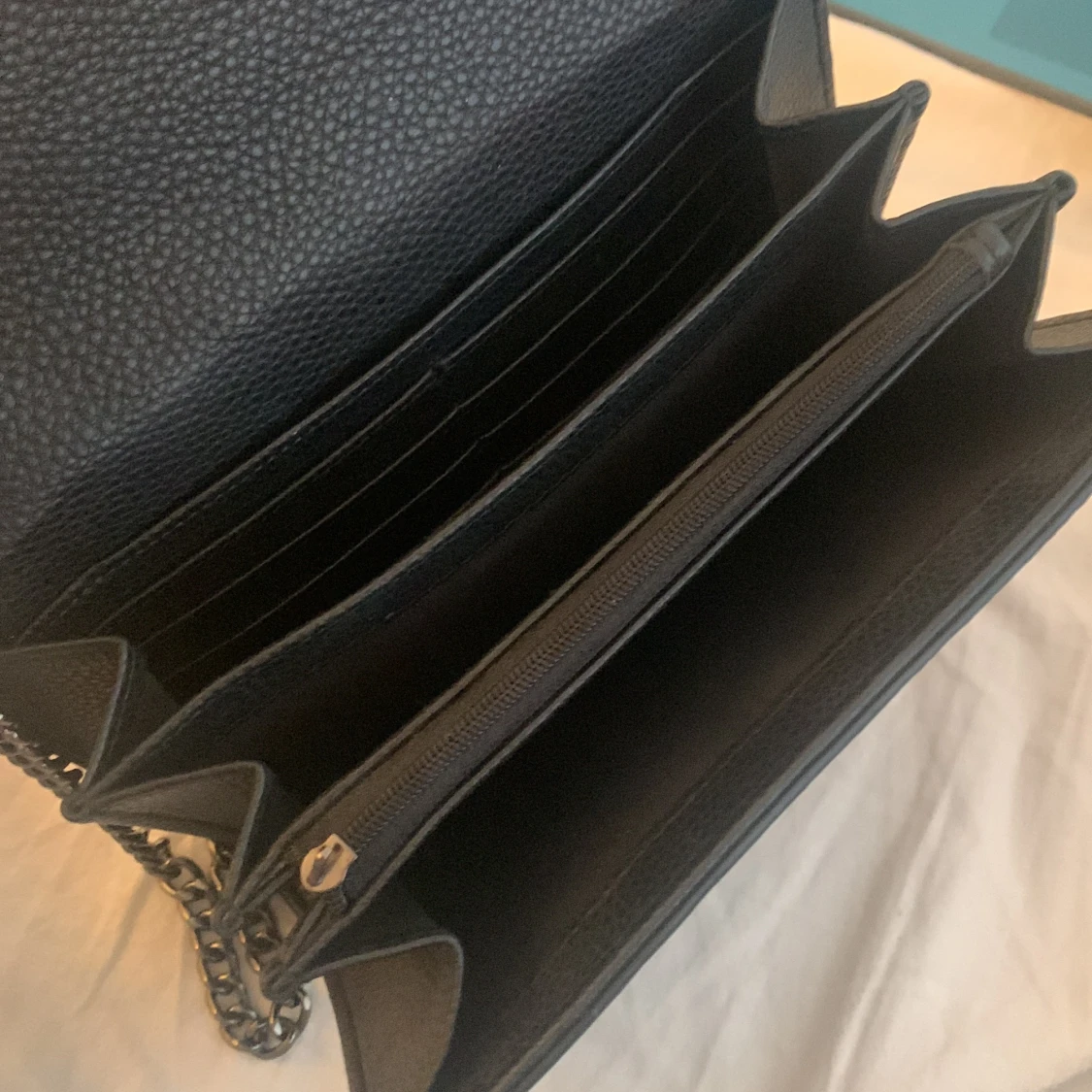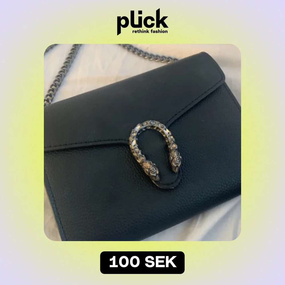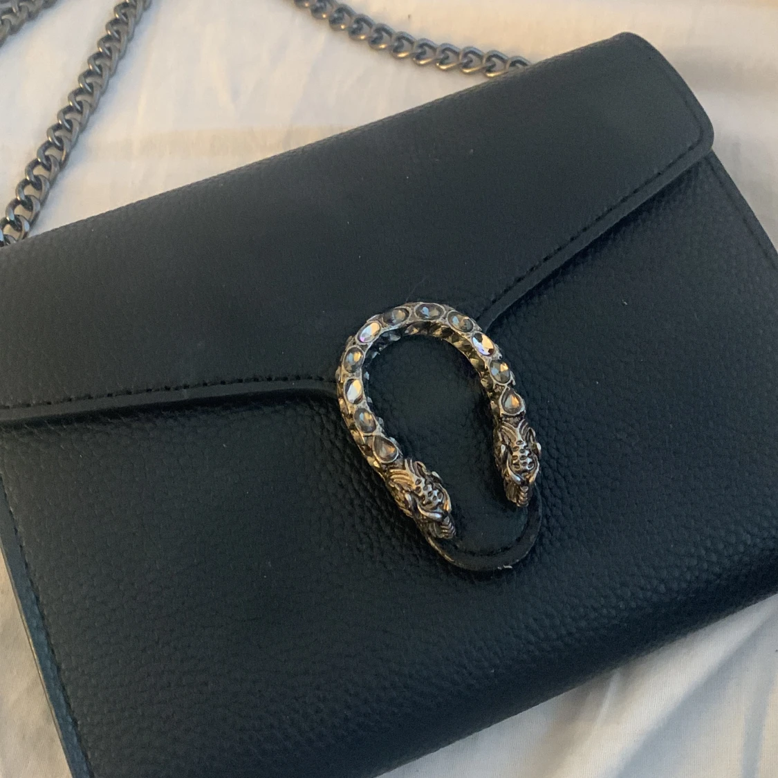 Svart axelremsväska med orm på, många fack i väskan även en korthållare, använd mycket, trasig dragkedja på insidan men går att fixa lätt