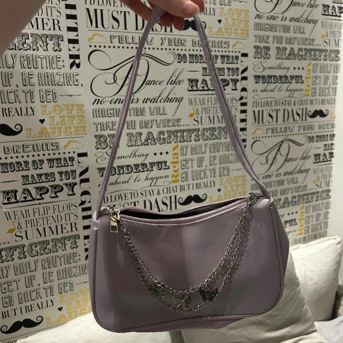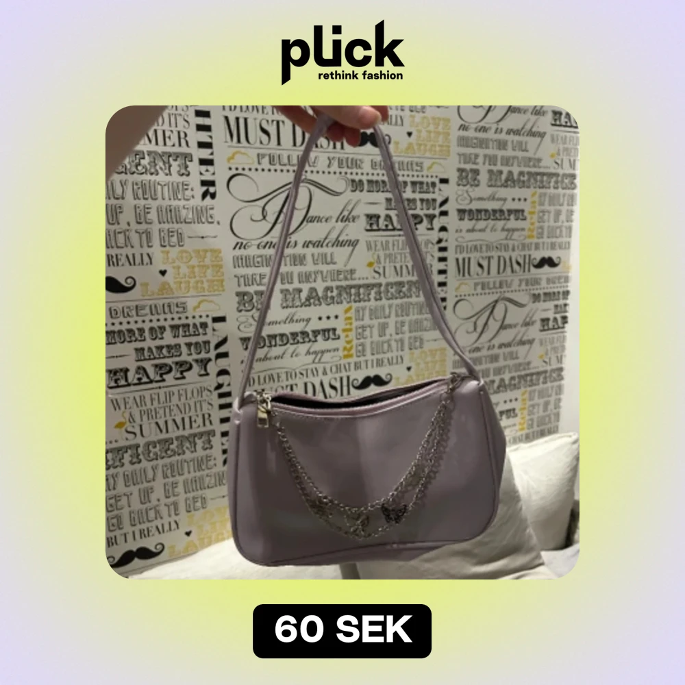 Lila handväska med fjärilar från Shein. Den är liten och gullig men har tyvärr inga fickor inuti.