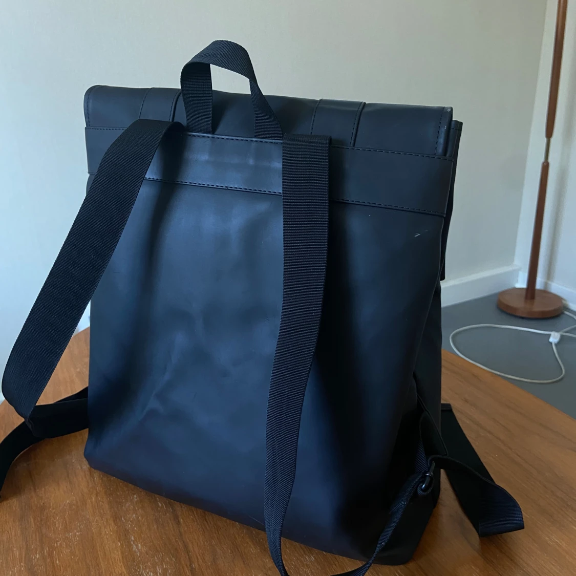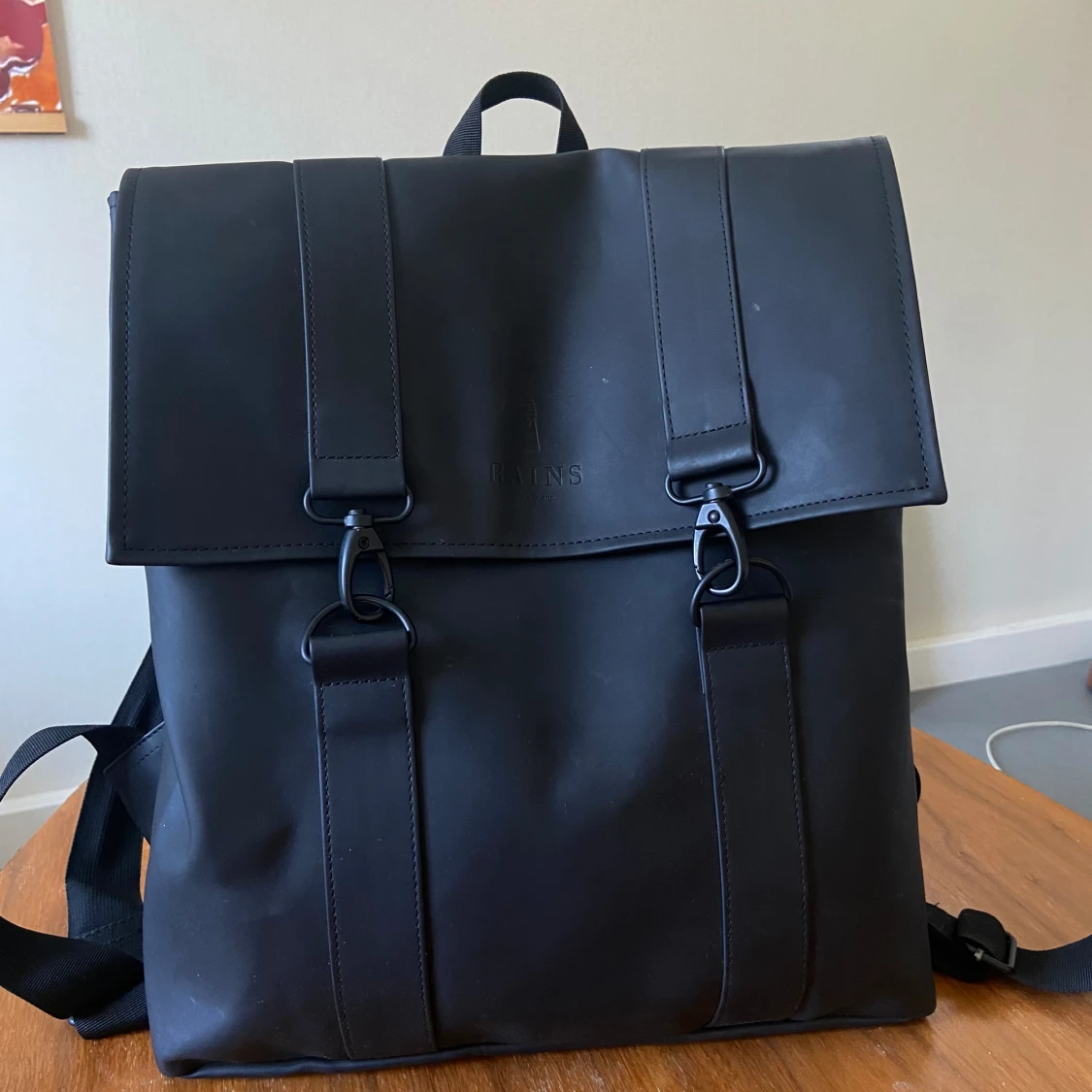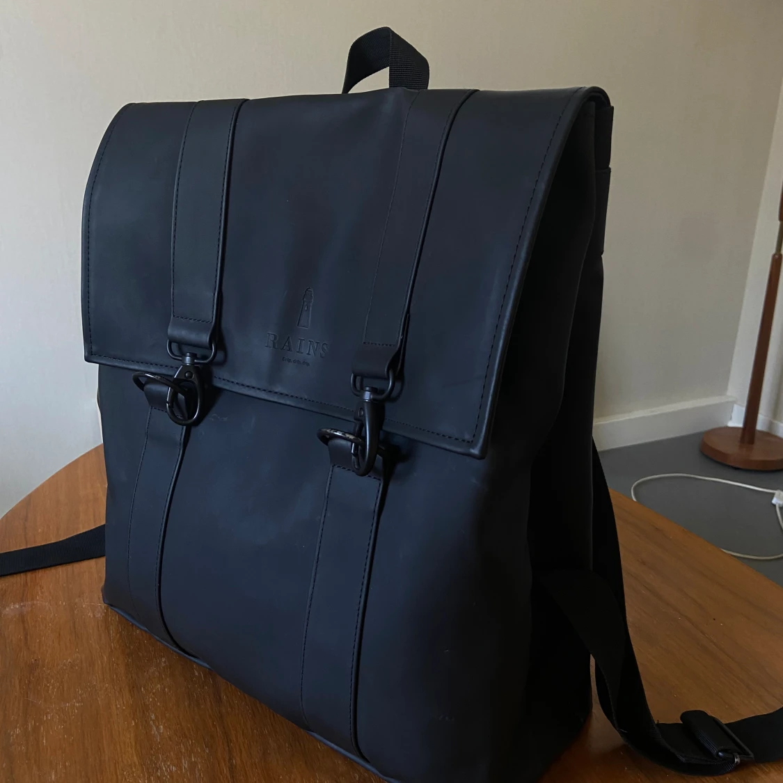Svart ryggsäck från Rains med laptopfack. Storlek: 21 liter, 40x35x15 cm.