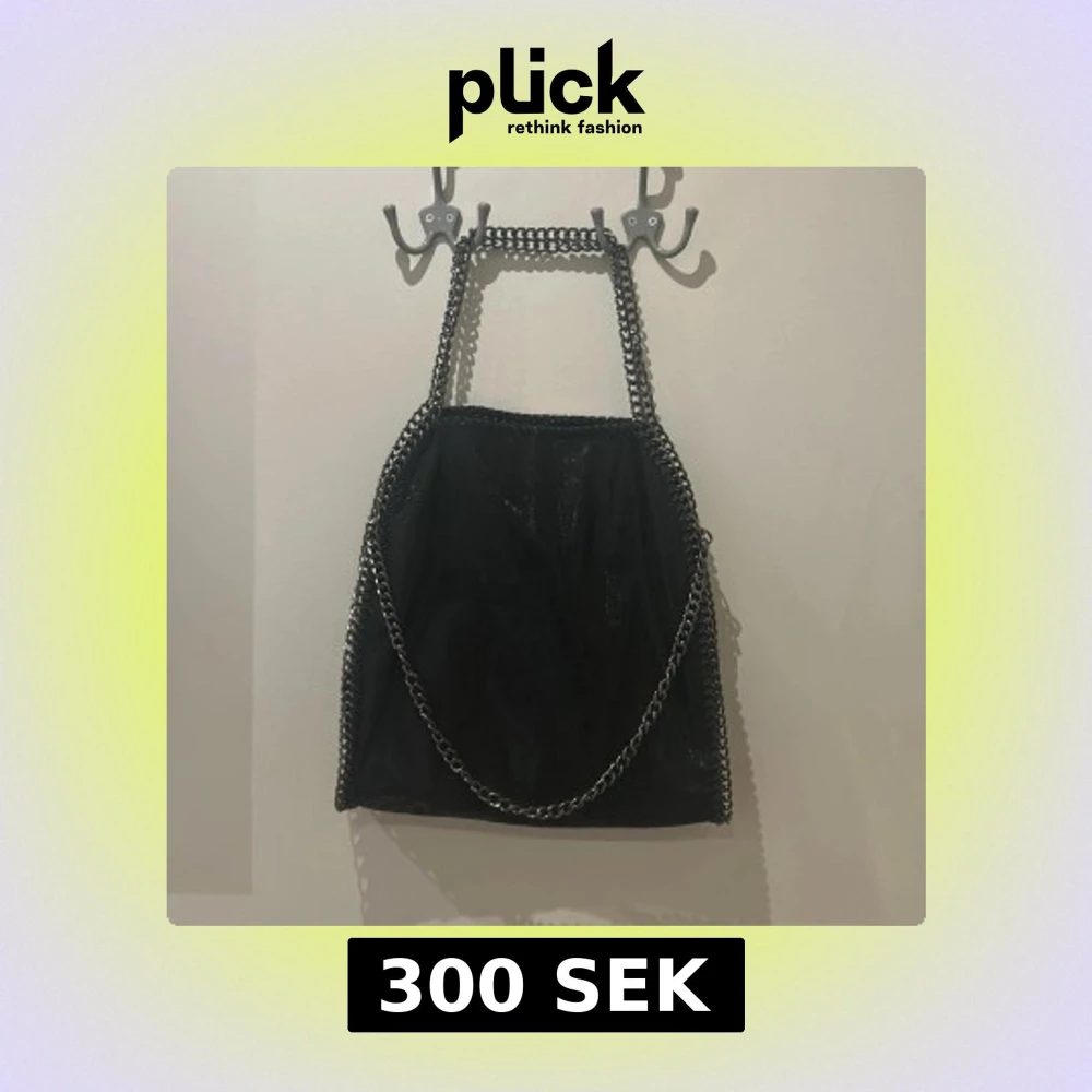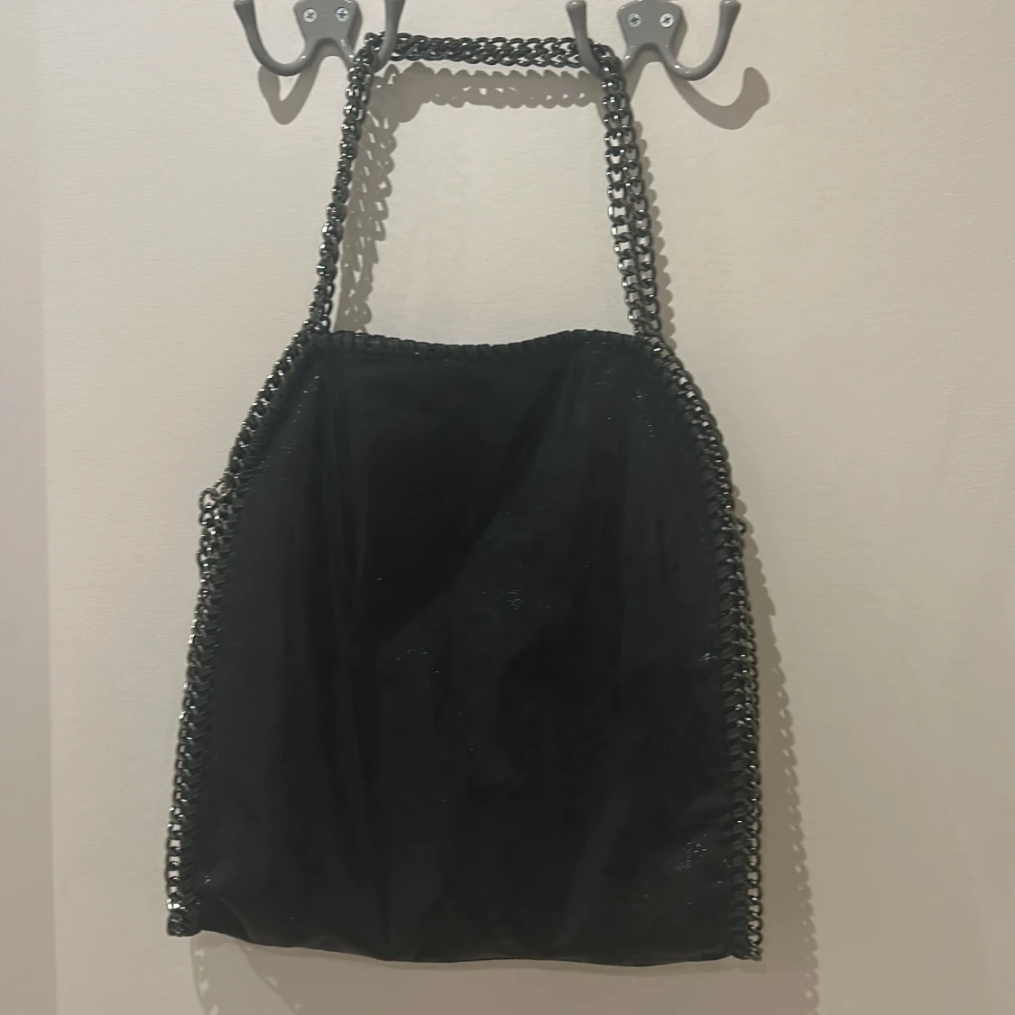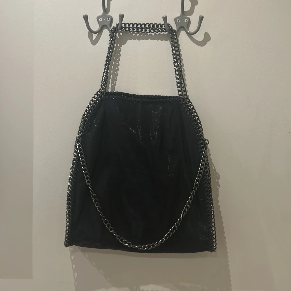Snygg svart axelväska med coola kedjedetaljer runt kanterna och som axelrem. Rymmer allt du behöver för dagen. Enkel att matcha med olika outfits. Säljer för har två stycken. Nyskick.