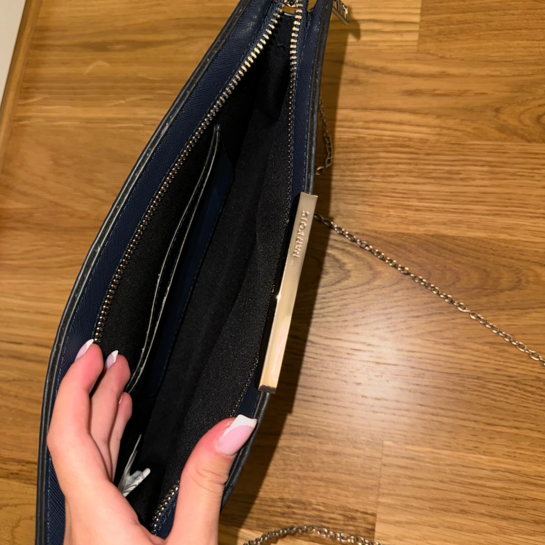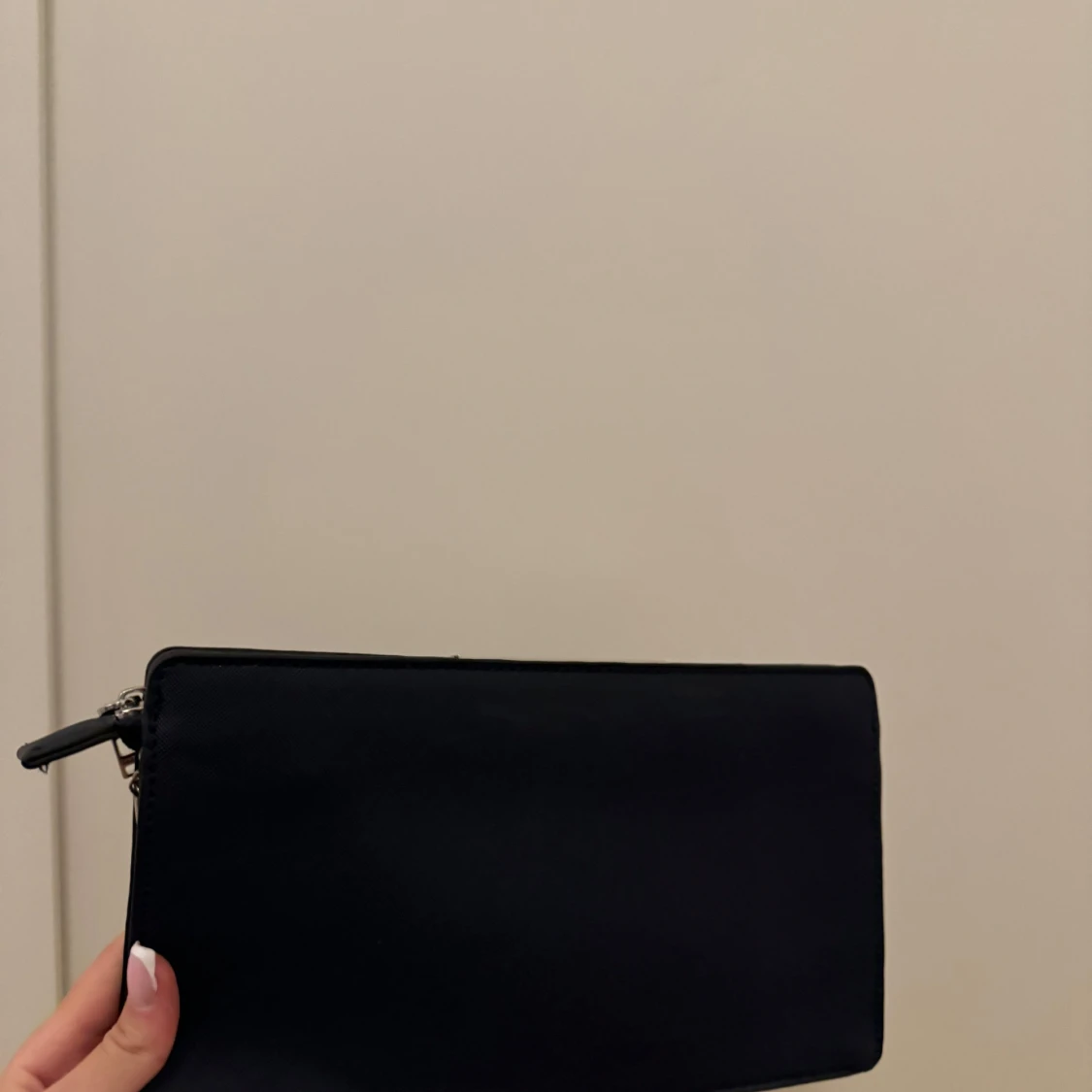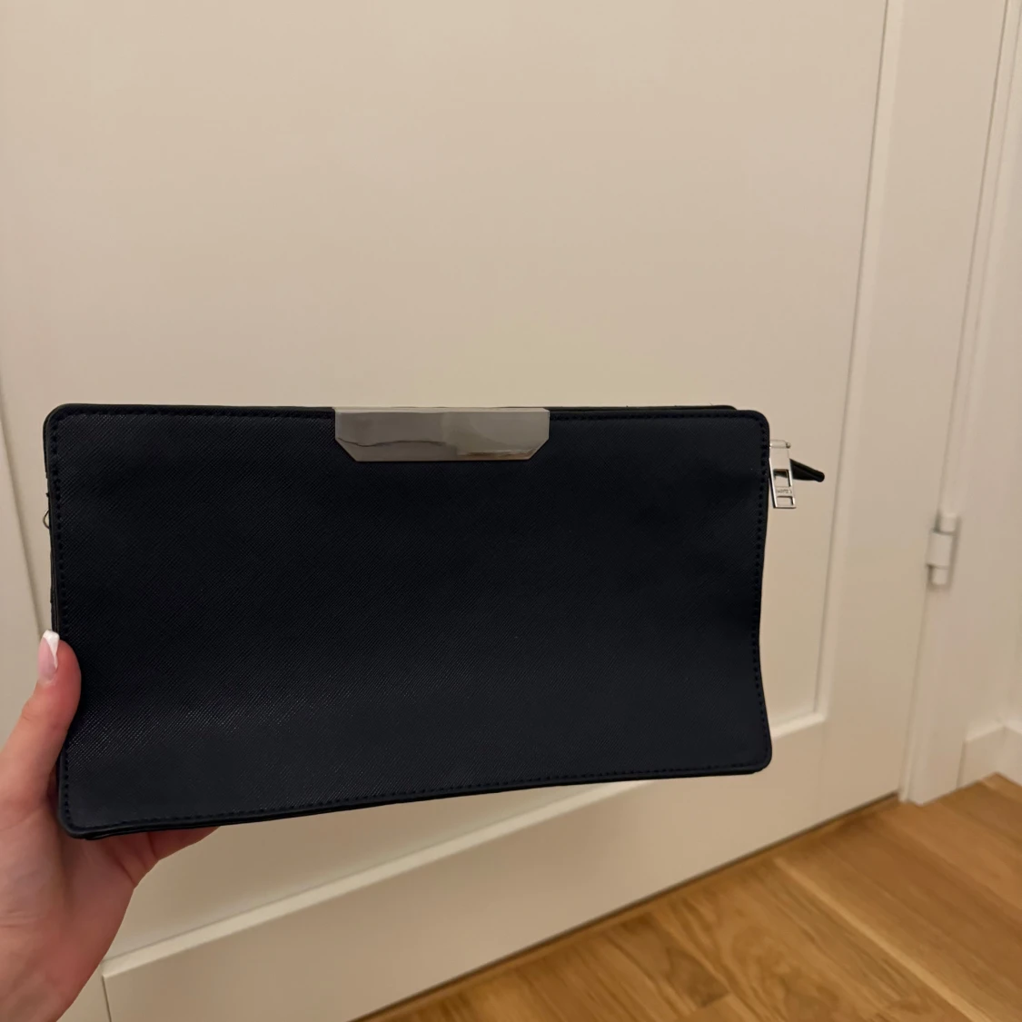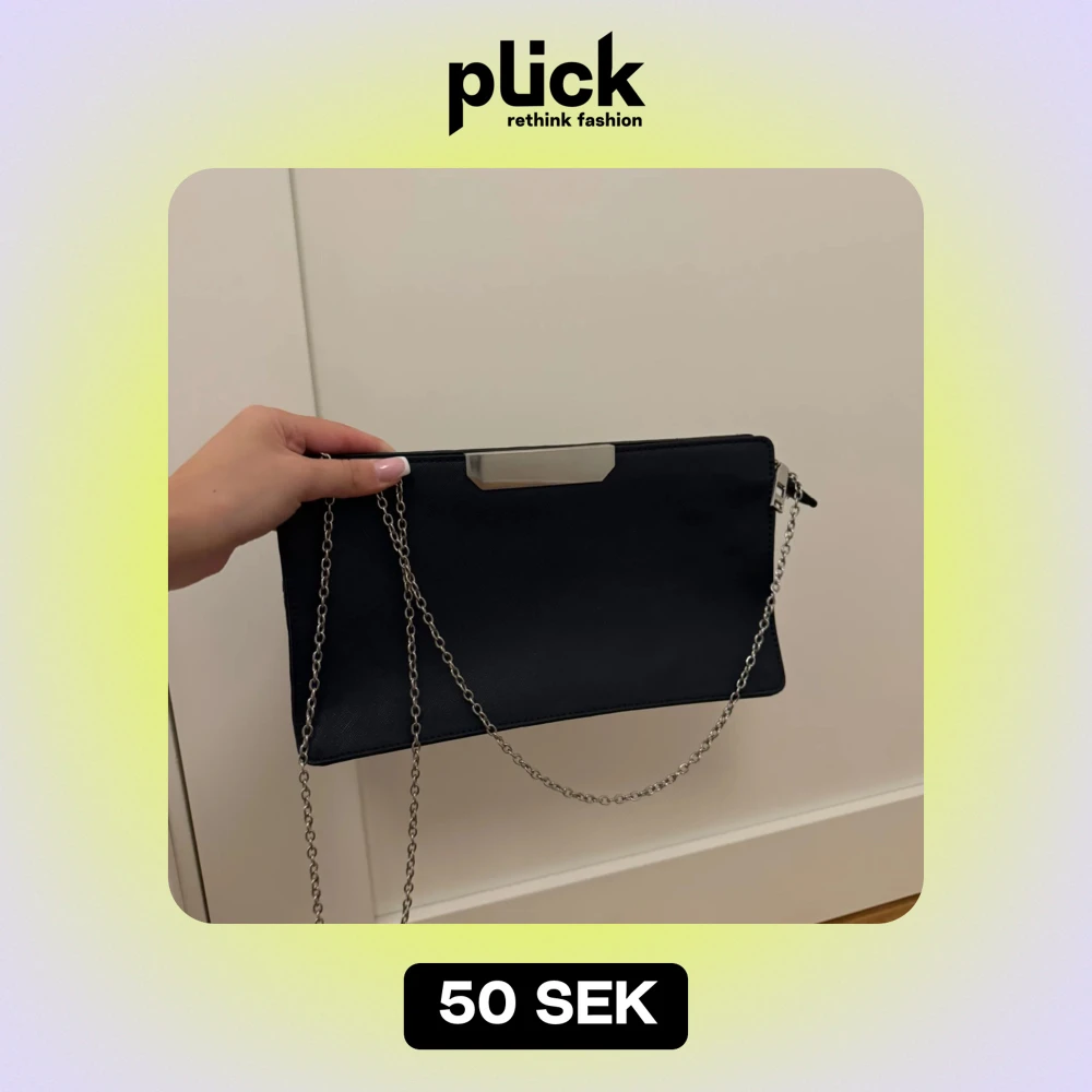 Snygg svart kuvertväska i syntetmaterial med en elegant kedja som axelrem. Väskan har en stilren design med en dragkedja upptill och en metallisk detalj på framsidan. Perfekt för festliga tillfällen eller en utekväll. HELT OANVÄND