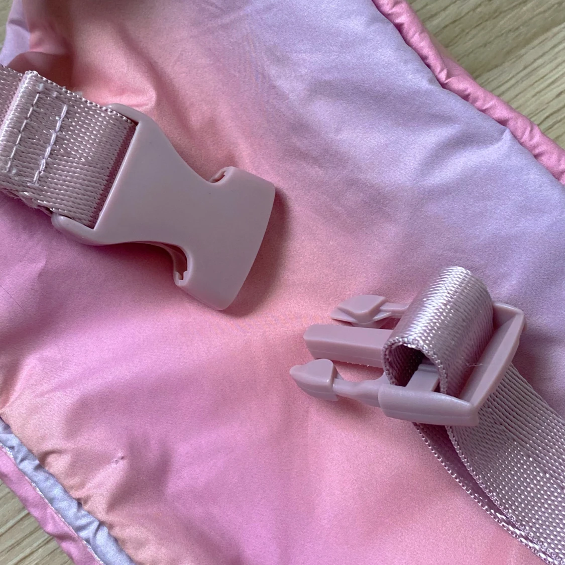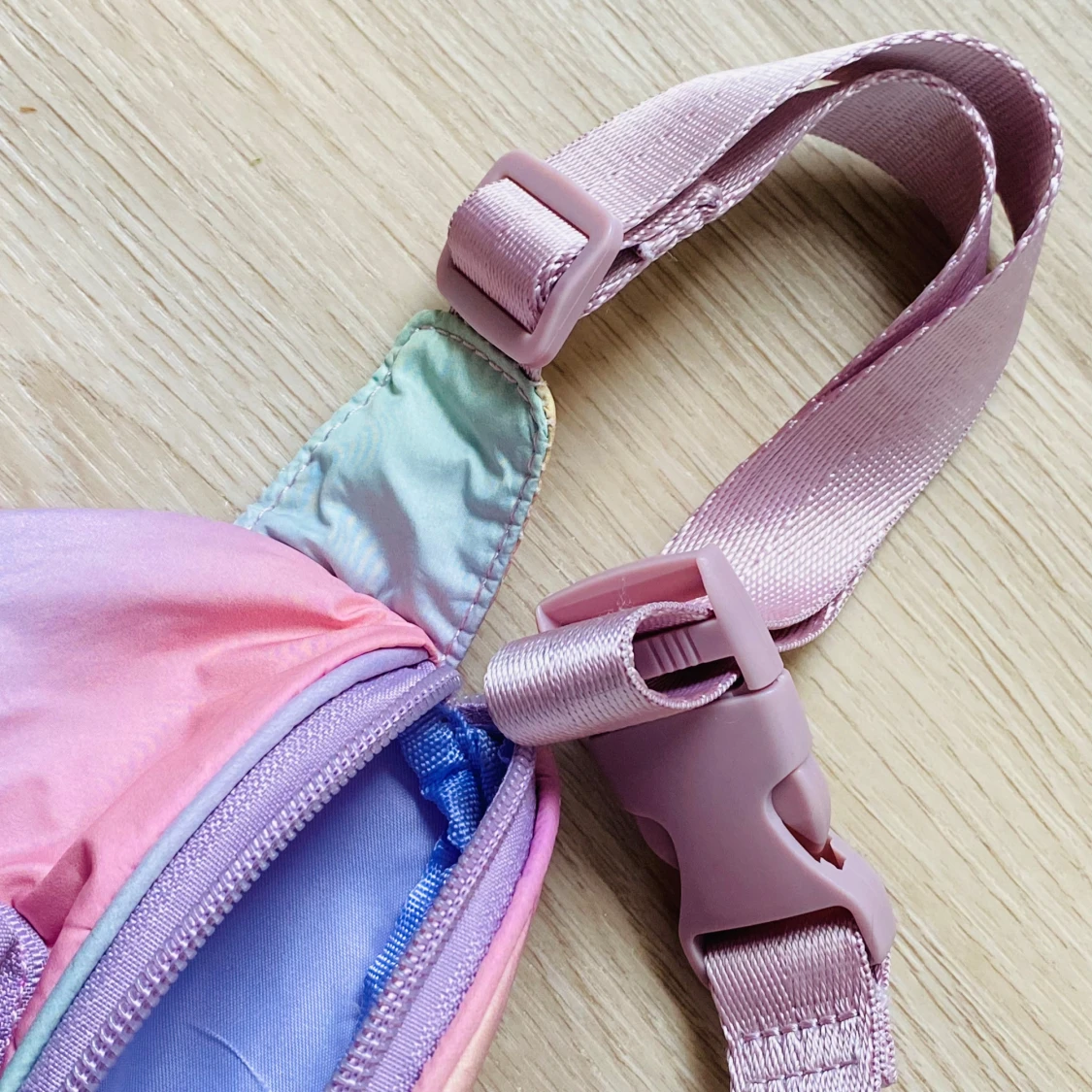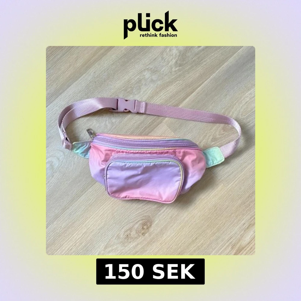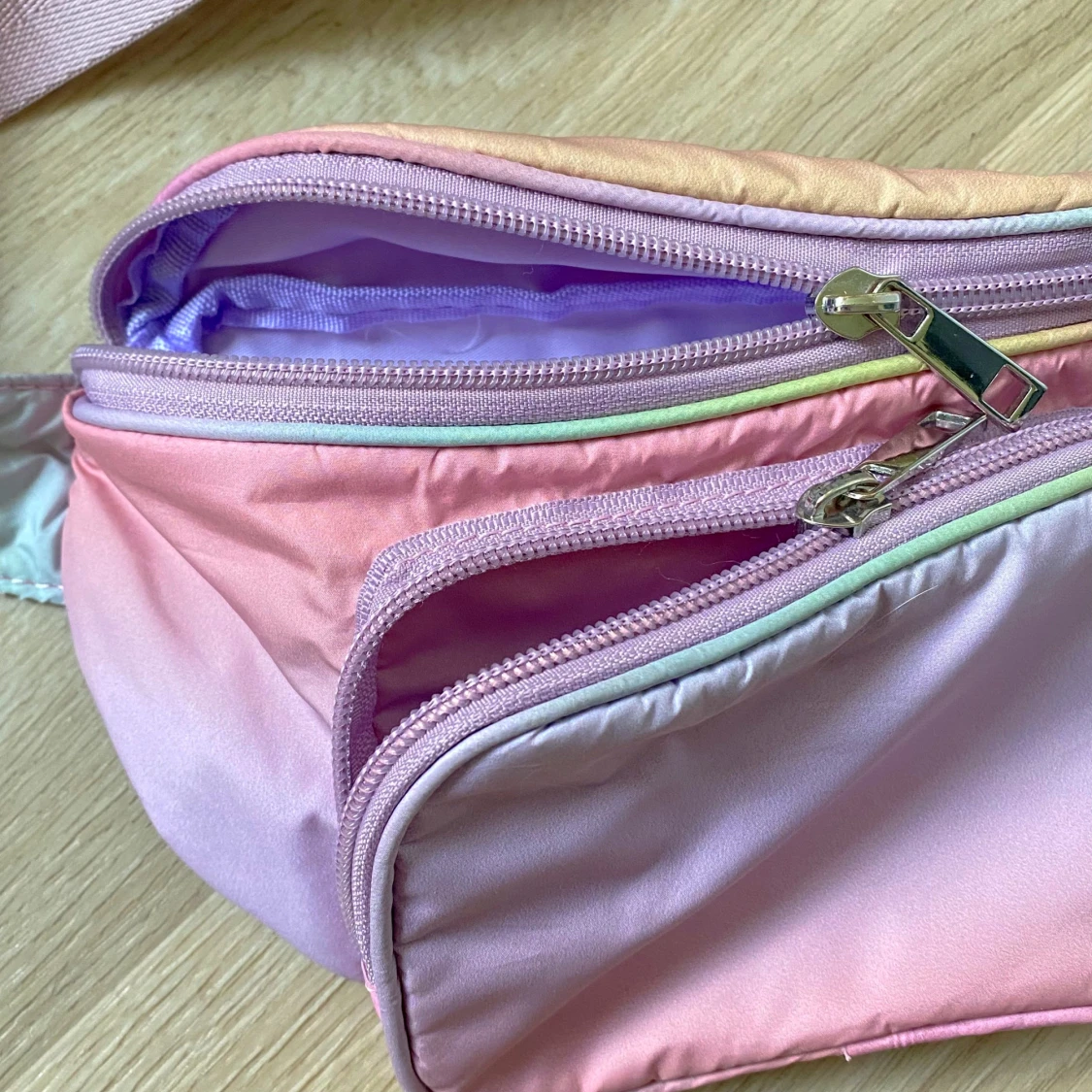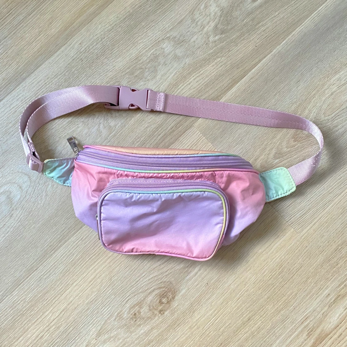 Säljer en snygg magväska i pastellfärger med rosa, lila och mintgröna toner. Väskan har två fack med dragkedja och justerbart band med spänne. Perfekt för att bära mobilen och småprylar när du är på språng.