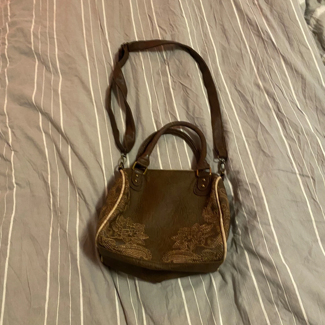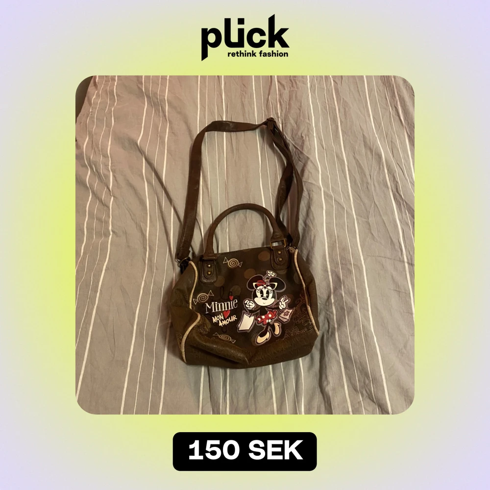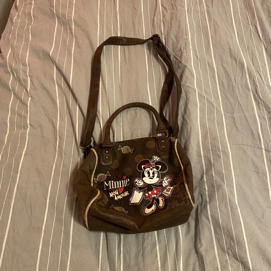 Säljer en superfin brun axelväska med ett gulligt Musse Pigg-motiv och texten 'Mon Amour'. Väskan har både handtag och en justerbar axelrem. Perfekt för vardagsbruk eller som en rolig accessoar till din outfit!
