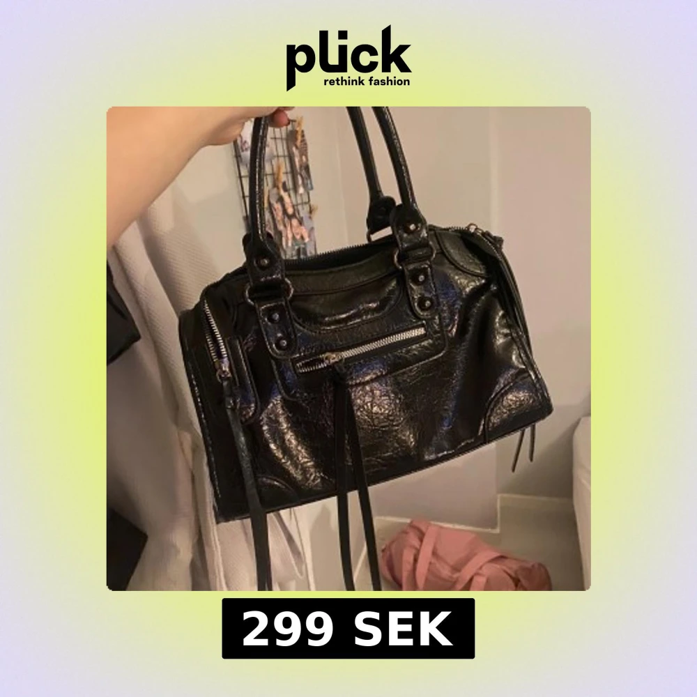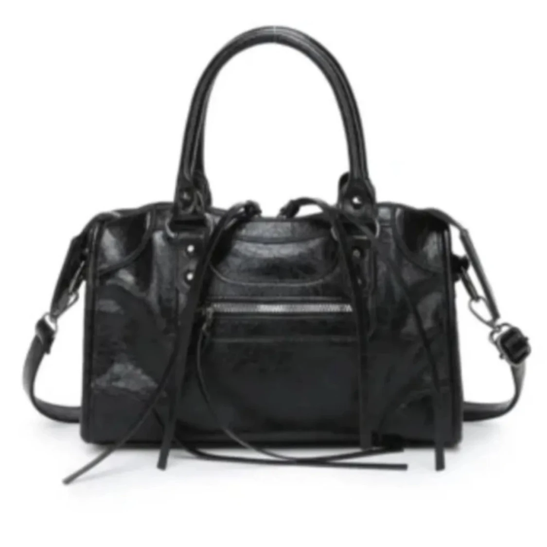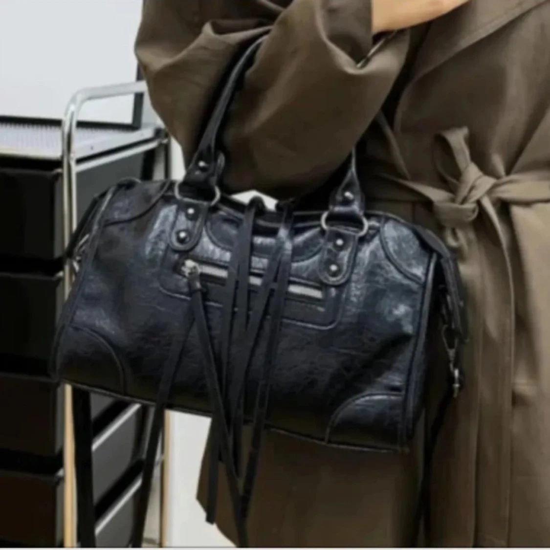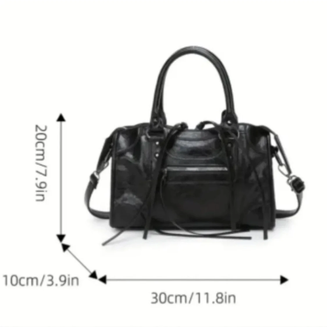 Cool svart handväska i skinn med snygga detaljer som dragkedja framtill och långa dekorativa remmar. Väskan har både handtag och axelrem, så du kan bära den precis som du vill. Mått: 30x20x10 cm. Perfekt storlek för dina viktigaste grejer.