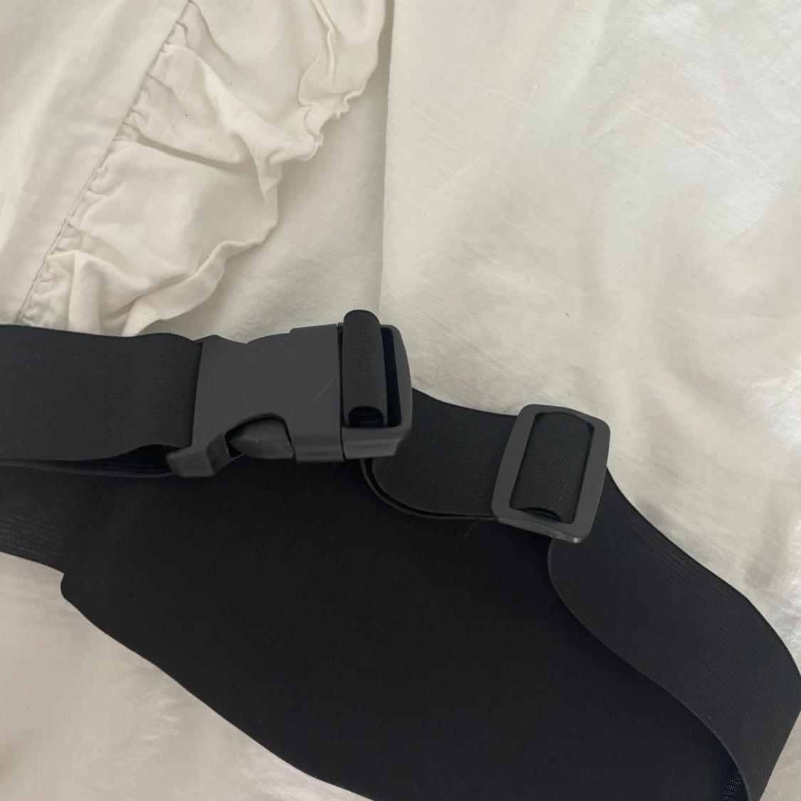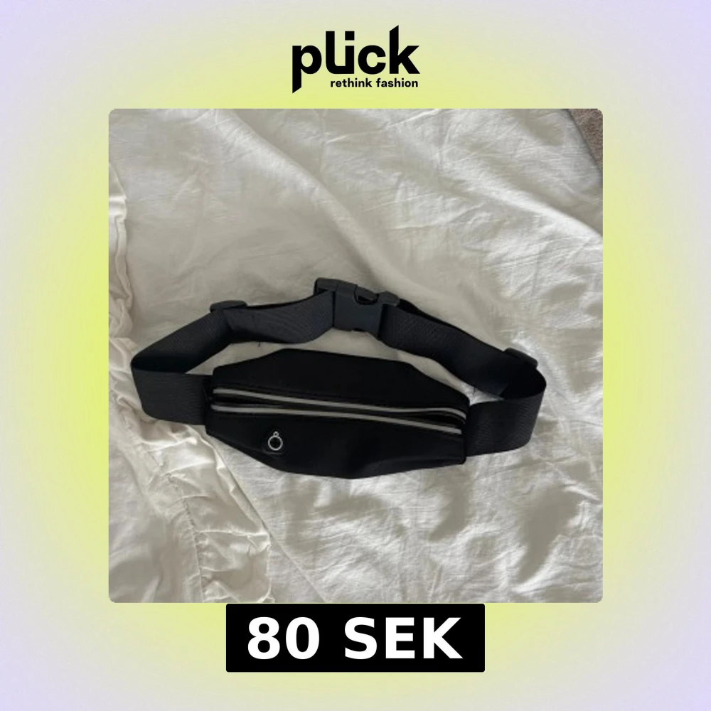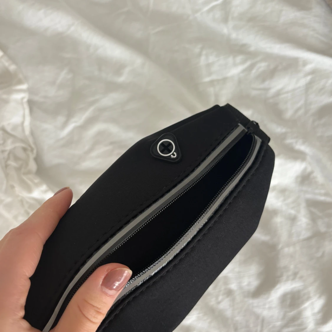 Snygg svart midjeväska med justerbart band och smidig plastspänne. Väskan har en silverfärgad dragkedja och ett litet hål för hörlurar. Perfekt för att ha mobilen och nycklar nära till hands när du är på språng.