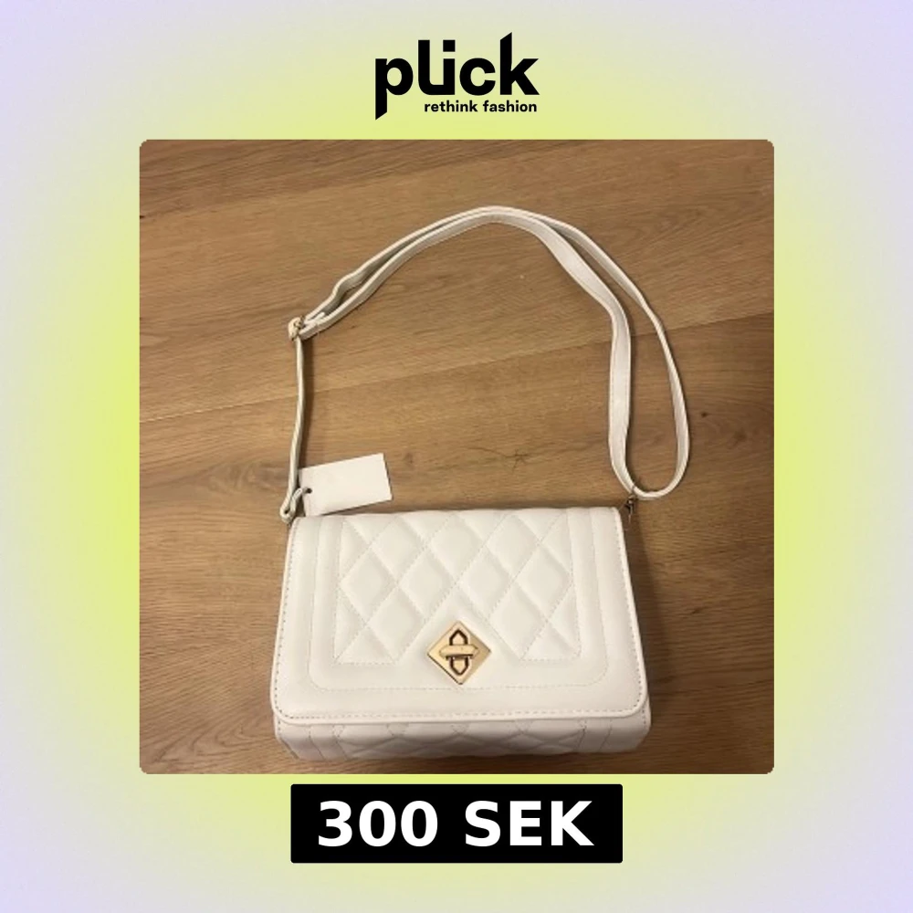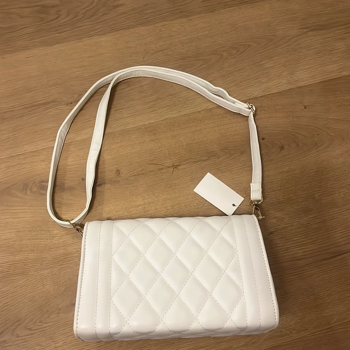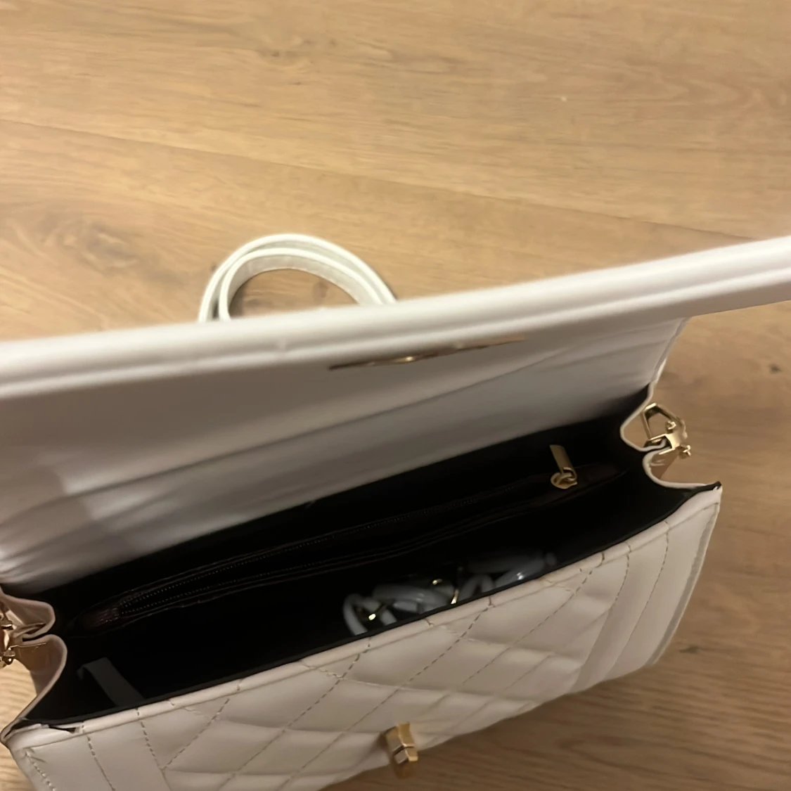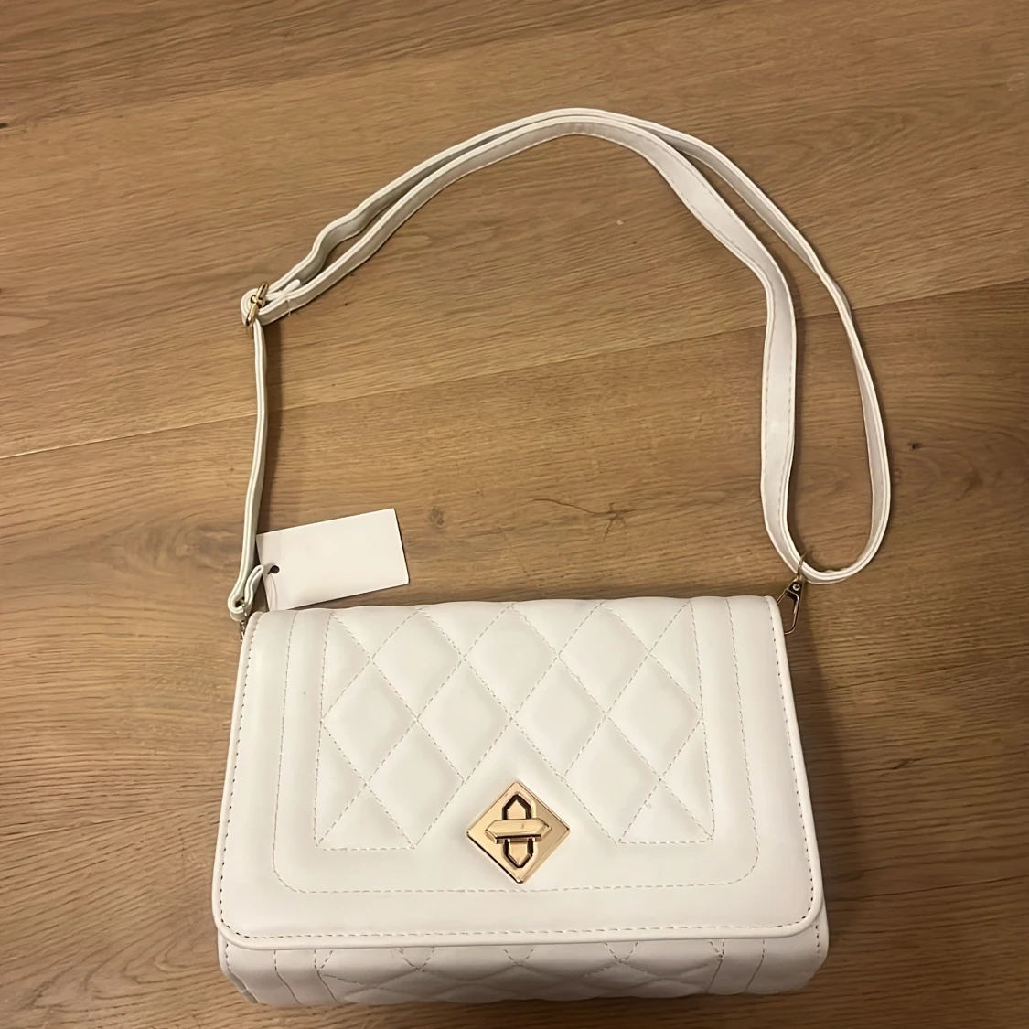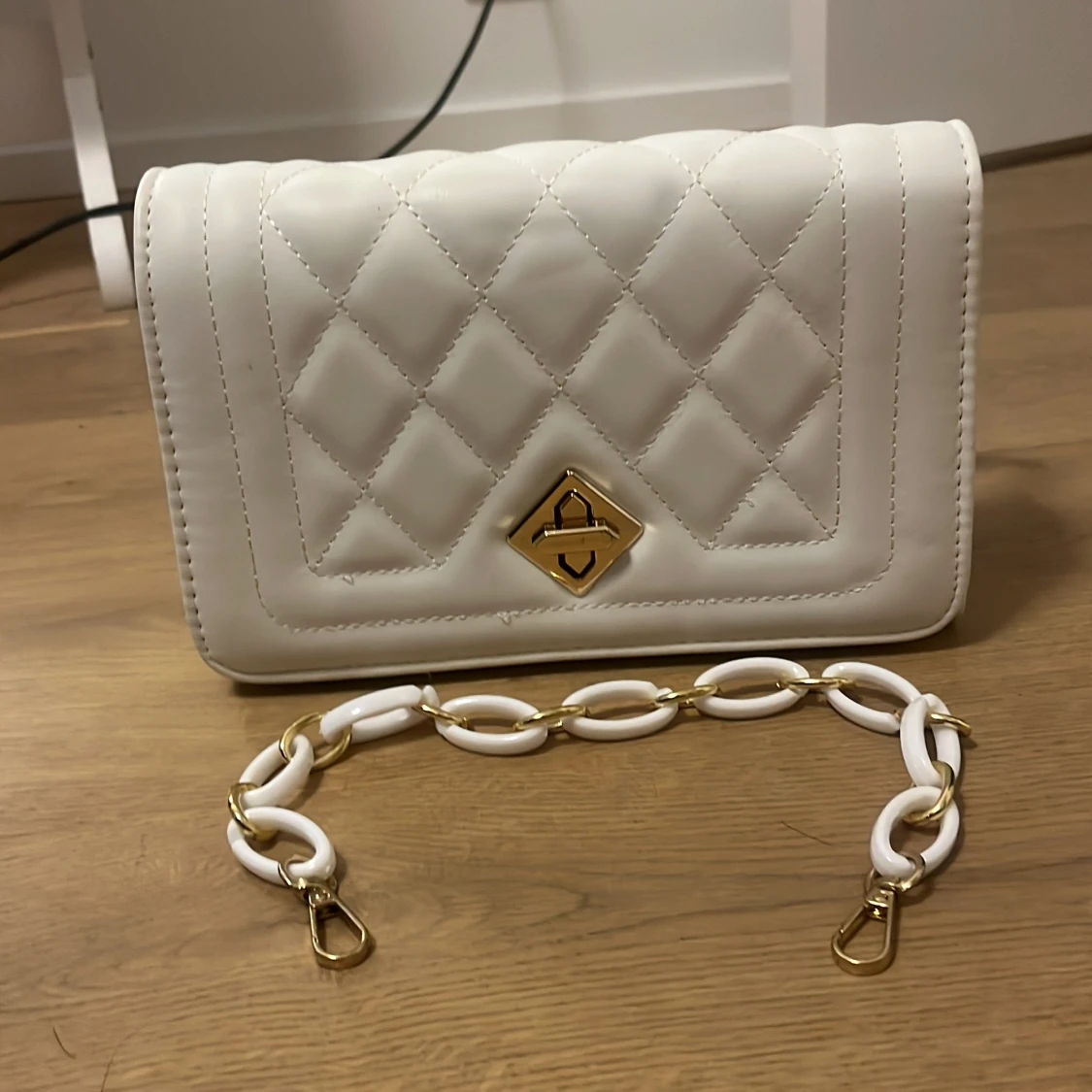 Snygg vit axelväska med quiltat mönster och guldfärgad vridlåsdetalj framtill. Väskan har både justerbar axelrem och en chunky kedja i vitt och guld som kan användas som handtag. Insidan har fack med dragkedja för extra förvaring. Perfekt för att lyfta din outfit. Helt ny och inte använd.