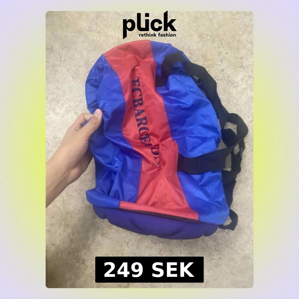 Säljer en FC Barcelona ryggsäck i blått och rött med klubbens logga på framsidan. Väskan har en fotbollsinspirerad form på locket och justerbara svarta axelremmar. Materialet är slitstark polyester och väskan har dragkedja upptill.