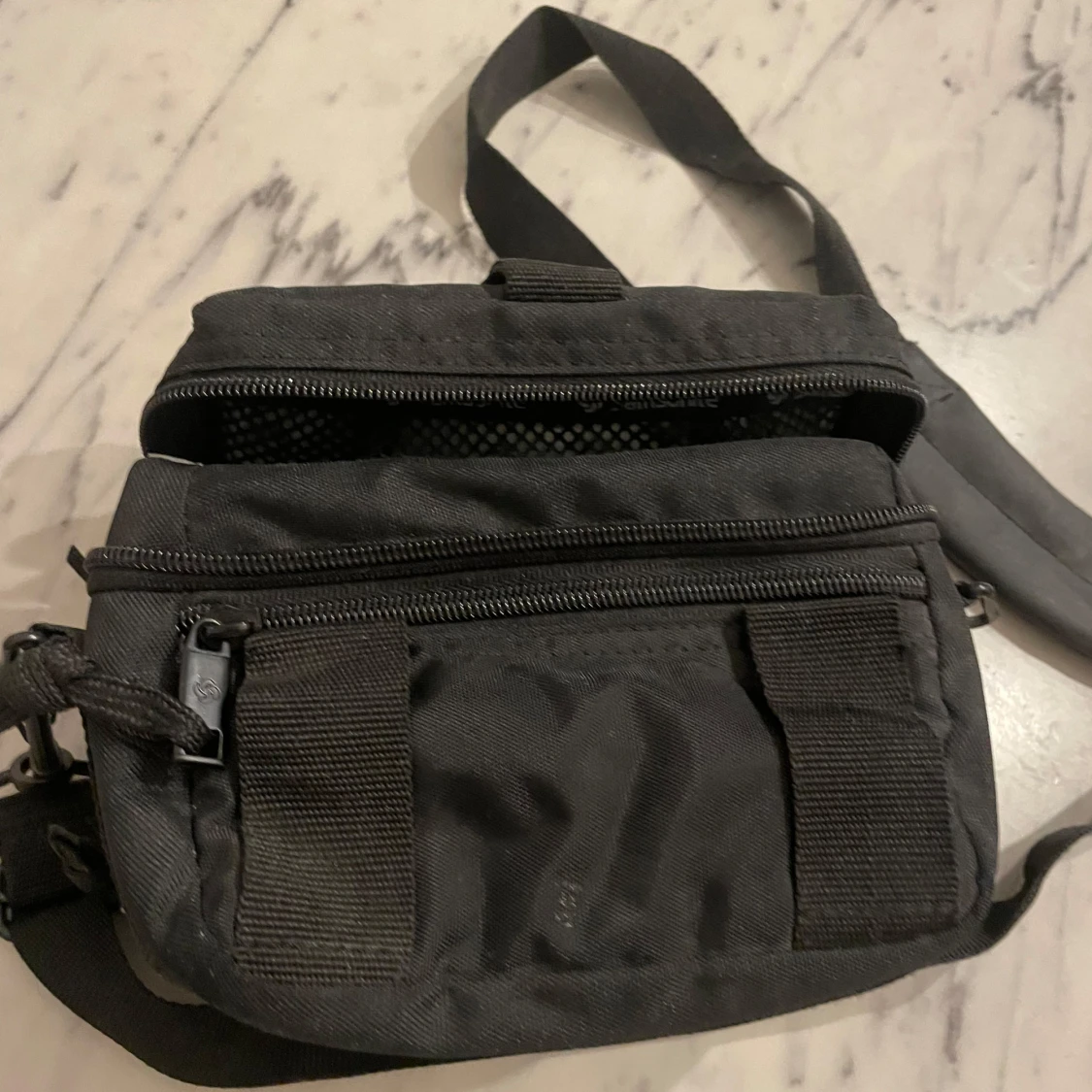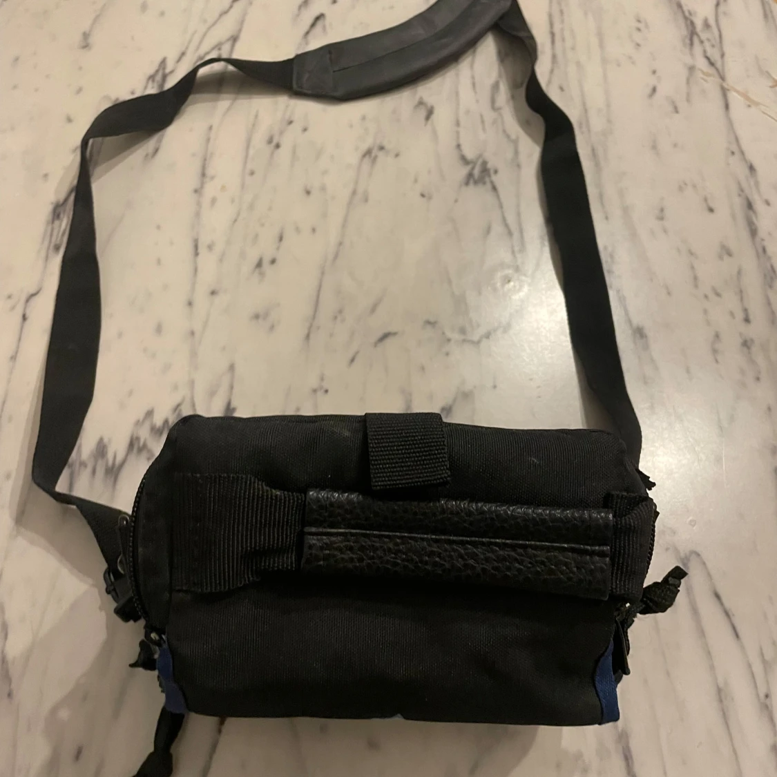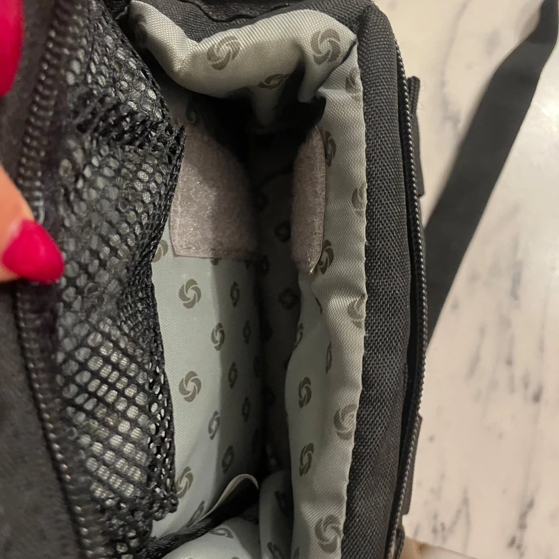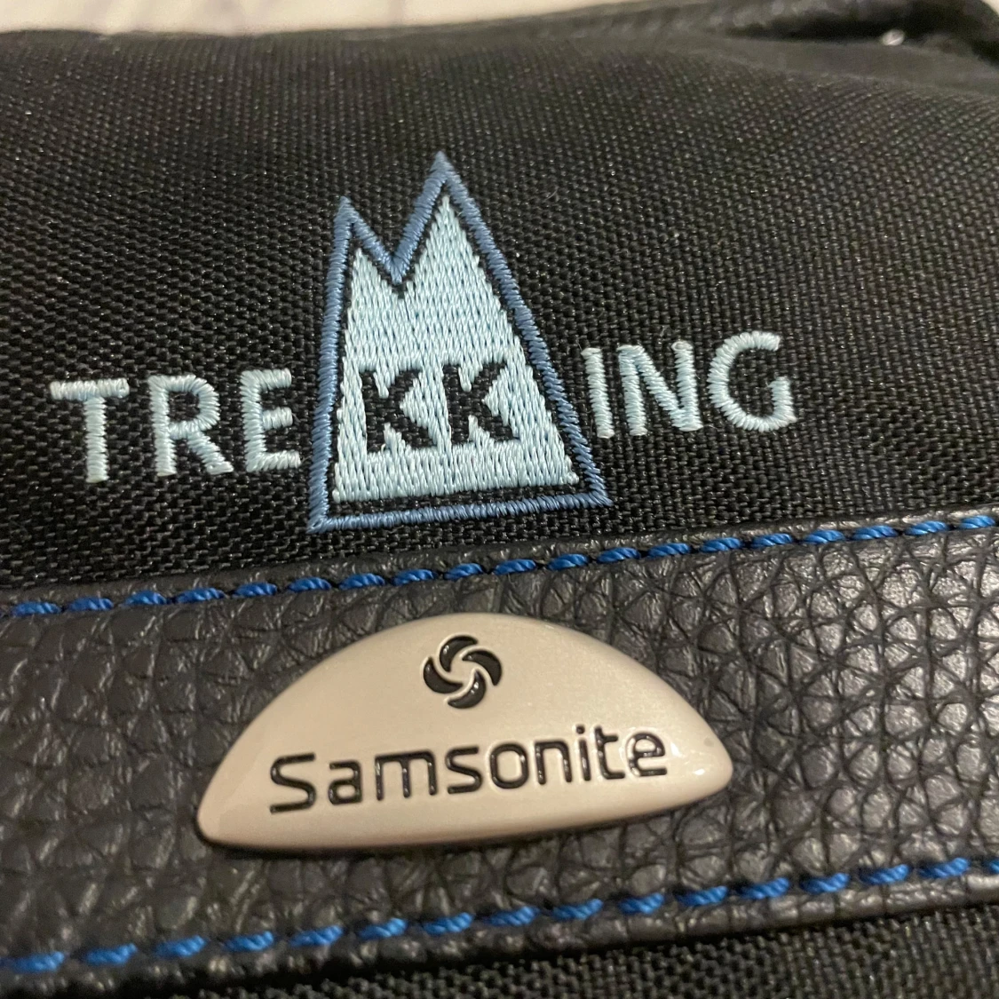 Säljer en svart axelväska från Samsonite med broderad trekking-logga. Väskan har justerbar axelrem, detaljer i blått och svart konstläder samt flera fack och meshficka inuti. Perfekt för dig som vill ha en smidig och sportig väska till vardagsäventyr.