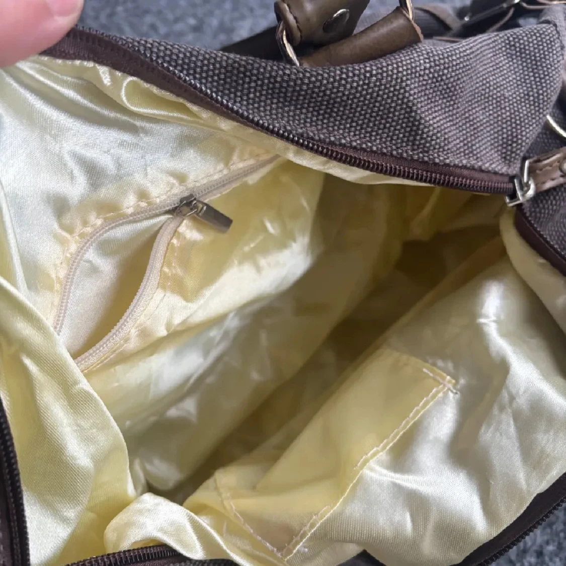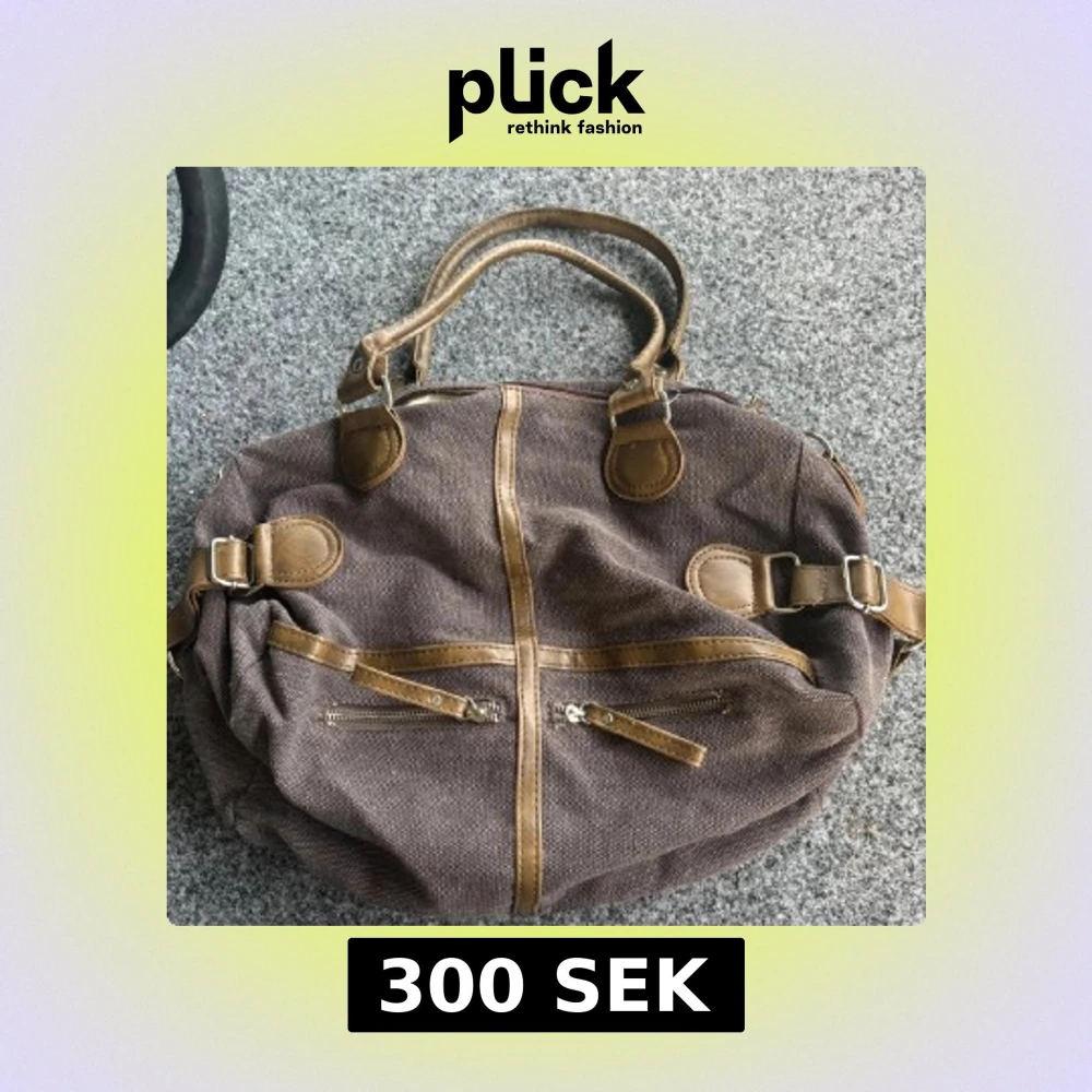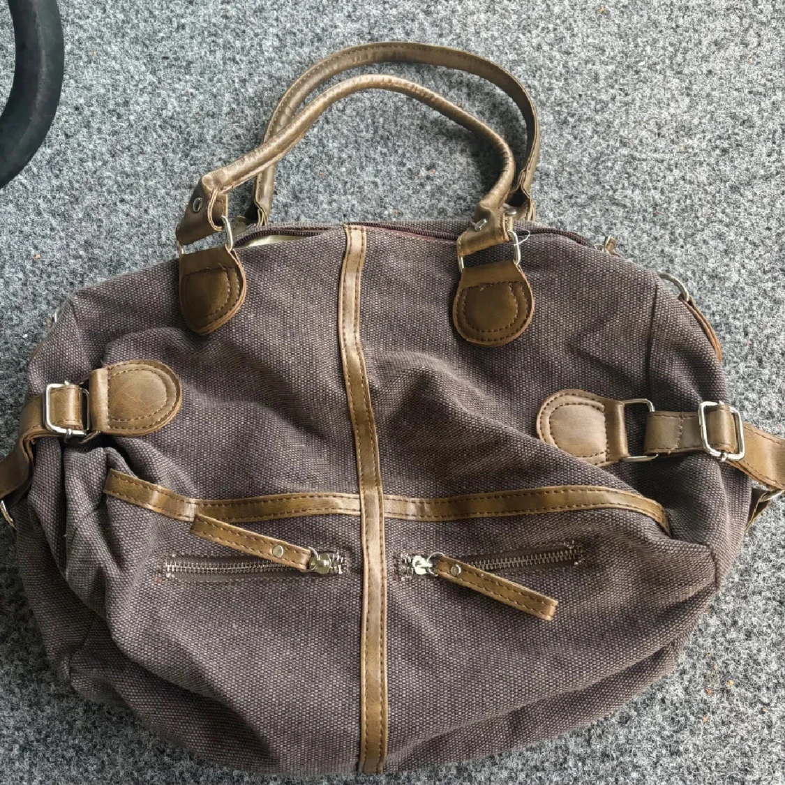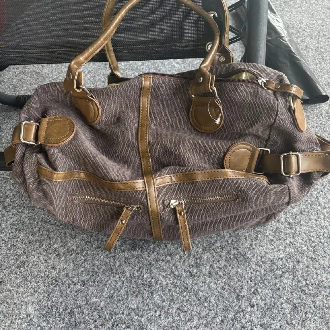Rymlig brun handväska i canvas med detaljer och handtag i brunt skinn. Väskan har två dragkedjefickor framtill, justerbara spännen på sidorna och ett ljust, glansigt innerfoder med innerficka. Perfekt för dig som vill ha en snygg och praktisk väska till vardagen. Endast swish betalning skickas spårbart 59kr