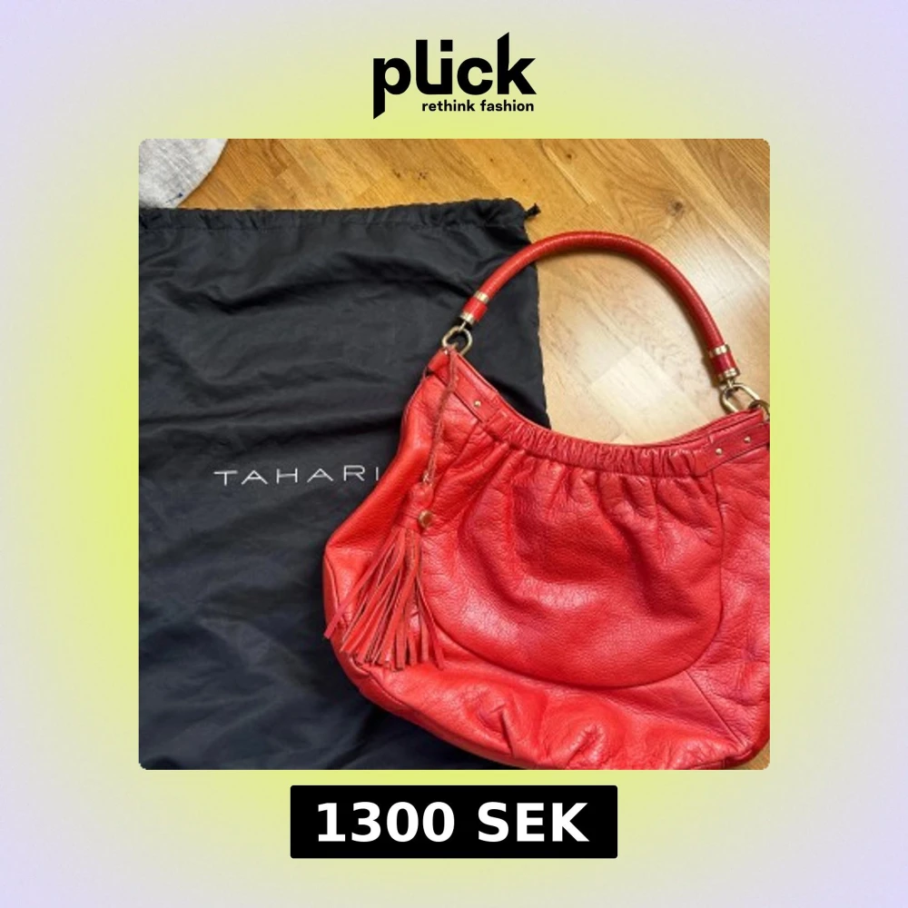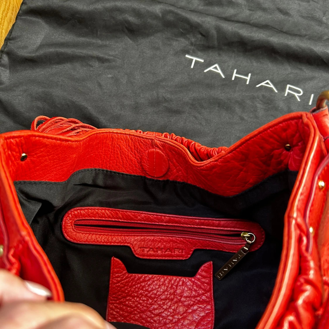 Snygg röd/orange/korall axelväska från Tahari i mjukt skinn med en bred axelrem och coola gulddetaljer. Väskan har en stor tofs som hänger på sidan och ett rymligt innerfack med dragkedja. Perfekt för dig som vill ha en färgstark accessoar med plats för allt du behöver.