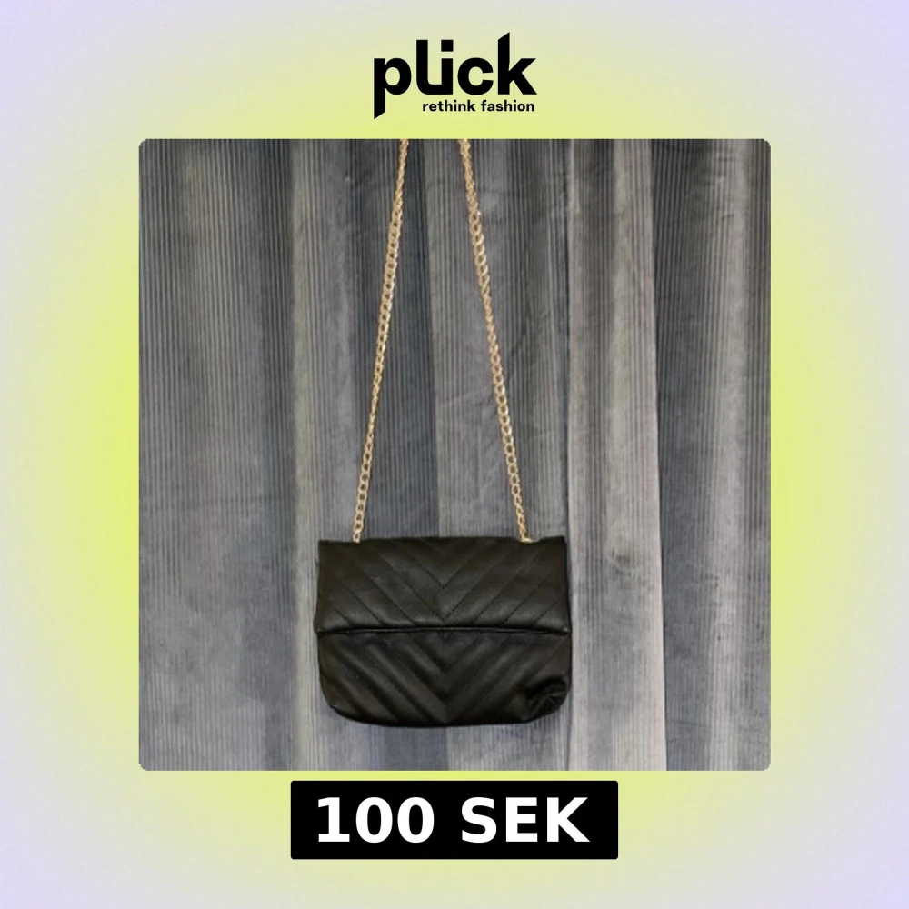 Svart axelväska med design och guldfärgad kedja som axelrem. Knapp som öppning till väskan.