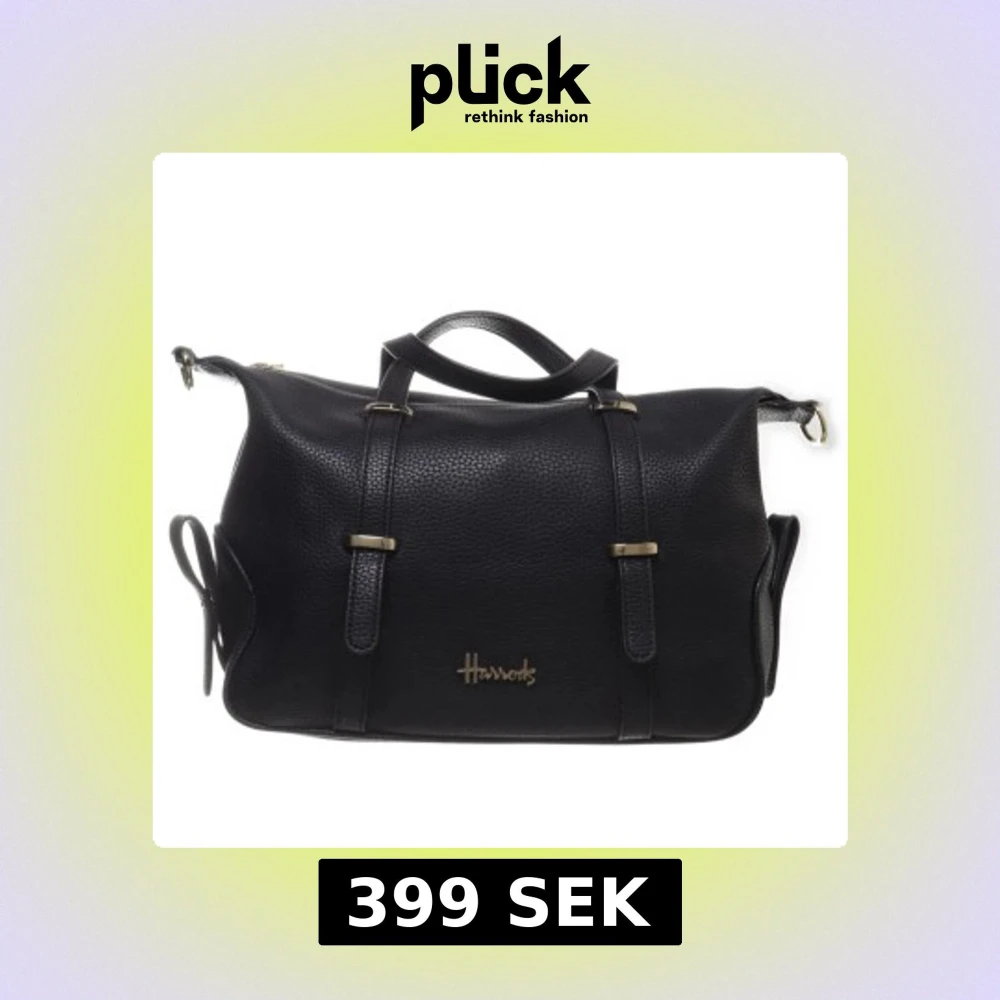 Snygg och rymlig svart weekendväska från Harrods i strukturerat skinn med guldfärgade metalldetaljer. Väskan har dubbla handtag och dekorativa remmar framtill. Perfekt för resor eller när du behöver extra plats.