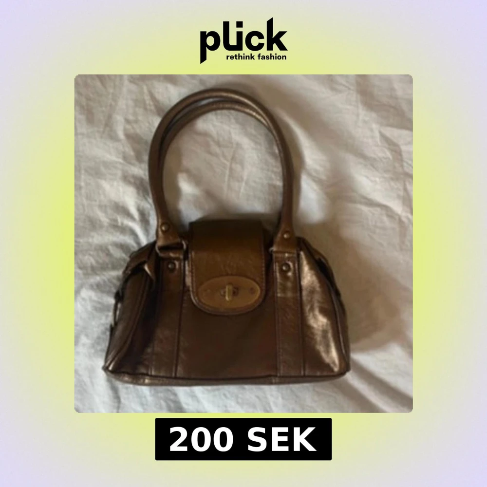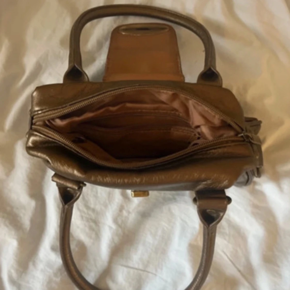 Snygg brun handväska i skinn med två rejäla handtag och klassisk form. Väskan har lock med vridspänne i guldton och flera fack inuti, inklusive dragkedja. Perfekt storlek för det viktigaste och ger en cool vintage vibe.