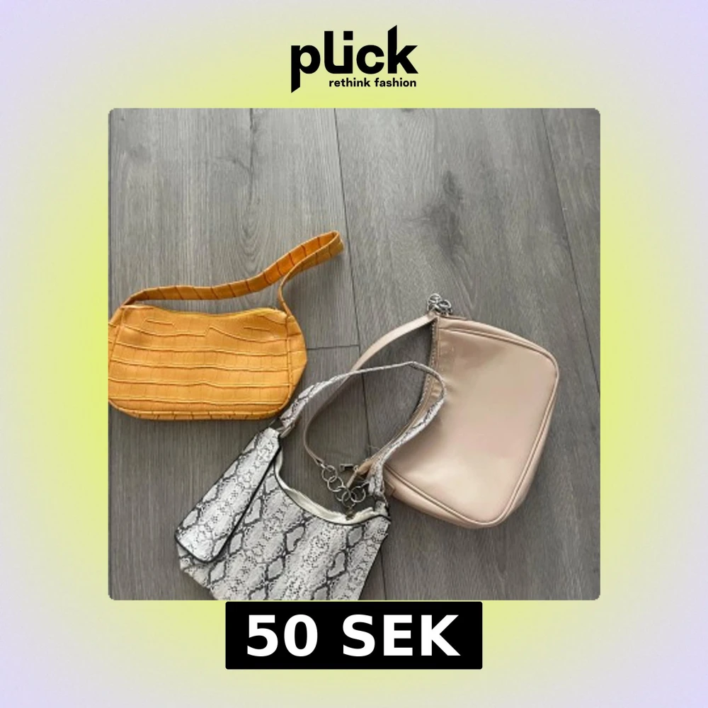 Tre snygga axelväskor: en gul med croco-mönster, en beige i glansigt material och en vit med ormmönster och silverdetaljer. Perfekta för att lyfta din outfit och rymmer det viktigaste du behöver ha med dig.