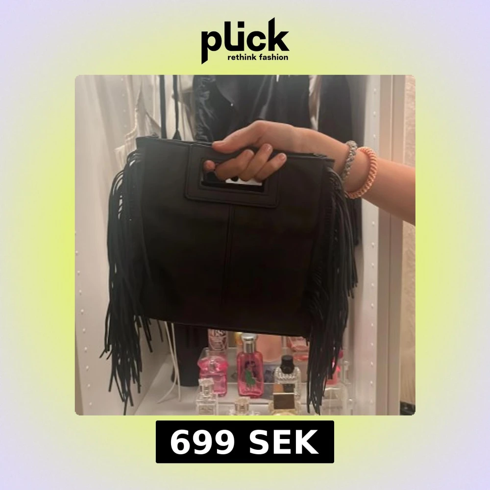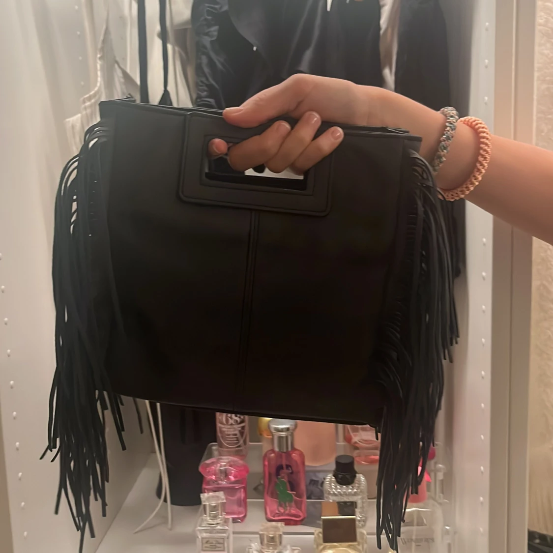 Snygg svart handväska i skinnimitation med rektangulärt handtag och långa fransar på sidorna. Väskan har en stilren design och är rymlig inuti, perfekt för att bära med sig det viktigaste. Passar dig som gillar trendiga detaljer och en edgy look.
