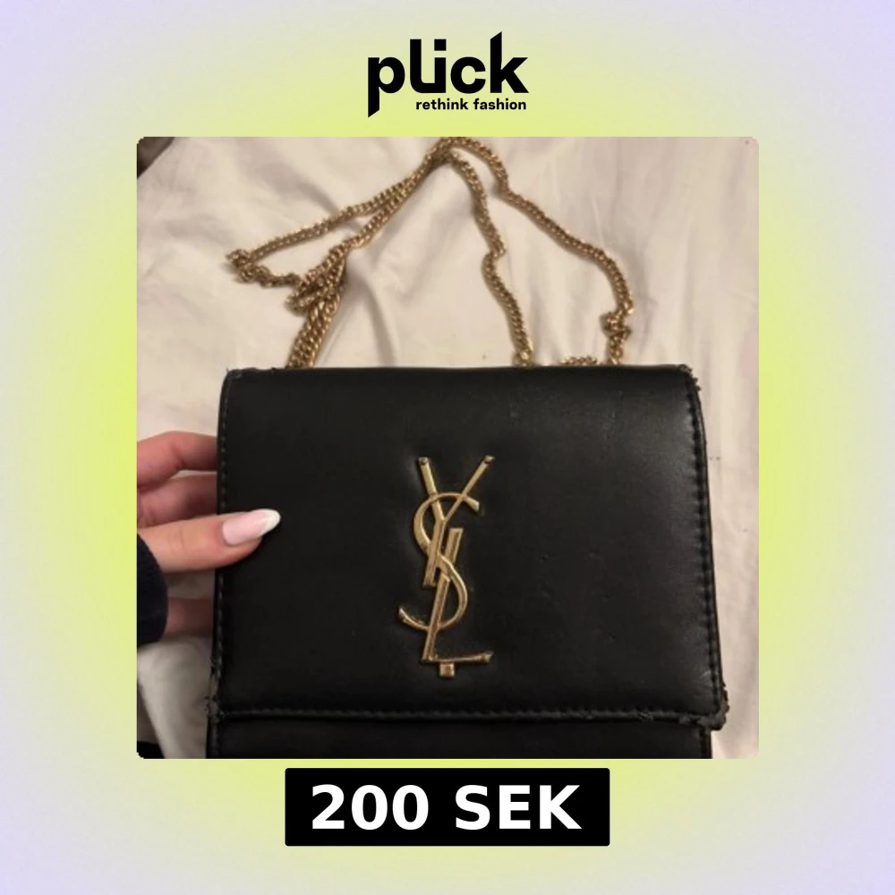 Snygg svart axelväska med guldfärgad kedja och klassisk YSL-logga framtill. Väskan är i slät skinnimitation och har ett huvudfack med dragkedja inuti. Perfekt storlek för det viktigaste och enkel att bära över axeln.