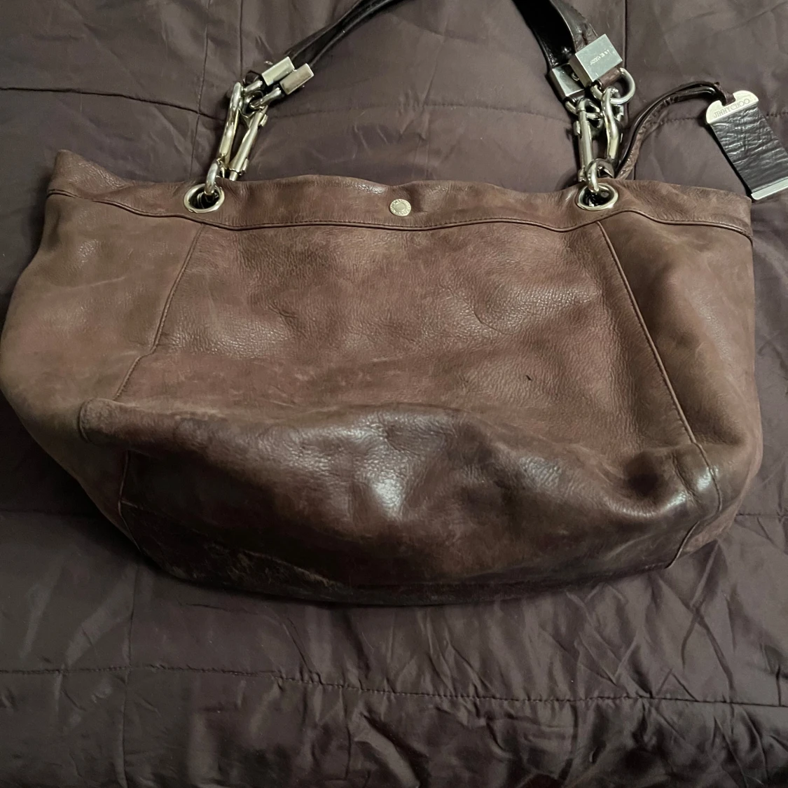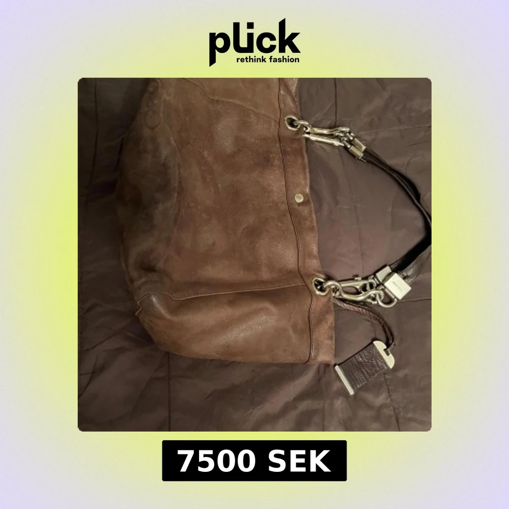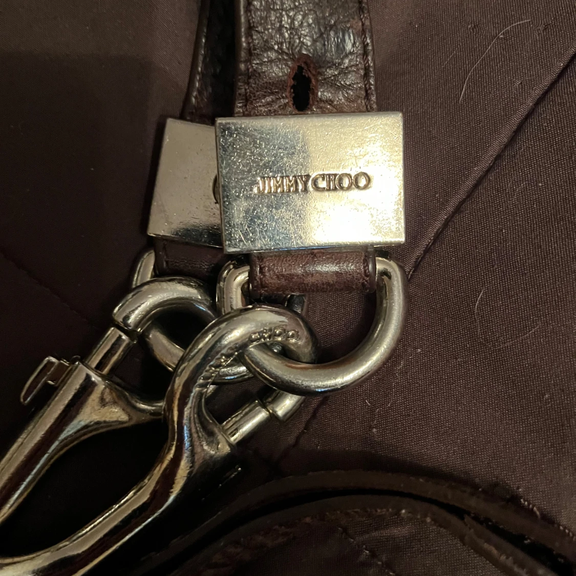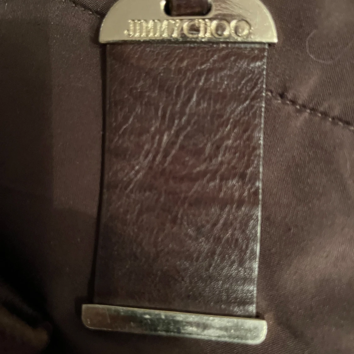 Snygg brun skinnväska från Jimmy Choo med robusta metallspännen och detaljer. Perfekt för att bära dina dagliga nödvändigheter med stil. Väskan har en rymlig design och en elegant look.