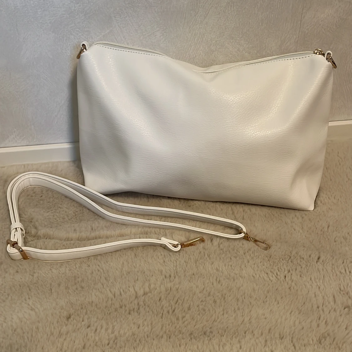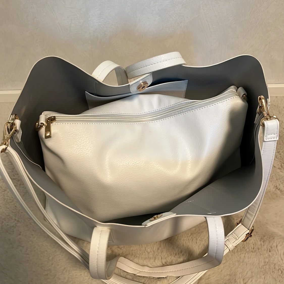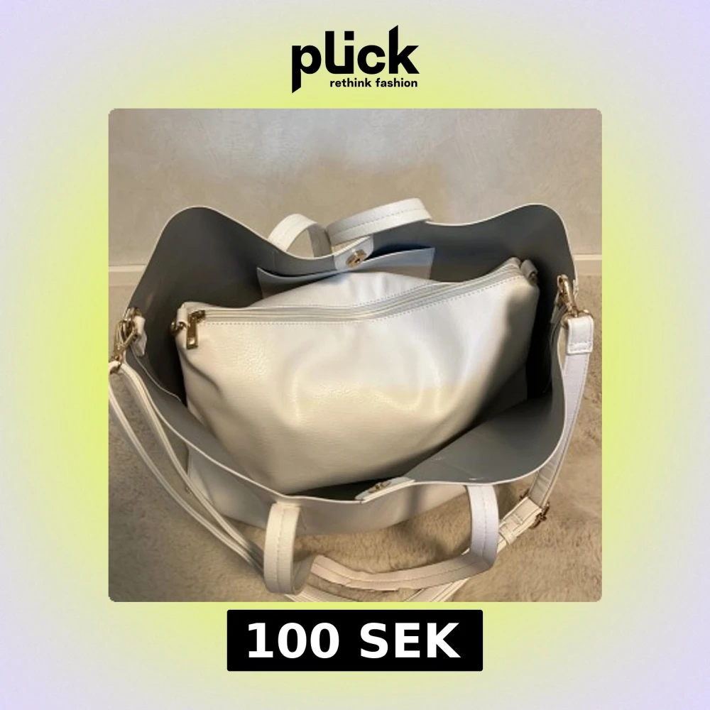 Säljer en stor vit shoppingväska med matchande, oanvänd, ”innerväska” i syntetmaterial. Shoppingväskan har två handtag och enkel design, medan den minde fungerar mer som en necessär med dragkedja. Finns även ett justerbart axelband som fungerar att sätta på både den större och mindre väskan. Shoppingväskan har många skavanker och ser väldigt använd ut men fungerar bra. Den lilla är helt oanvänd och lika så axelremmen.
