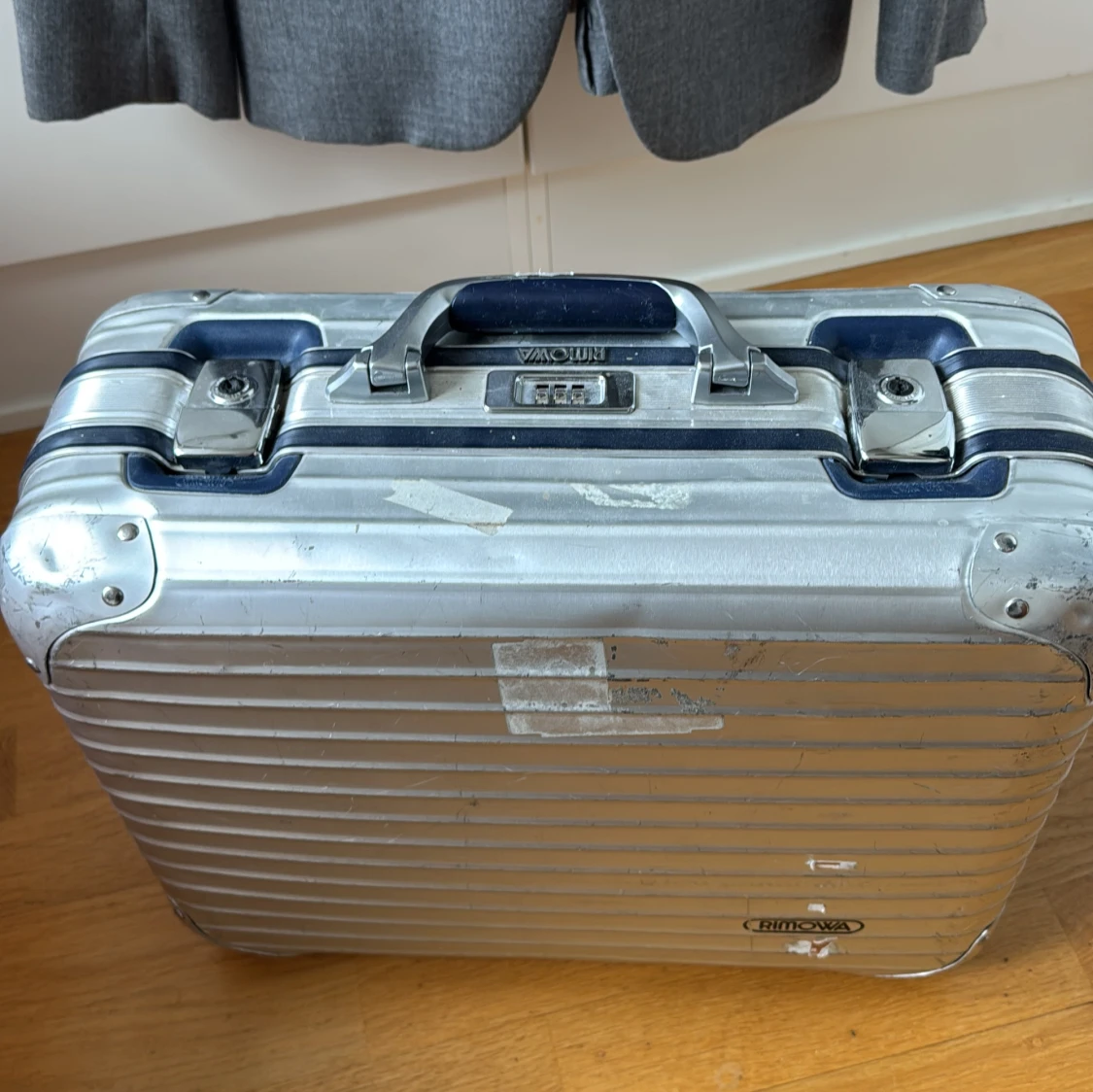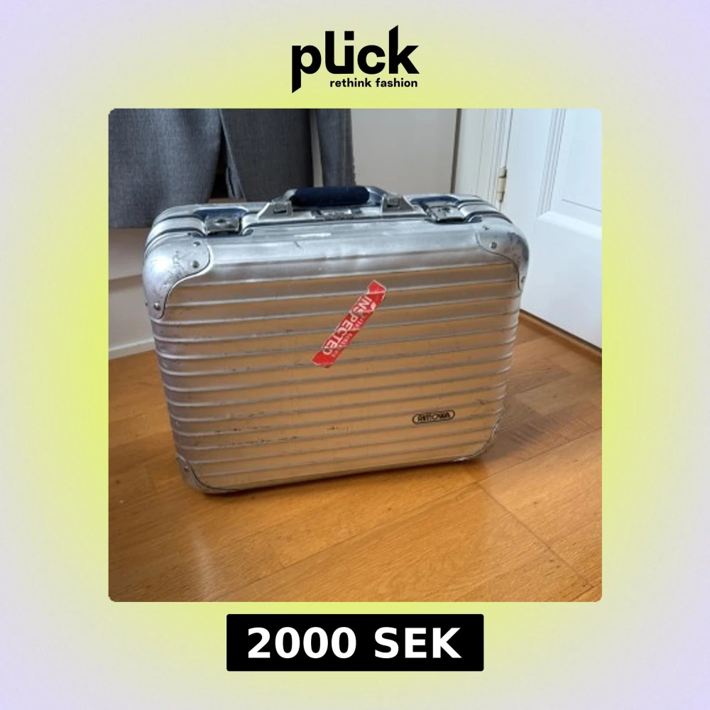 Säljer en stilren och robust resväska från Rimowa i silverfärgad aluminium. Insidan är blå med mönster och har justerbara remmar för att hålla packningen på plats. Ena spännet knäpper inte lika bra som det andra men fullt funktionabel. Nycklar finns ej