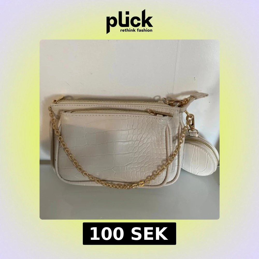 Snygg beige axelväska med krokodilpräglat mönster och guldfärgad kedjedetalj. Väskan har flera fack med dragkedja och en justerbar axelrem. Perfekt för att hålla ordning på dina saker med stil.