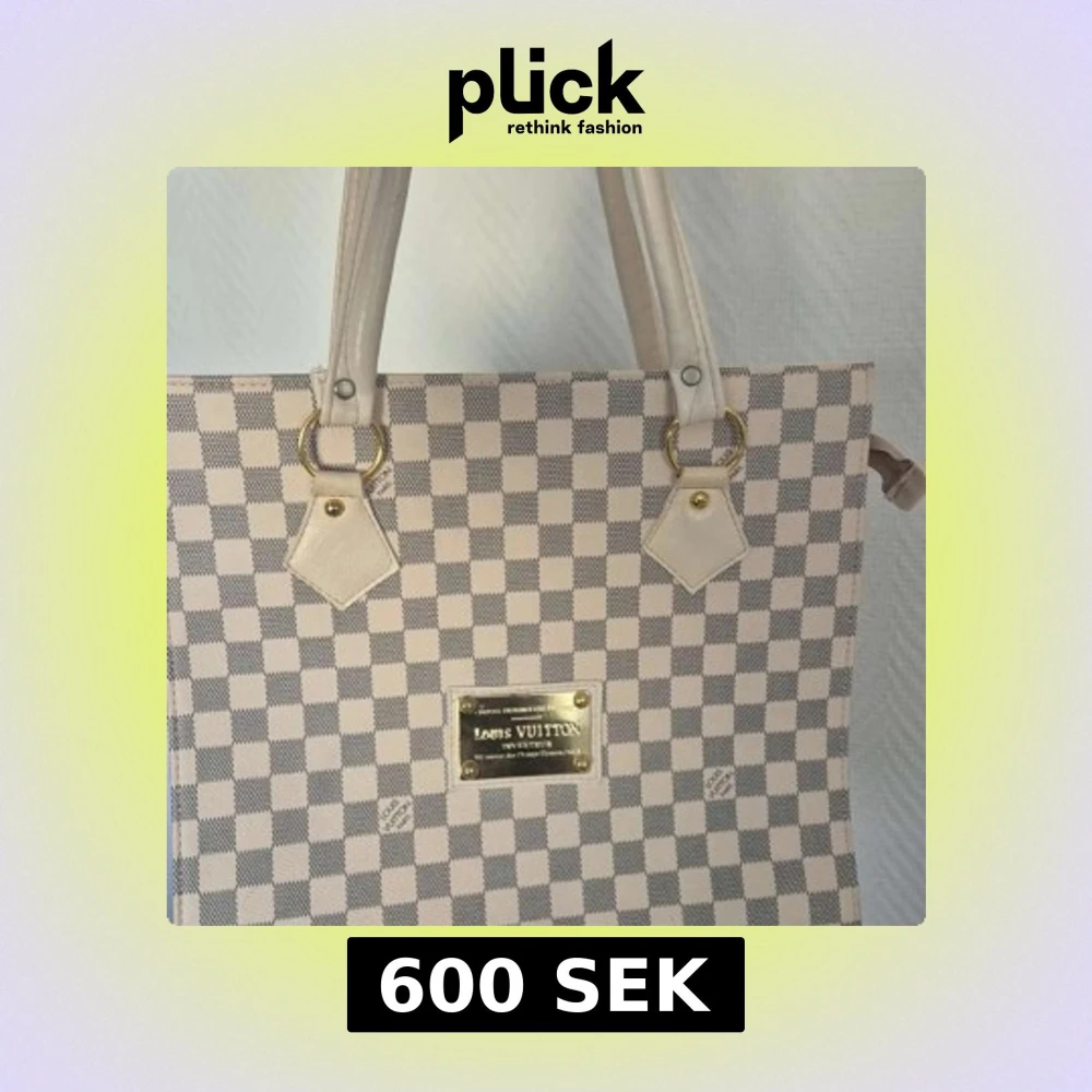 Säljer en stilren handväska med ett klassiskt rutigt mönster i beige och grått. Väskan har eleganta handtag och en metallplatta med logotyp på framsidan. Perfekt för att ge din outfit en lyxig touch.
