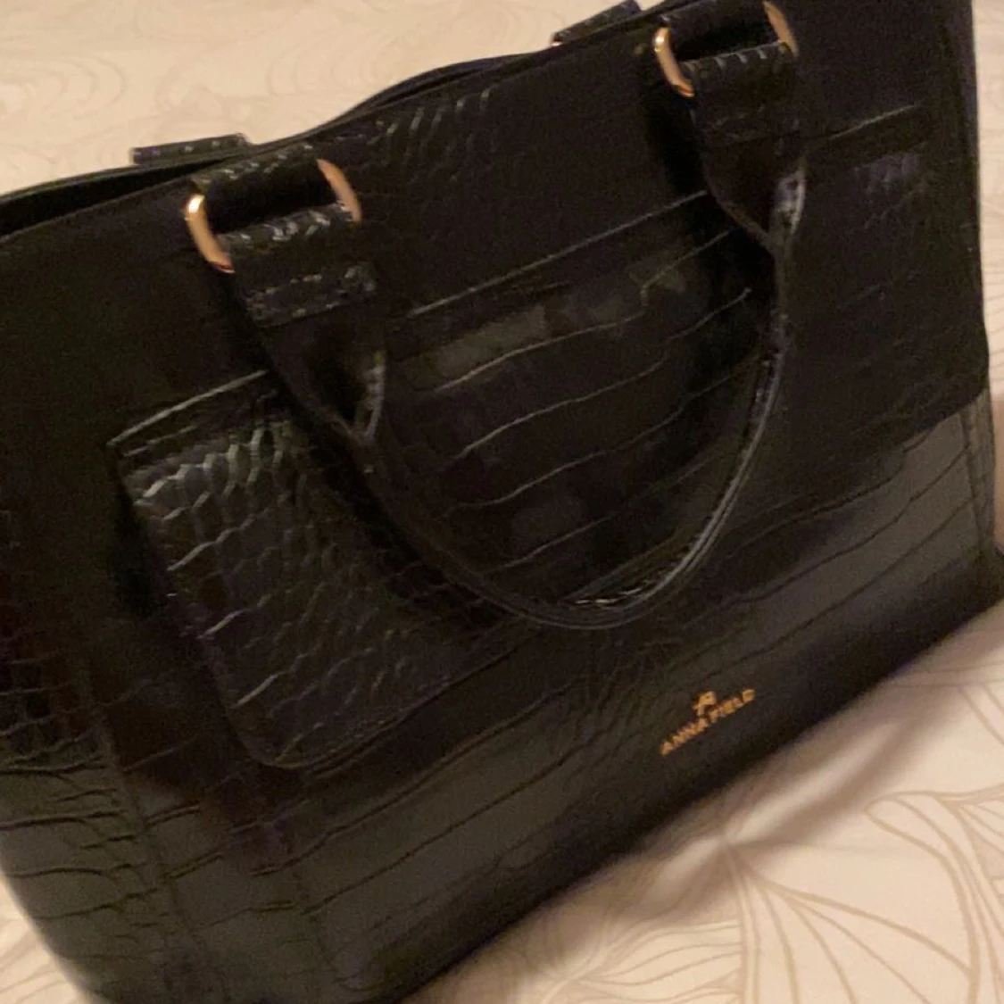 Svart ganska stor handväska med ormskinnstryck. Bra skick