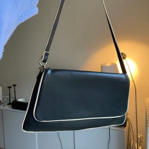 Svart axelväska i skinnimitation med benvita kanter, supersnygg verkligen men får inte användning för den💕 köpt för 250kr förra året❤️