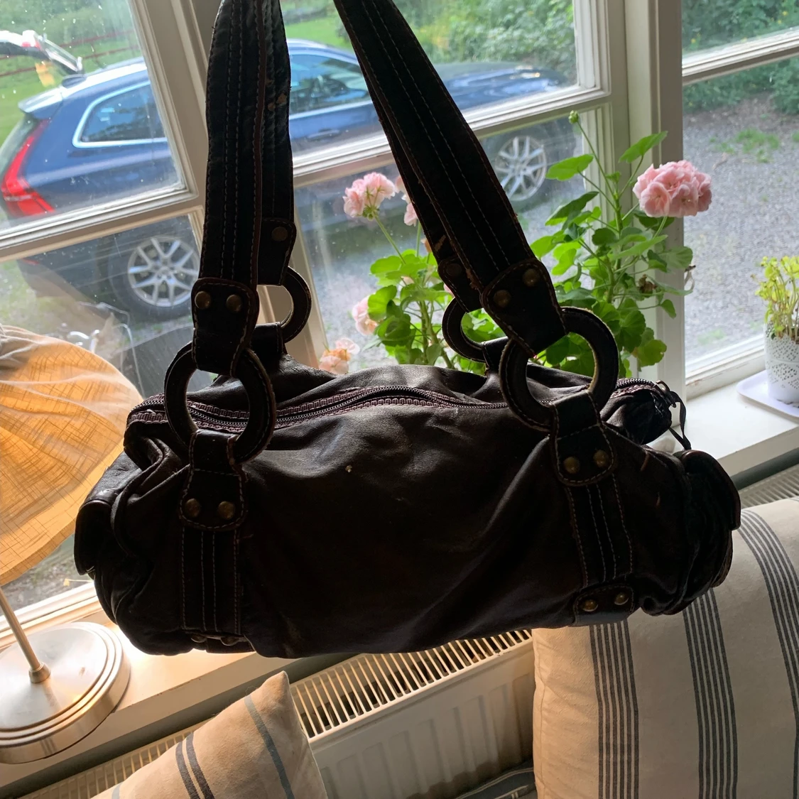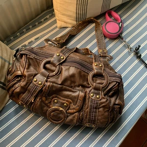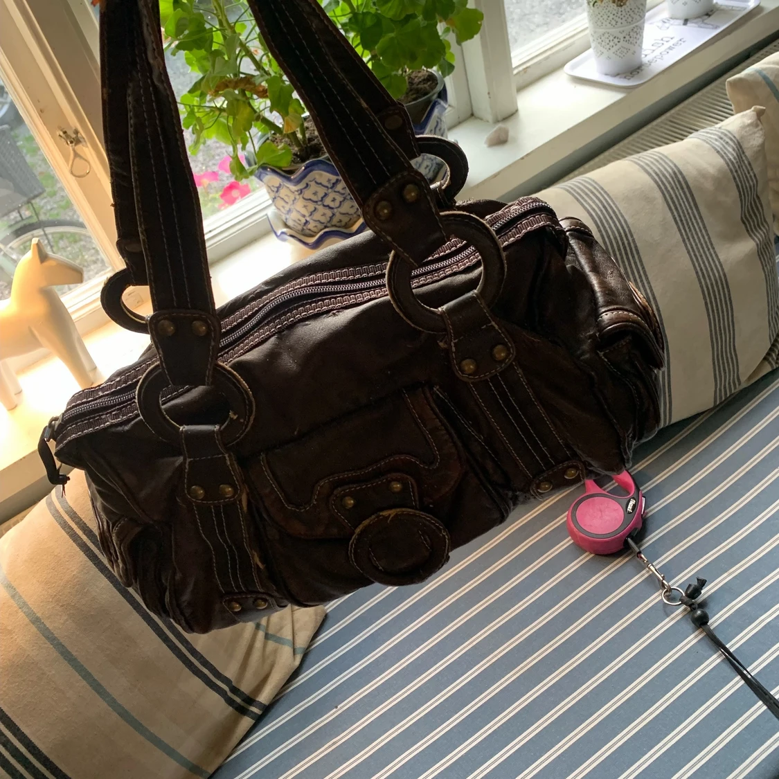 Super snygg brun läderväska med 2000s stil😮💨😍däremot flagnar den lite som ni kan se på första bilden. Ganska rymlig för sin storlek dessutom❤️