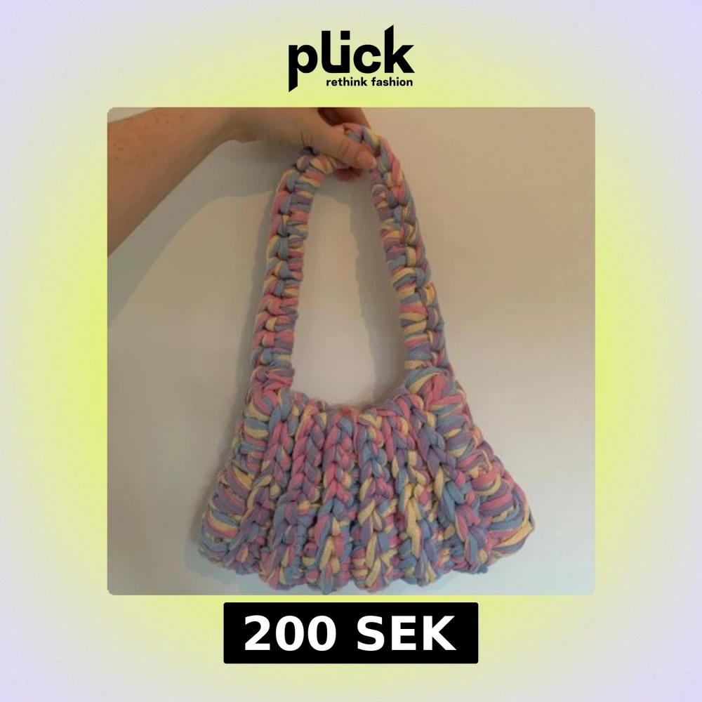 Superfin axelväska i chunky virkat material med breda flätor. Väskan har pastelliga färger i lila, rosa, blått och gult och en mjuk, handgjord känsla. Perfekt storlek för det viktigaste och ger en färgklick till din outfit.