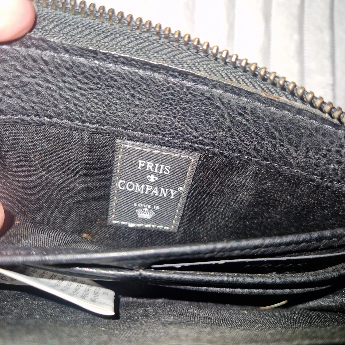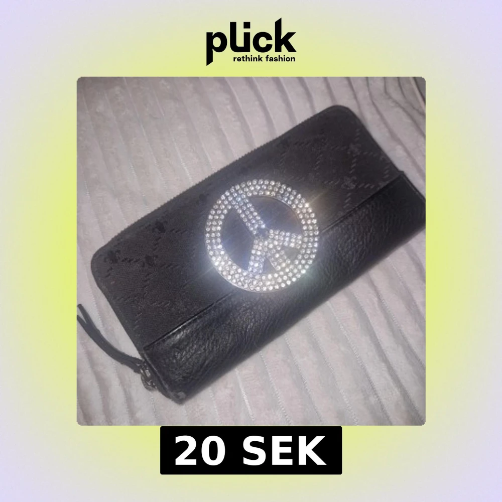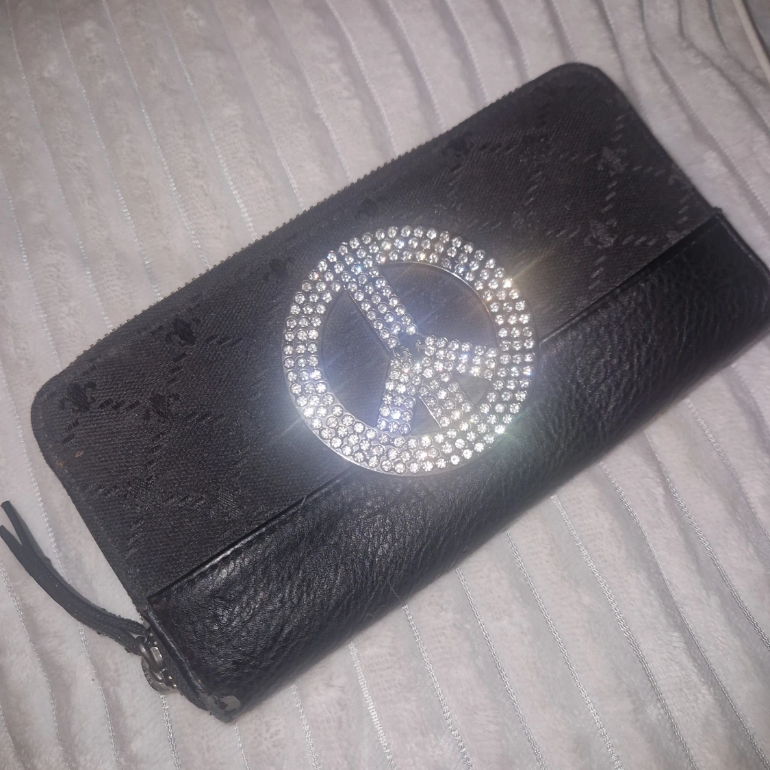 Svart plånbok från Friis & Company i skinn med dragkedja runtom och flera fack för kort och mynt. Framsidan har ett stort peace-märke i glittrande stenar som ger en cool vibe. Perfekt storlek för att få plats med allt du behöver. Finns lite små defekter