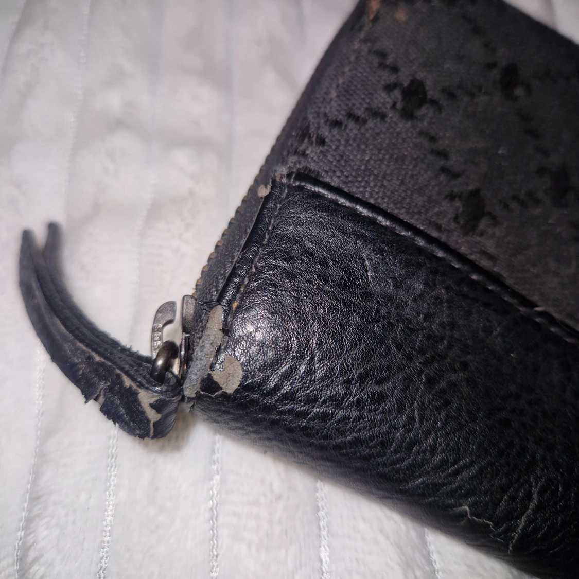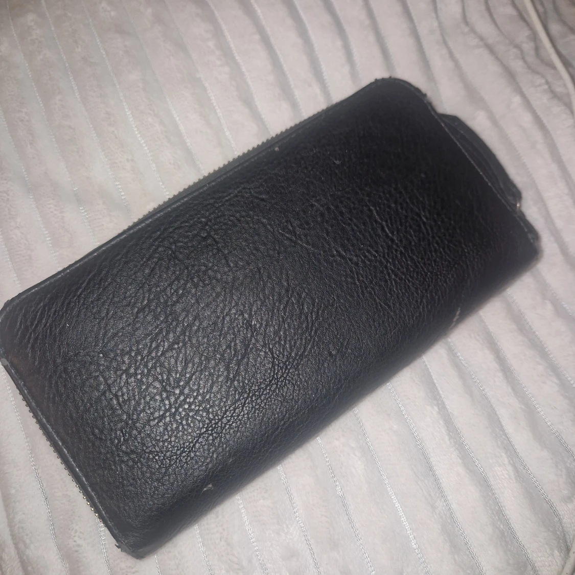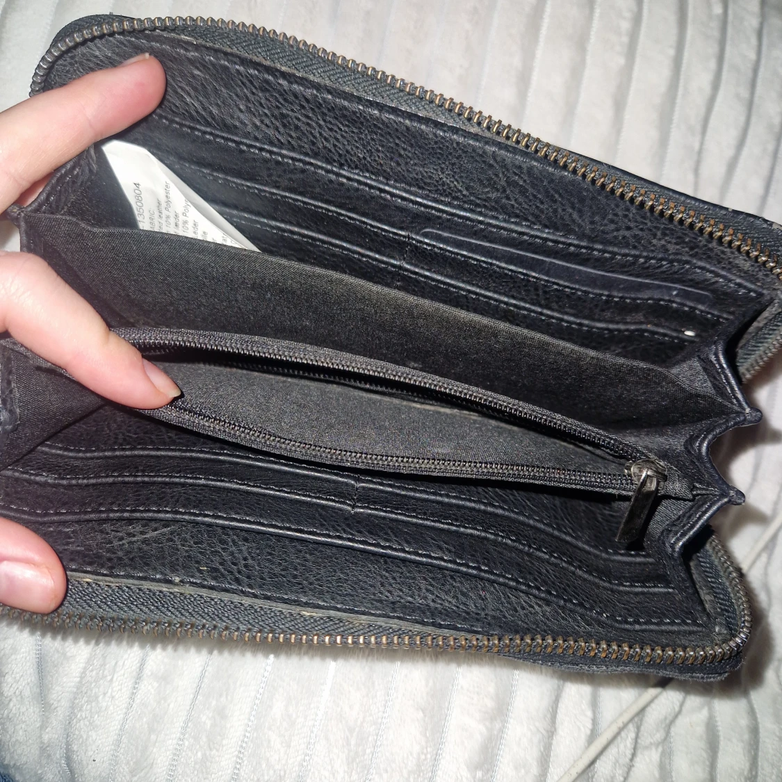 Svart plånbok från Friis & Company i skinn med dragkedja runtom och flera fack för kort och mynt. Framsidan har ett stort peace-märke i glittrande stenar som ger en cool vibe. Perfekt storlek för att få plats med allt du behöver. Finns lite små defekter