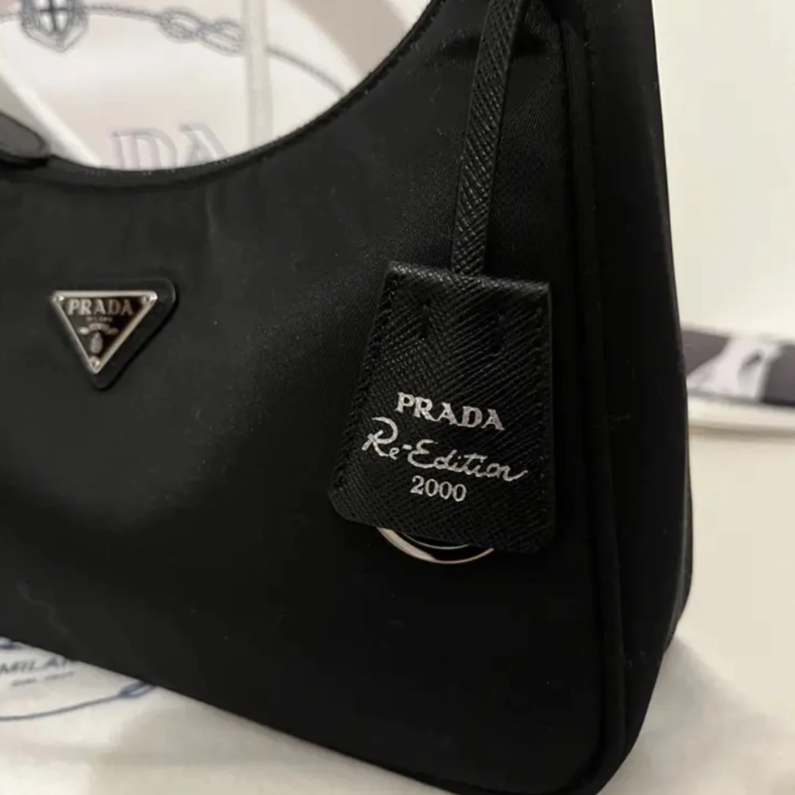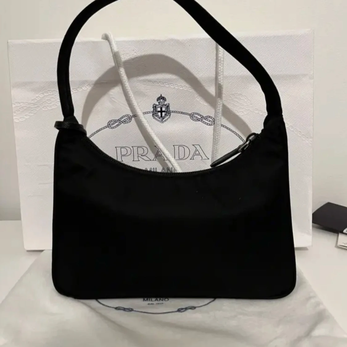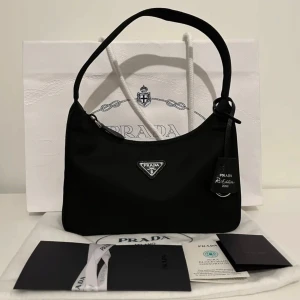 Snygg svart axelväska från Prada Re-Edition 2000. Väskan har en stilren design med Pradas ikoniska logotyp på framsidan. Perfekt för att ge en touch av lyx till din outfit. Nypris 19000kr kvitto medföljer