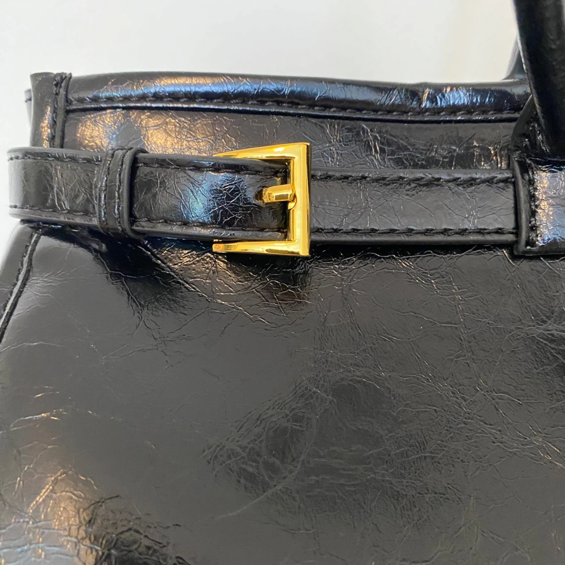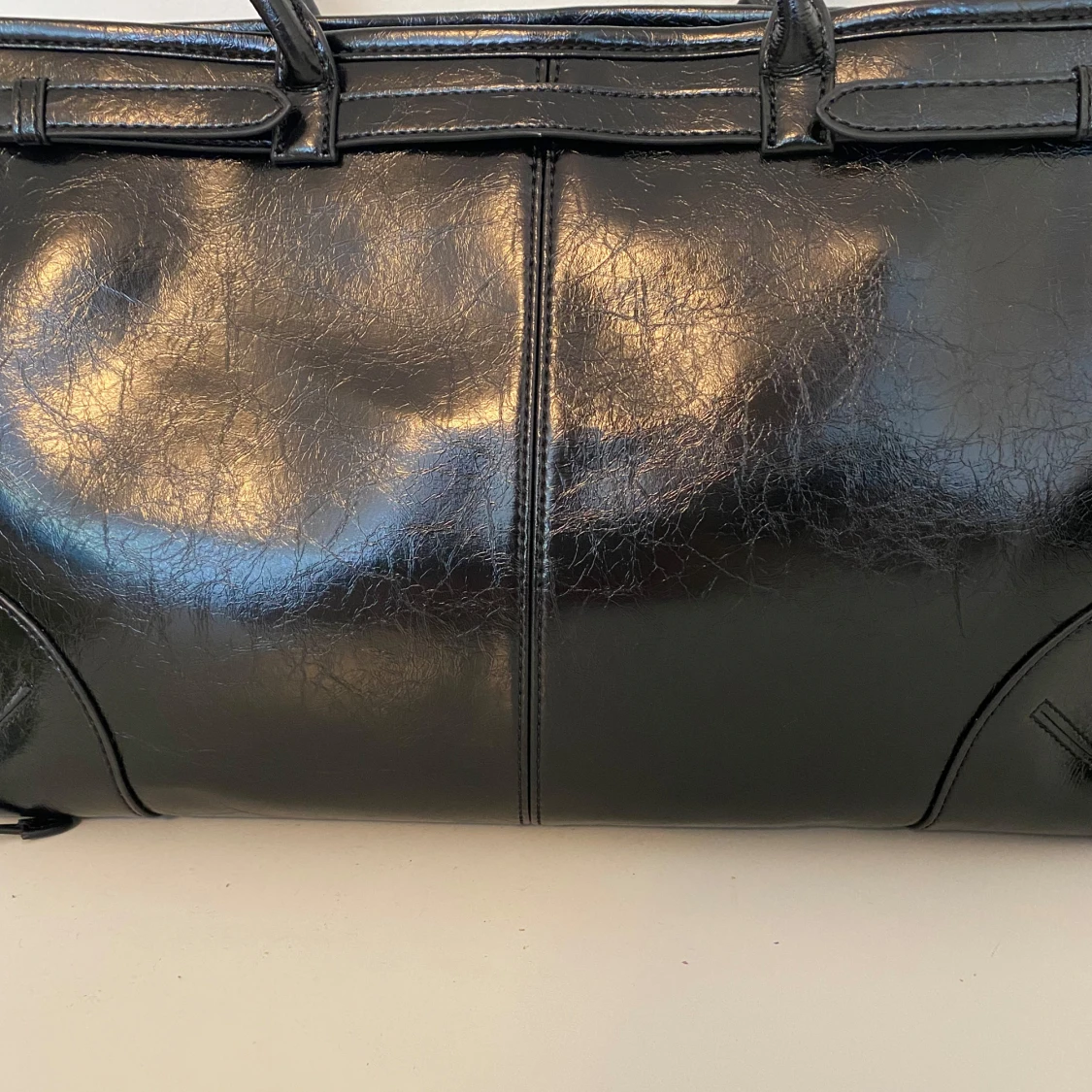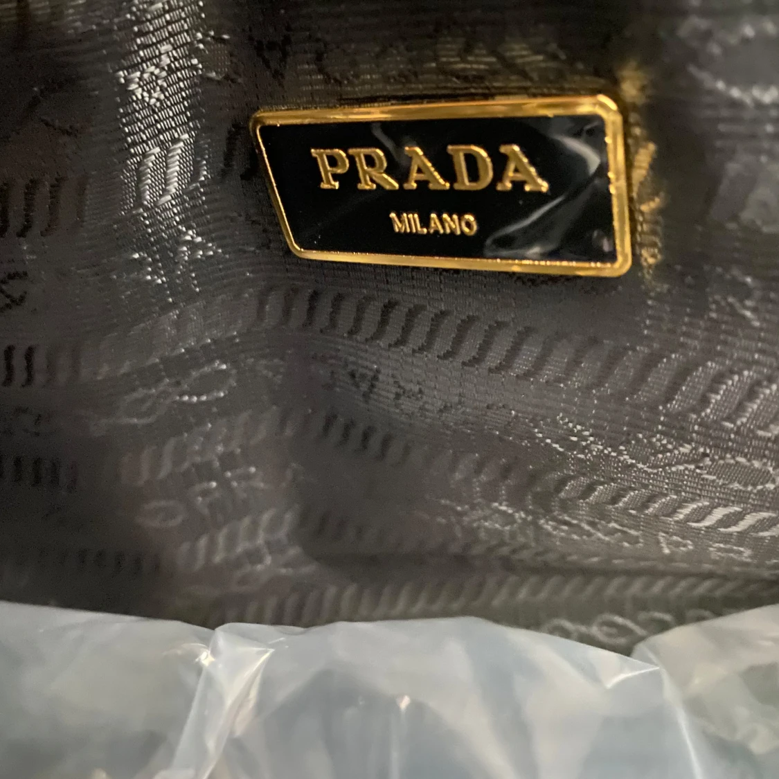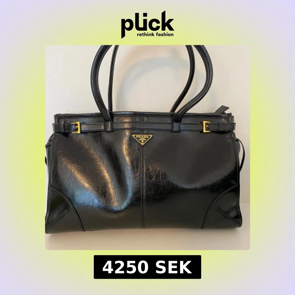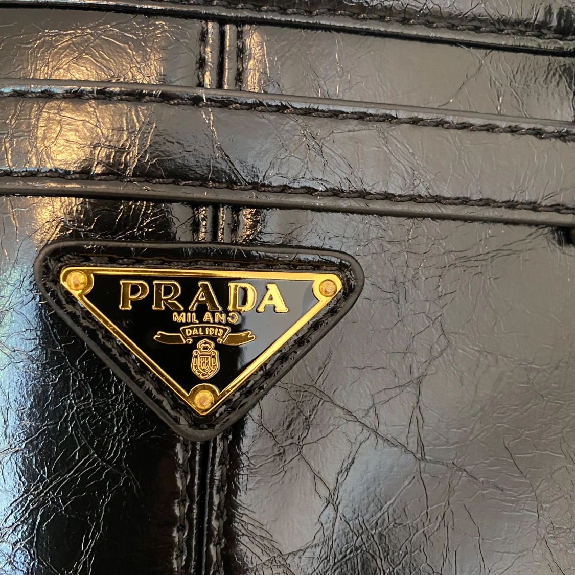 Snygg svart handväska från Prada i glansigt skinn med klassisk rektangulär form. Väskan har dubbla handtag, guldfärgade metalldetaljer och Pradas ikoniska trekantiga logga framtill. Insidan är fodrad med mönstrat tyg och har en elegant gulddetalj. Inte fast pris, kan diskuteras