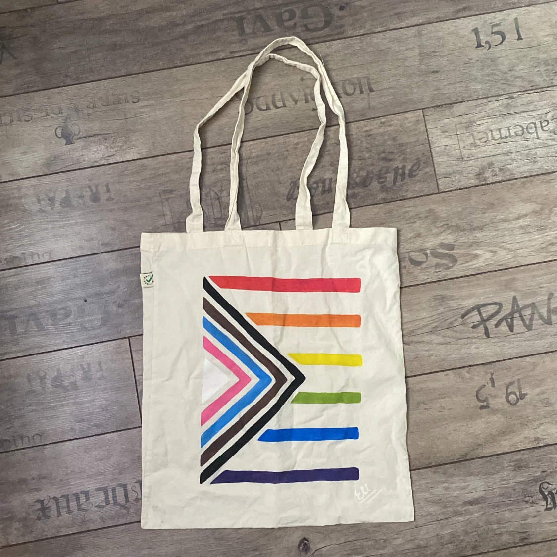 Hand målad typ påse, med progress flaggan som motiv. Påsen jag målat är från jordklok och är i måtten 37x40.