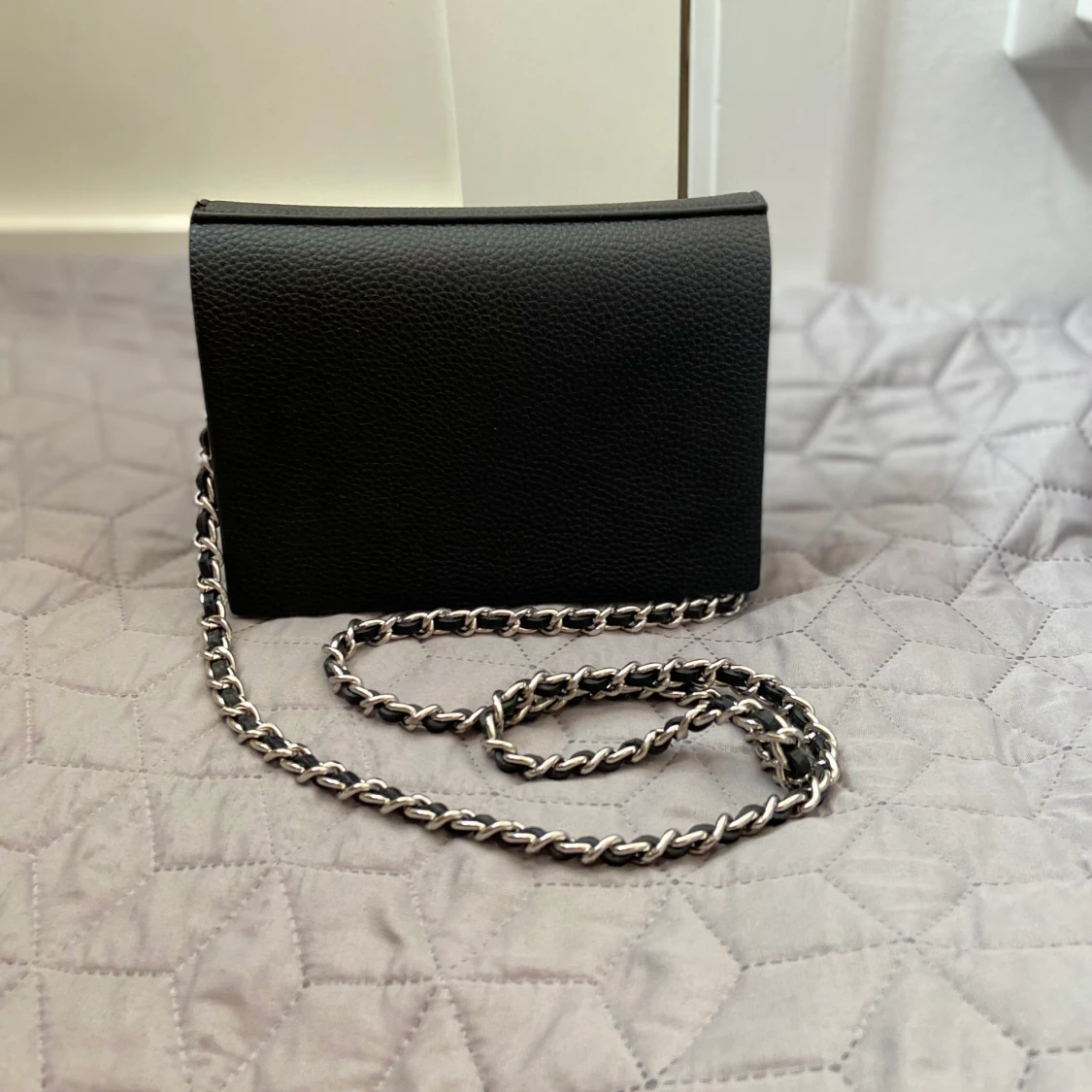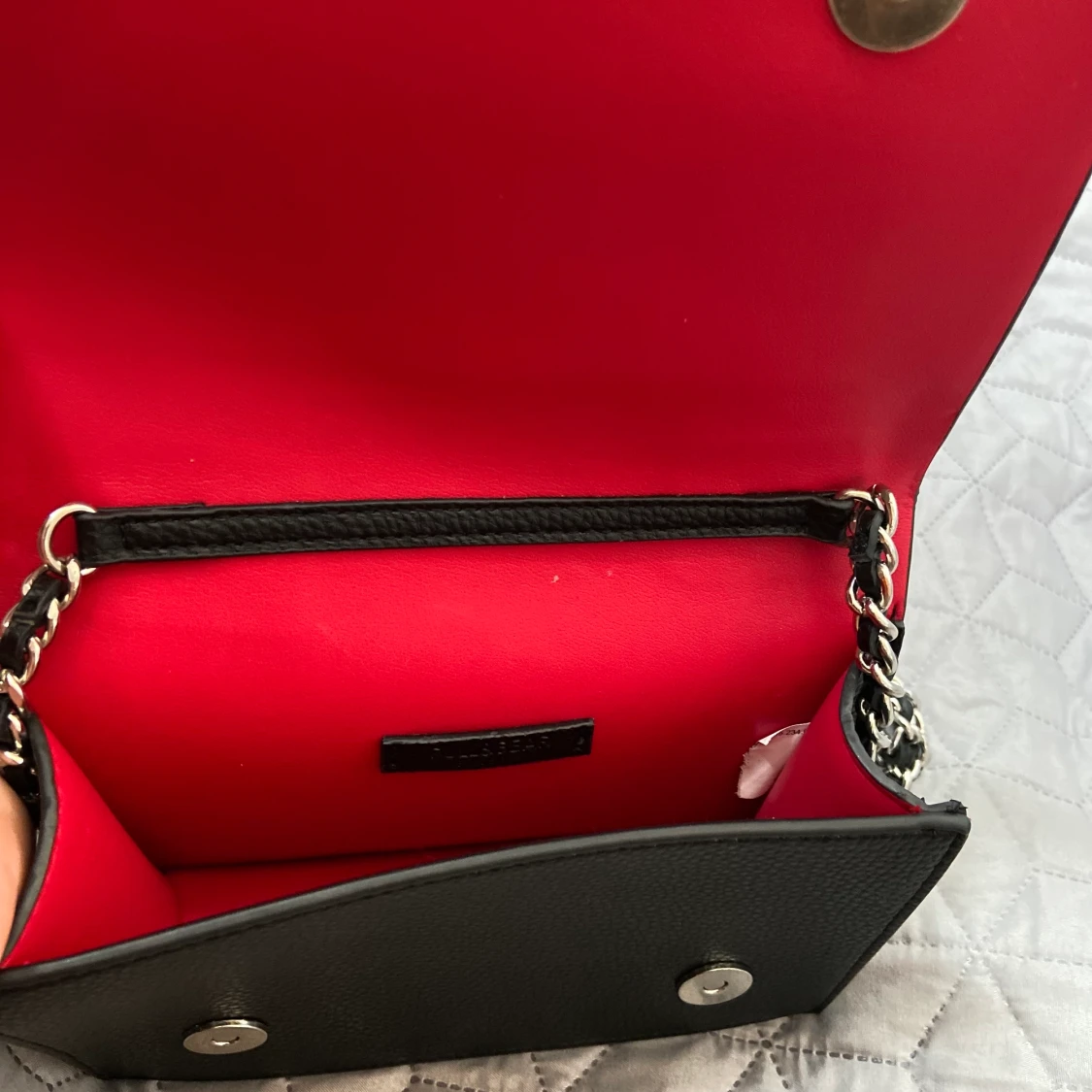 Mindre axelbandsväska i svart med röd insida. Väskan har ett axelband med silvriga detaljer. Använd bara vid 1 tillfälle, väldigt gott skick.