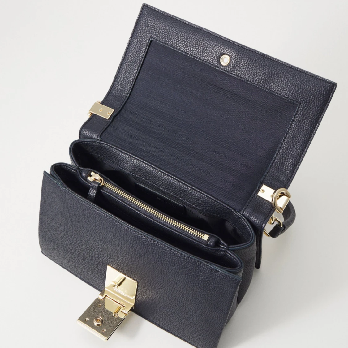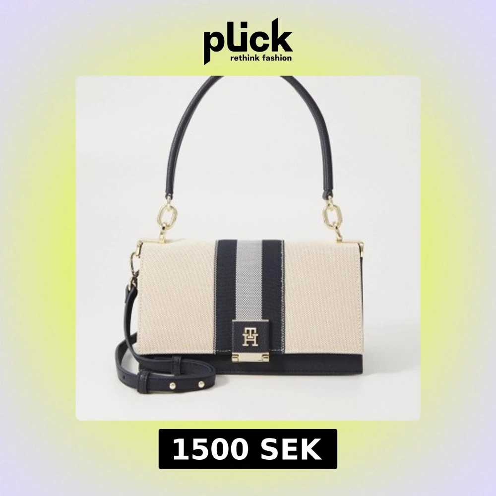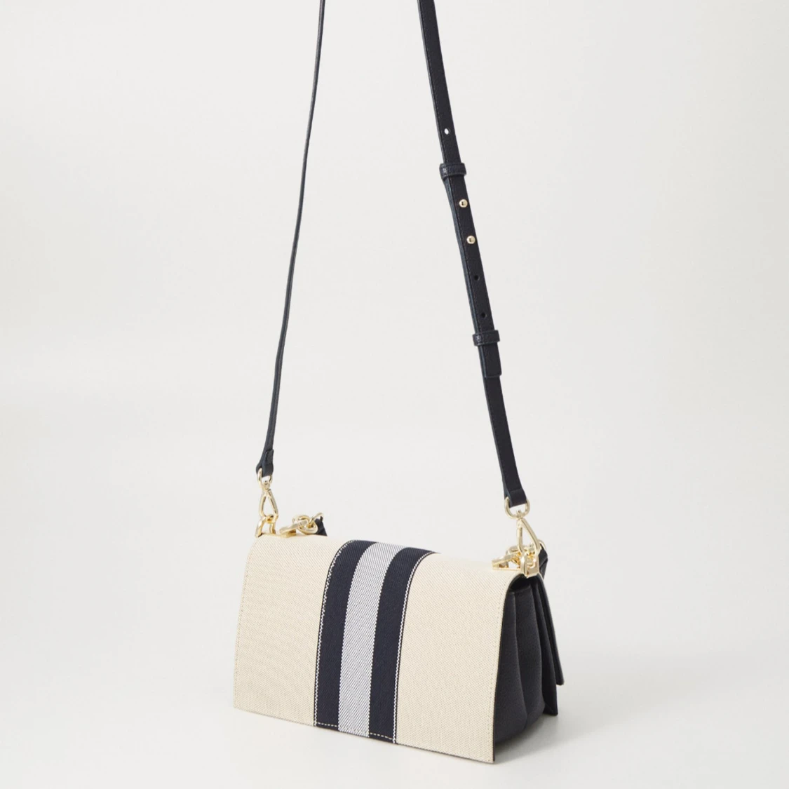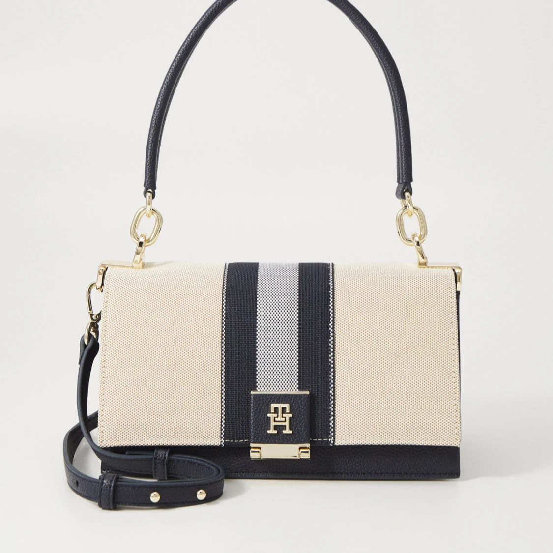 Snygg axelväska från Tommy Hilfiger i beige och marinblått med breda ränder och guldfärgade metalldetaljer. Väskan har både kort och lång axelrem, praktiskt fack med dragkedja och TH-logga framtill. Tillverkad i skinn och textil för en stilren look. Använd en gång dustbag och allt ingår.