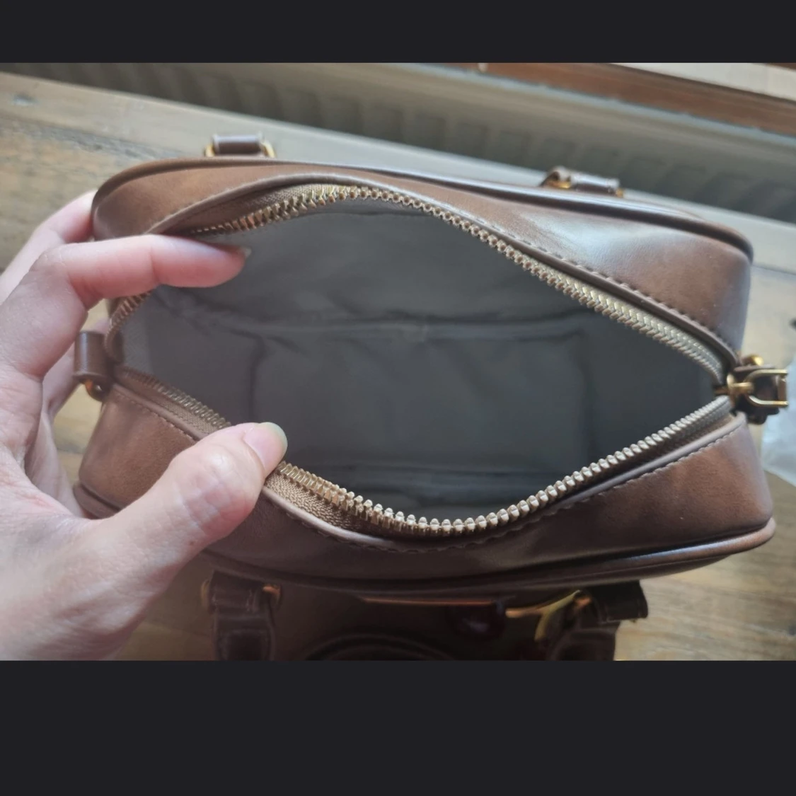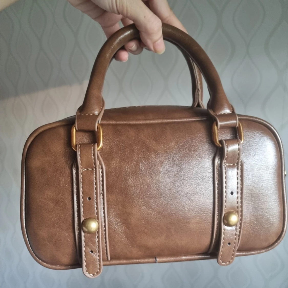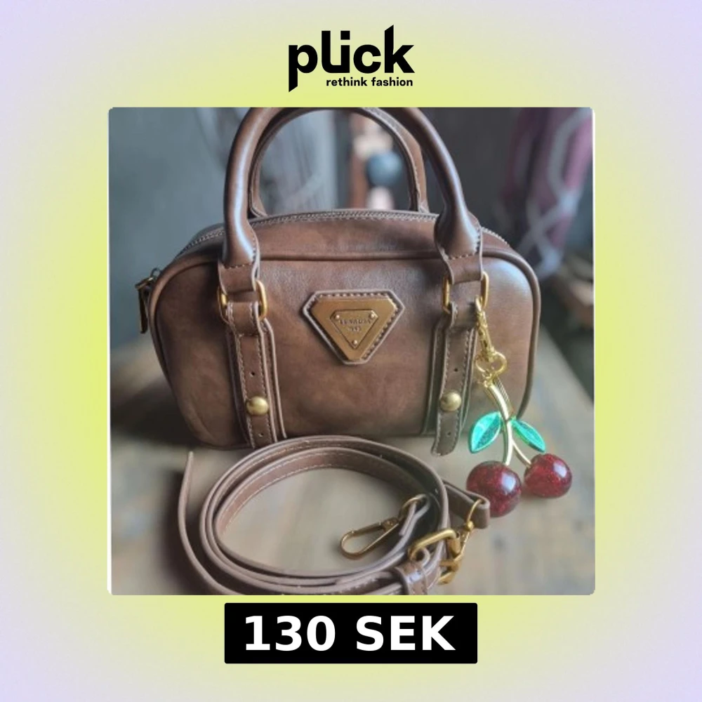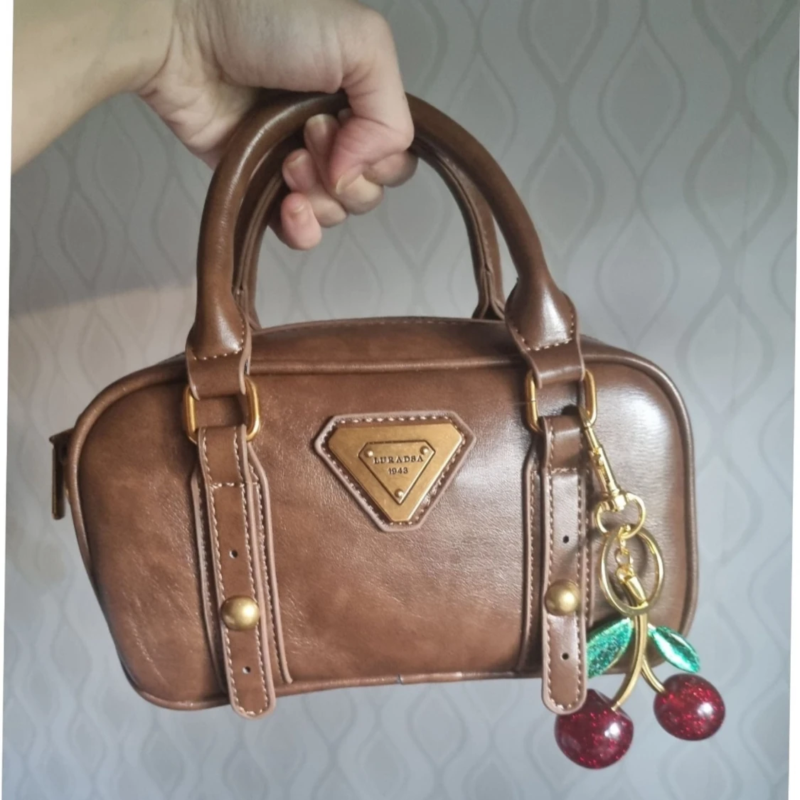 Retro brun handväska i pillow shape med handtag och avtagbar axelrem. Charmig körsbärsnyckelring ingår. Tillverkad i material av hög kvalitet PU läder som ger en känsla av äkta skinn. Endast använd en gång – i mycket gott skick. Mått: 12 x 21 x 8 cm. Axelrem är ungefär 95cm långt