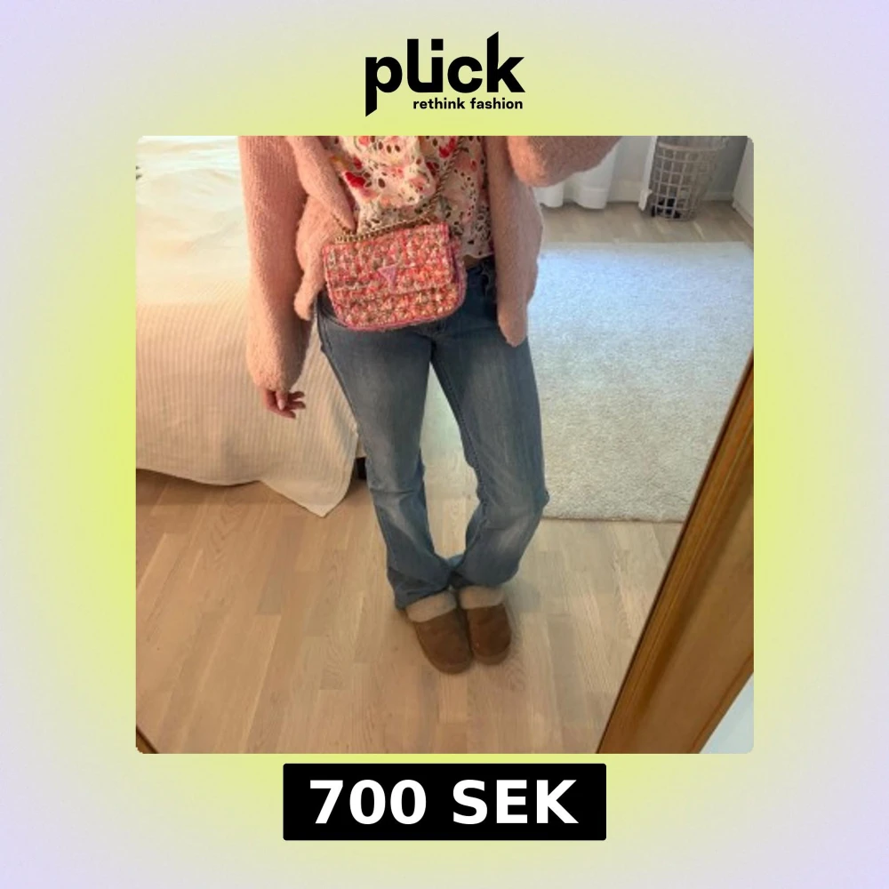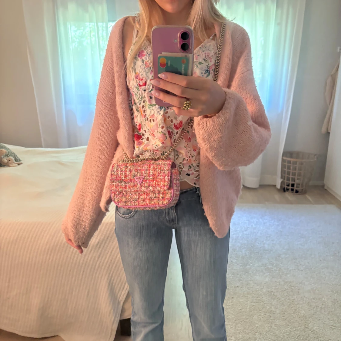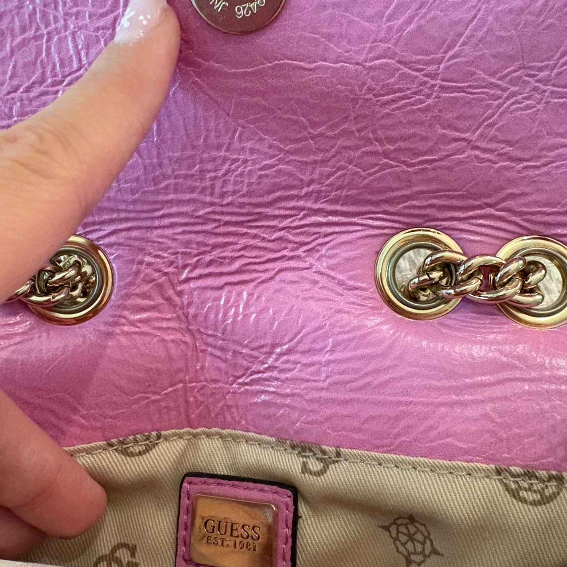 Superfin axelväska från Guess i rutigt tweedtyg med rosa, röda och beige toner. Väskan har guld kedja som man kan reglera till olika mått. Väskan är aldrig använd så den är helt ny🩷