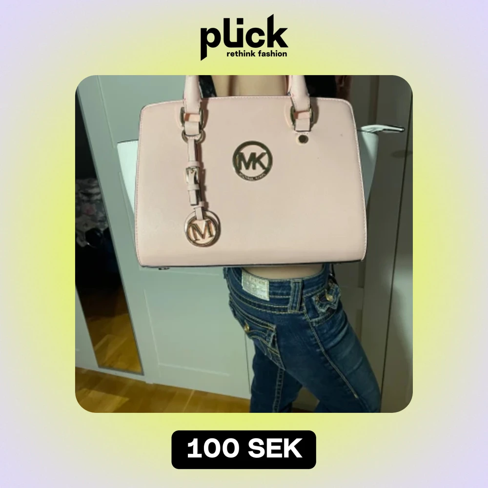 Säljer en snygg rosa handväska den e inte äkta Michael Kors. Väskan har en stilren design med ett stort MK-logotyp i guld på framsidan. Den har två handtag och en justerbar axelrem. Perfekt för både vardag och fest! 💖