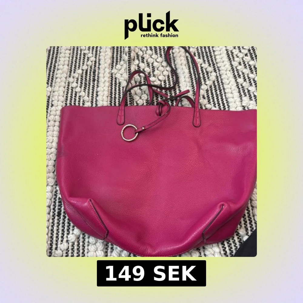 Stilren och rymlig shoppingväska i stark rosa färg med svarta detaljer. Väskan är tillverkad i mjukt skinn och har dubbla handtag samt en dekorativ metallring framtill. Insidan är svart och öppen utan fack, perfekt för att slänga ner allt du behöver.