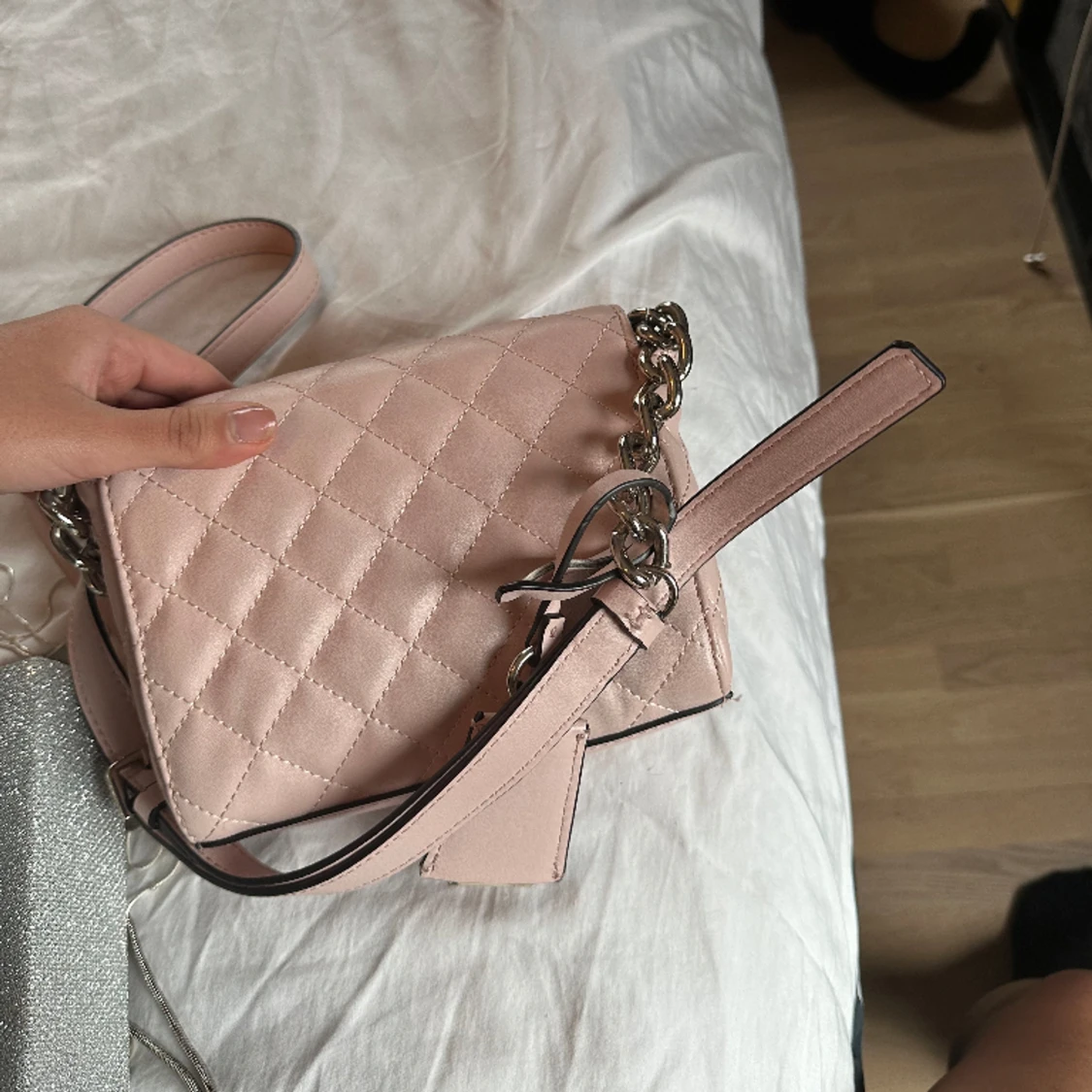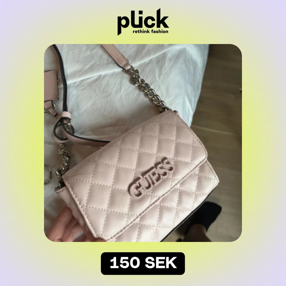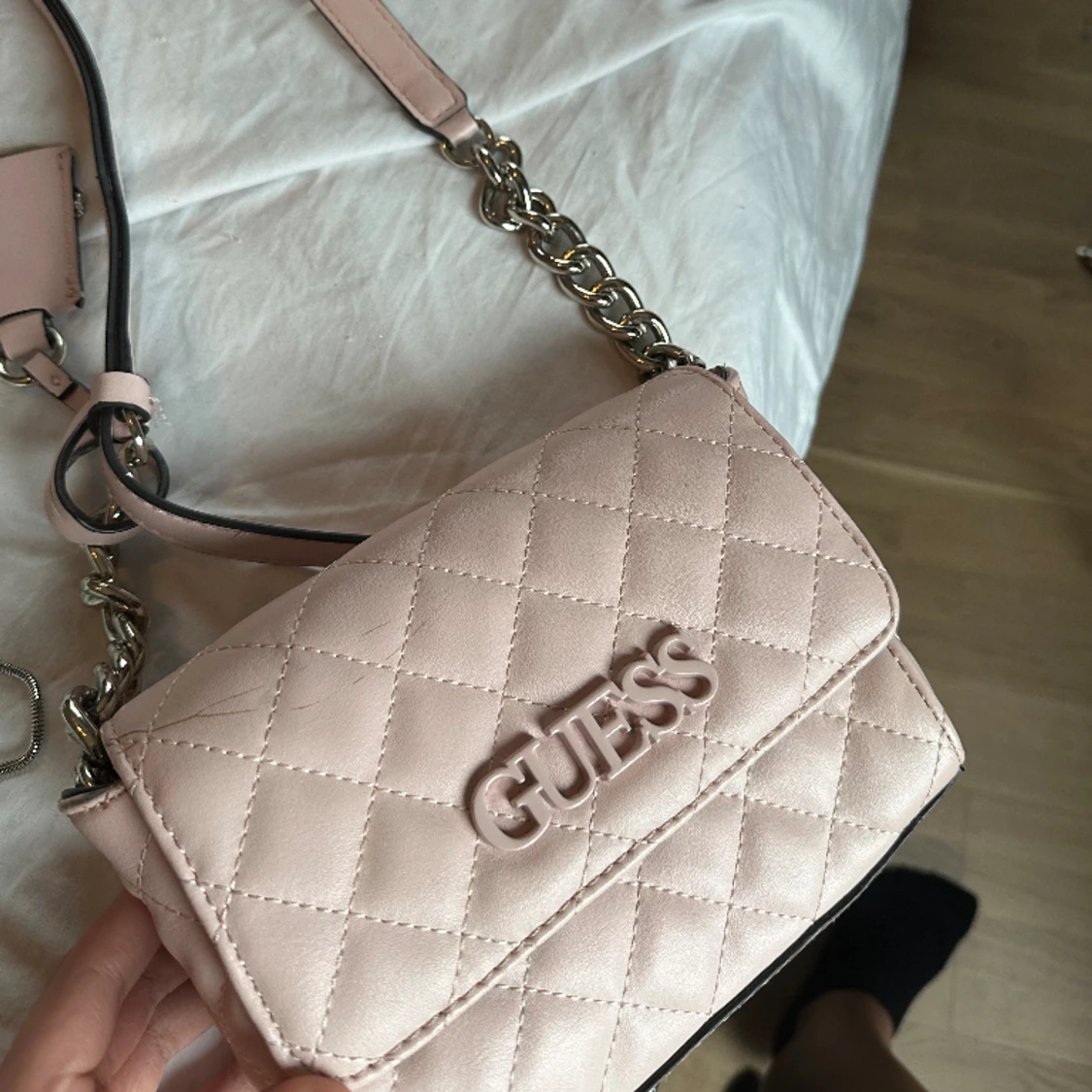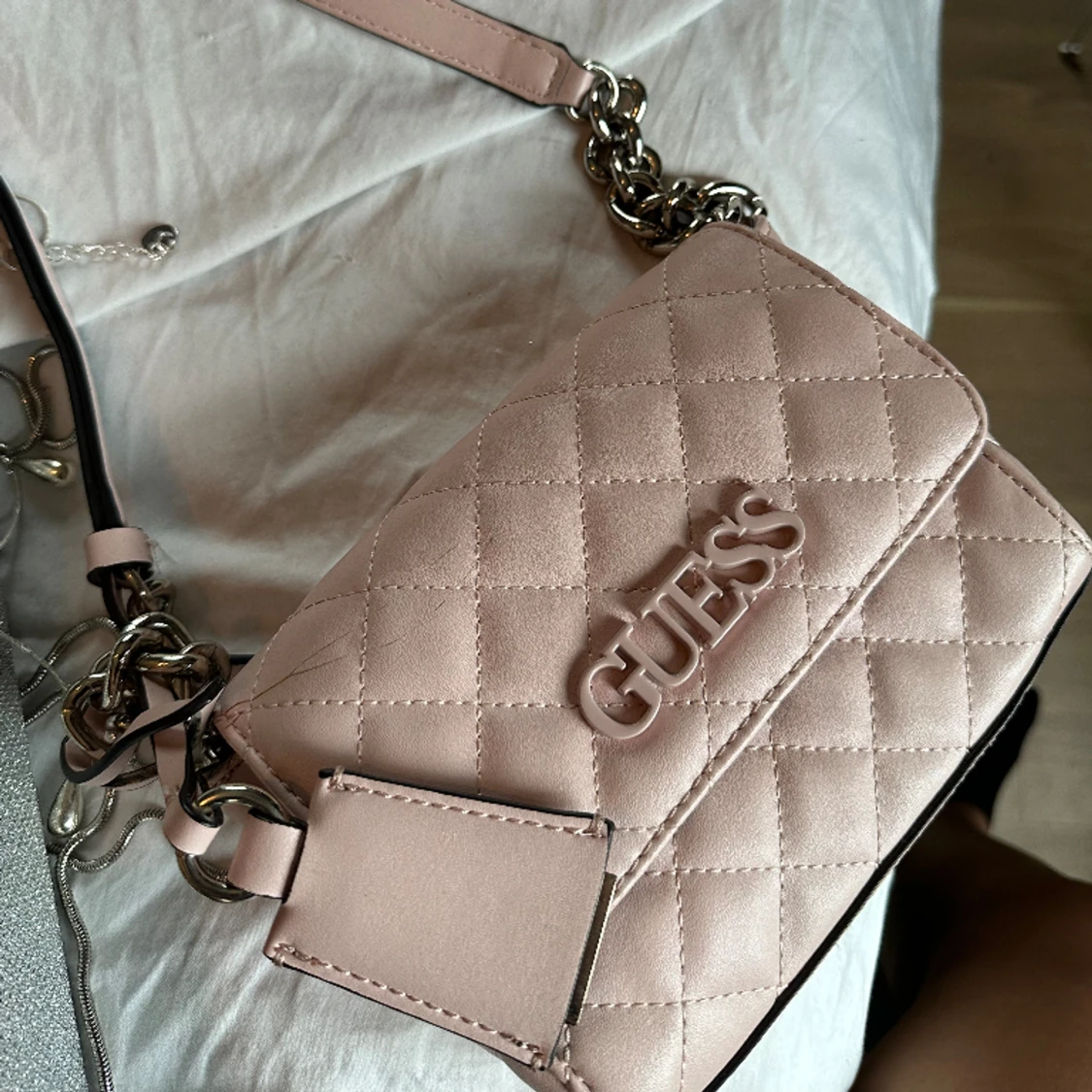 Söt handväska från Guess. Mer ljusrosa i färgen än bilden visar. Lite sliten, se första bilden.